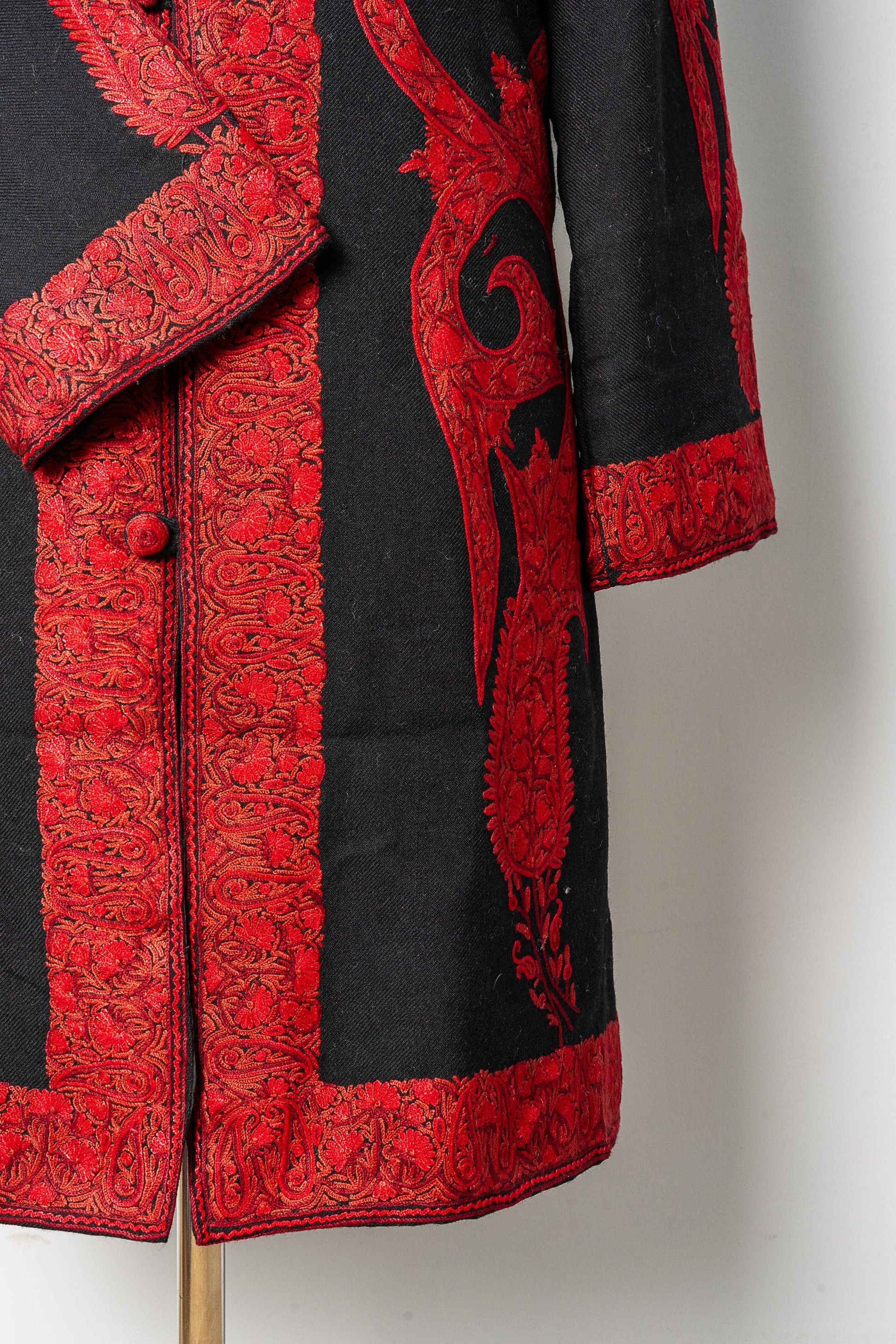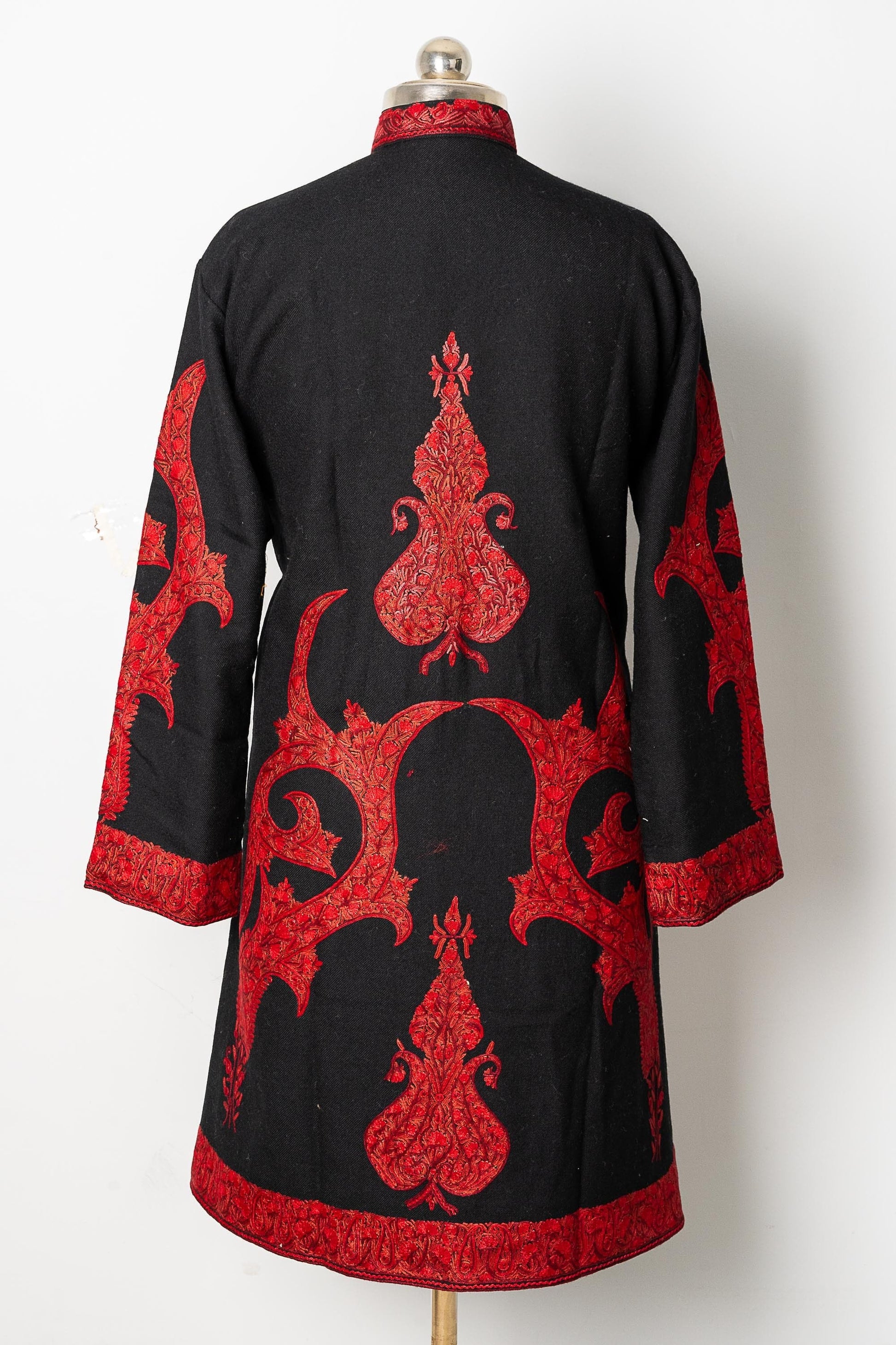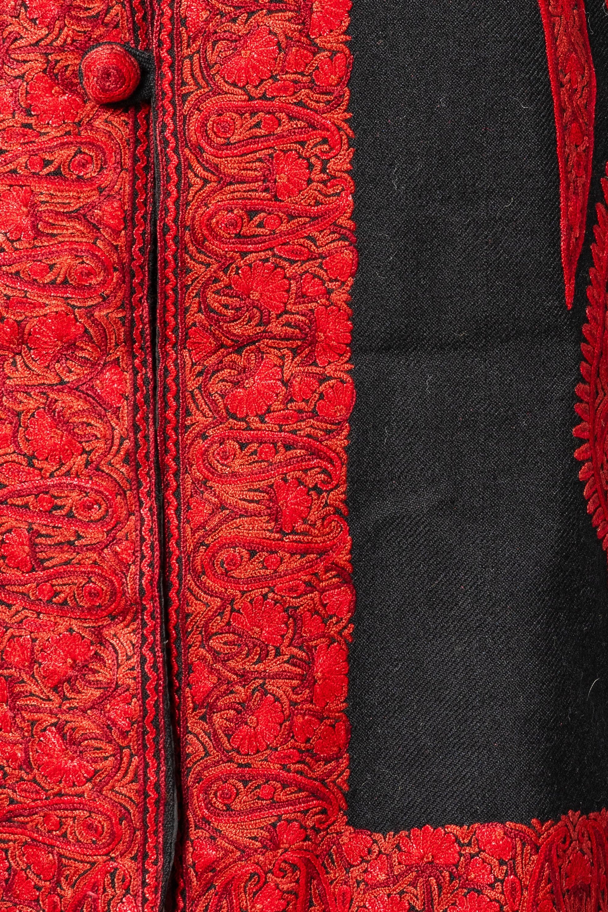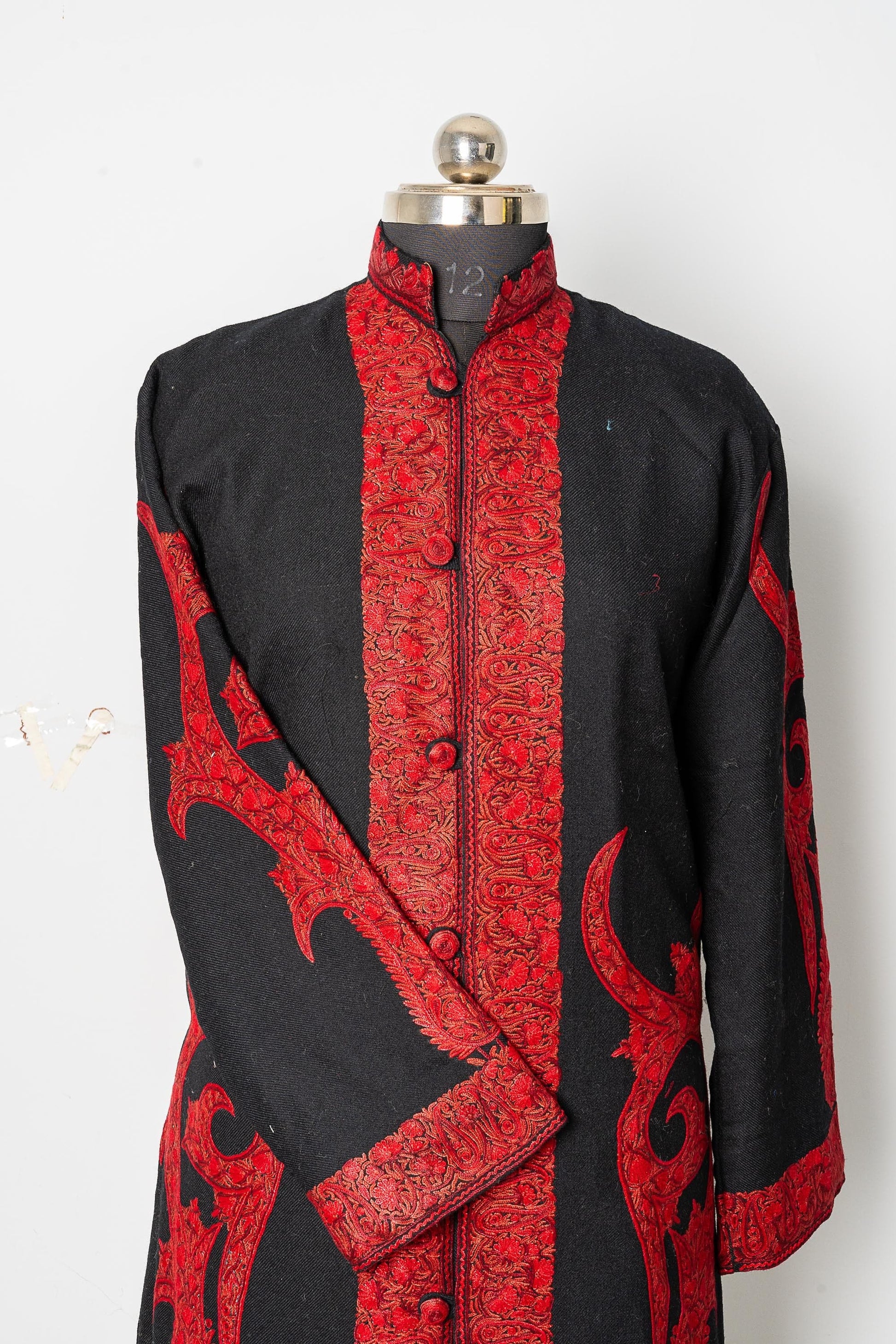 Bask in the magnificence of the "Jamali Midnight Elegance," a jacket that encapsulates the splendor of Kashmiri aari embroidery. With its delicate floral patterns meticulously stitched against a serene black backdrop, this piece is the epitome of handcrafted luxury.