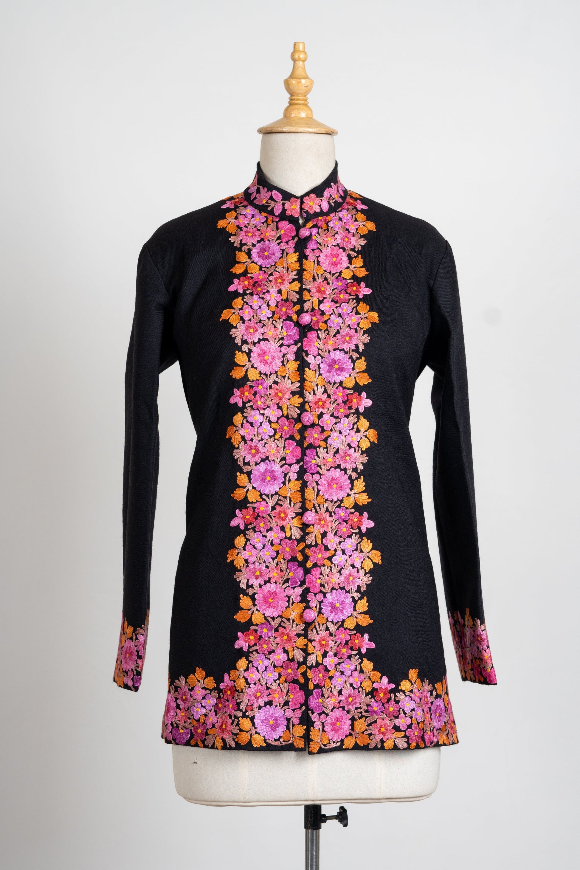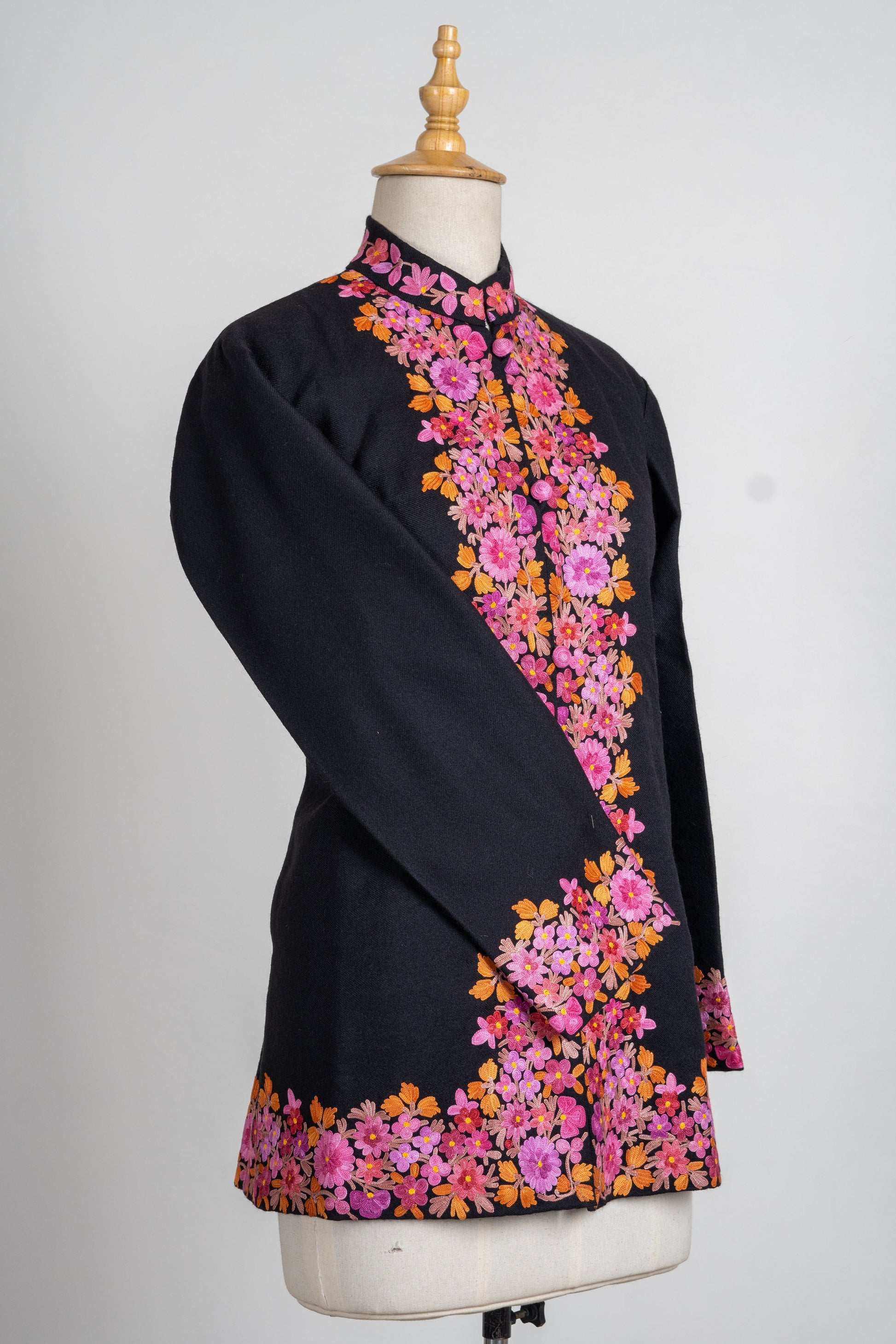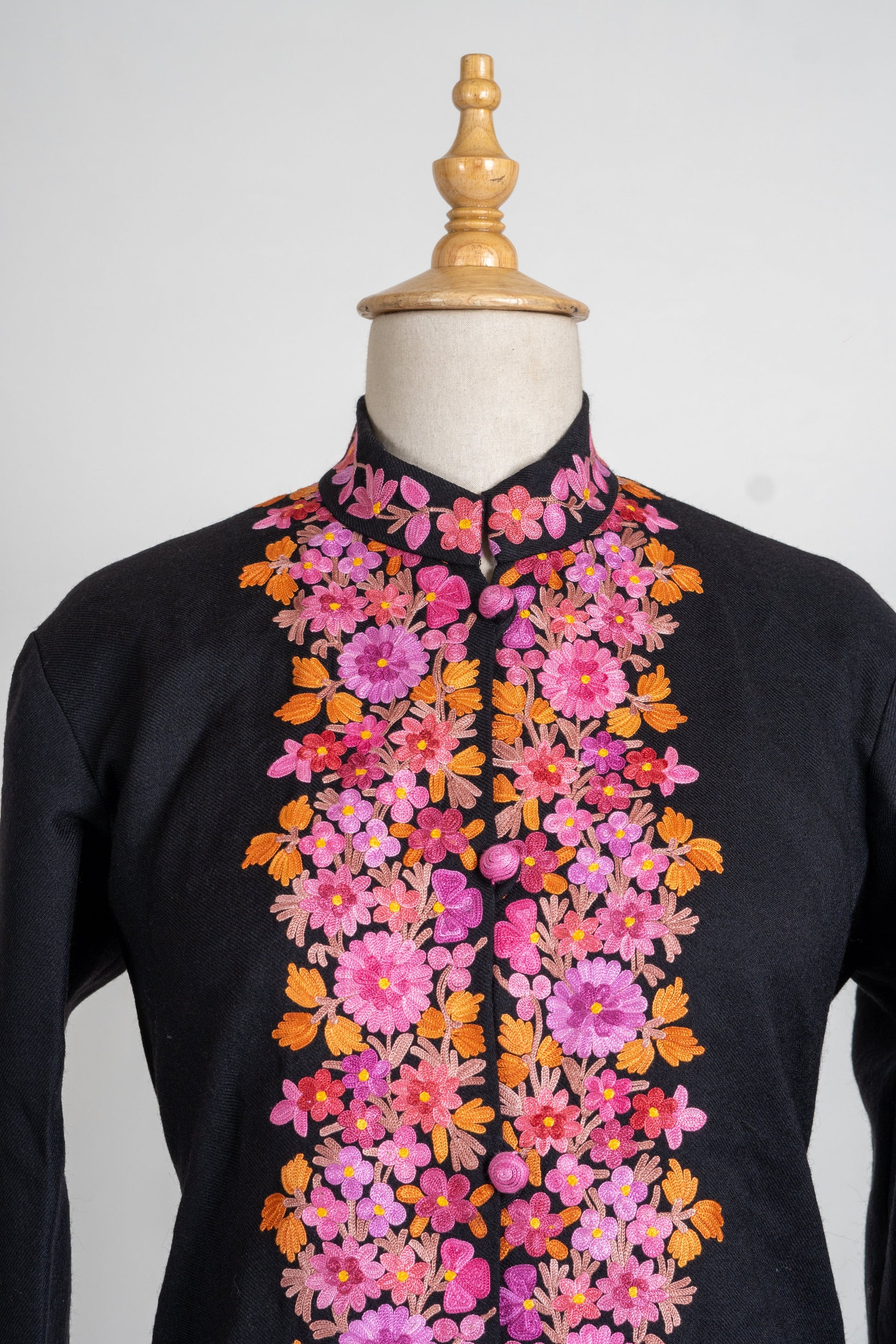 Step into the spotlight with this chic short Aari embroidered jacket, adorned with vibrant floral motifs in shades of pink, orange, and magenta. The embroidery, beautifully frames the front panel and cuffs, creating a delightful contrast against the deep black base. Perfect for adding a splash of color and elegance, this jacket showcases the delicate artistry of Kashmiri heritage.