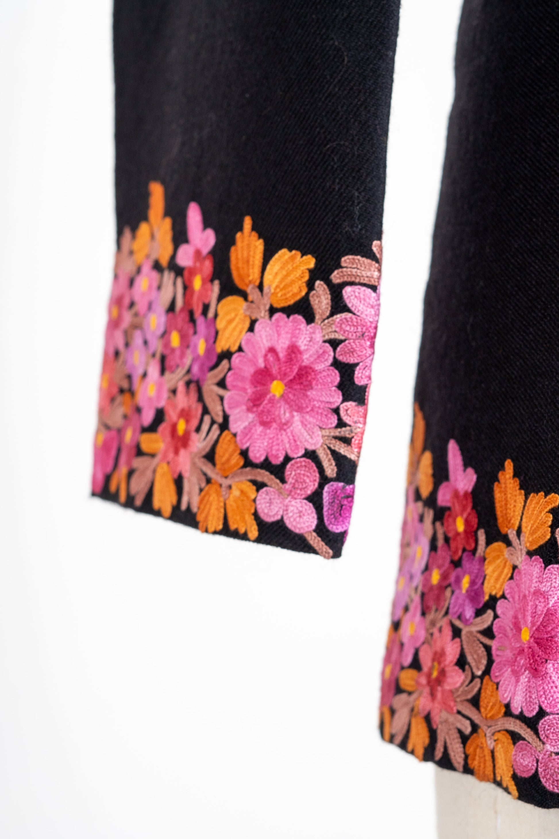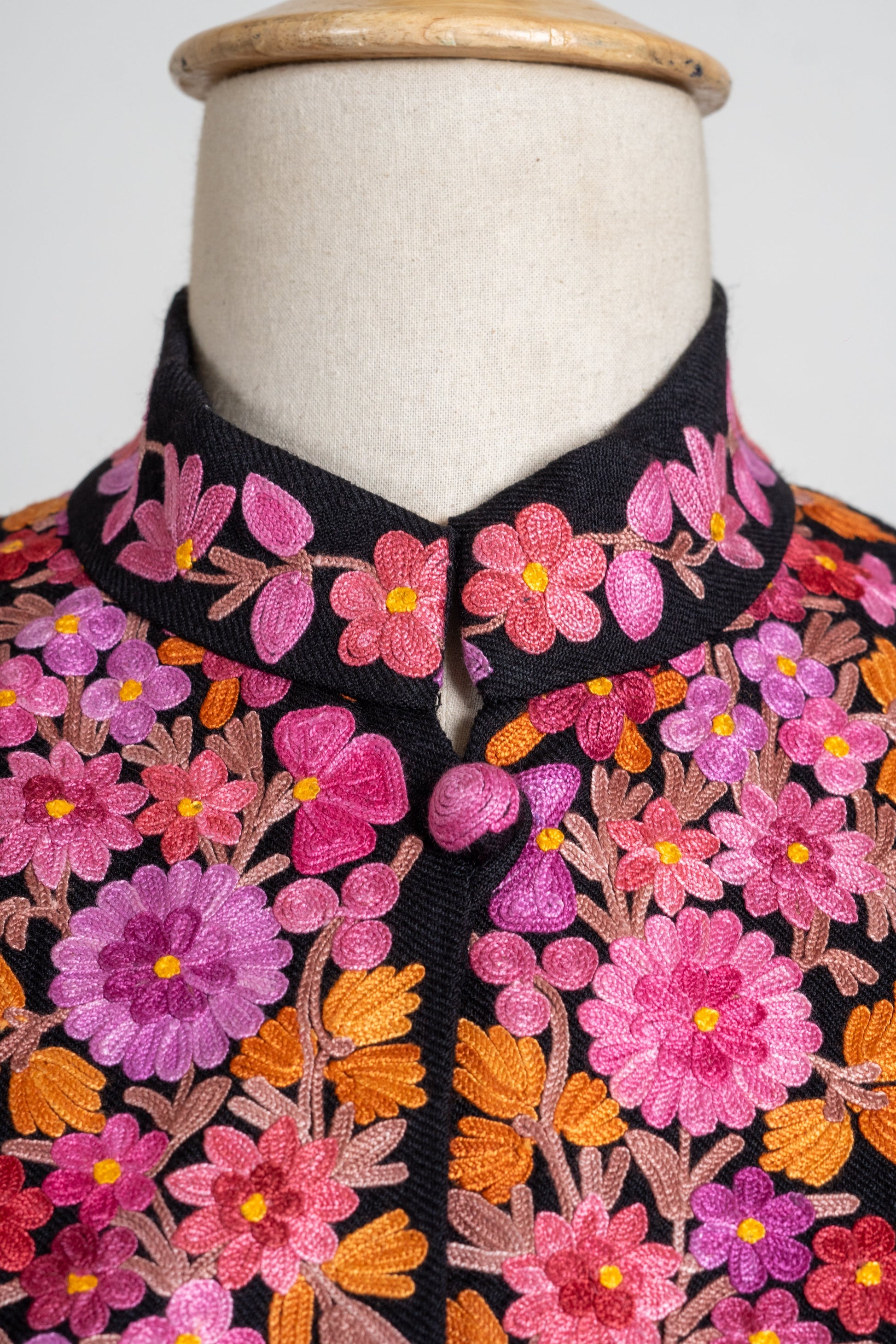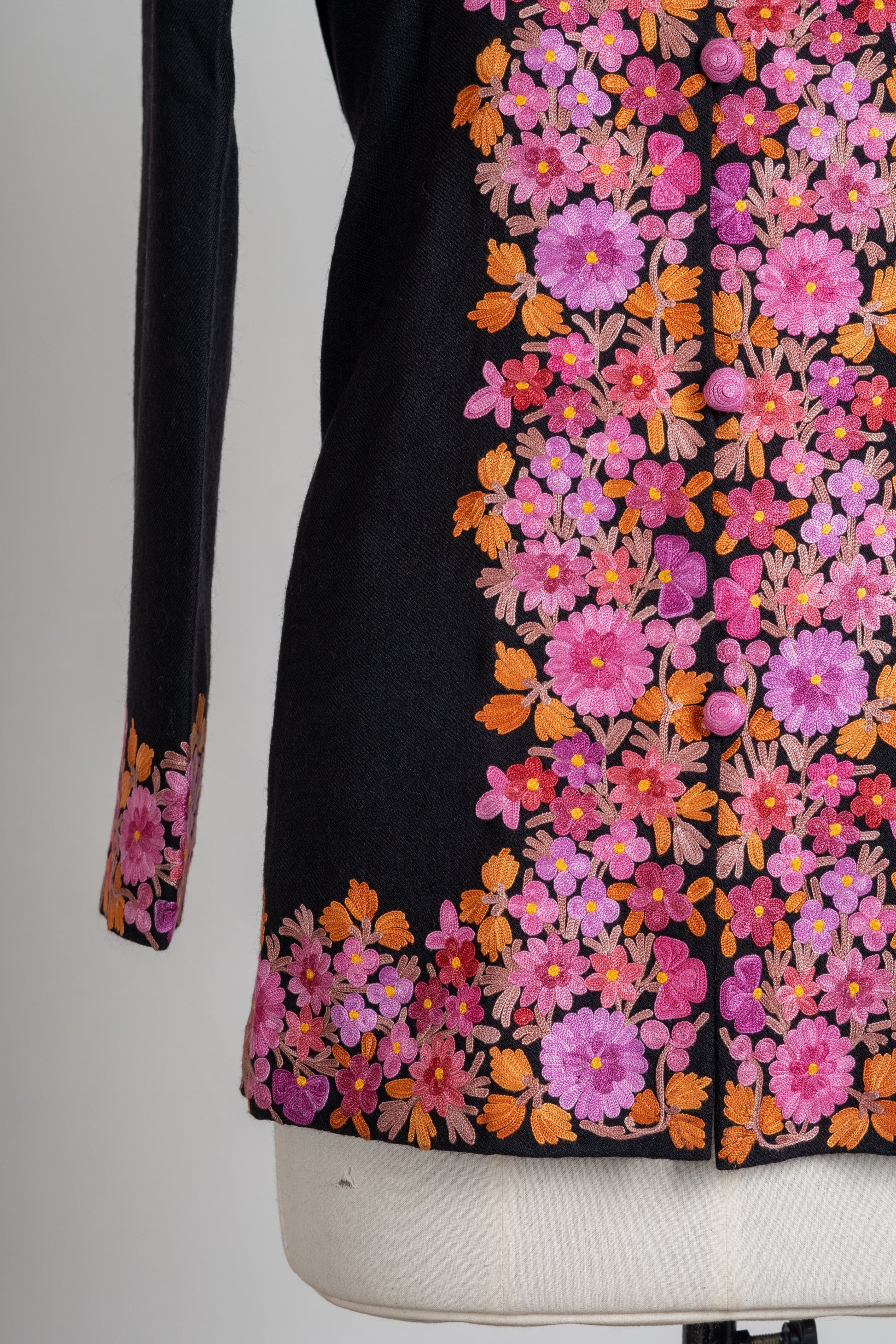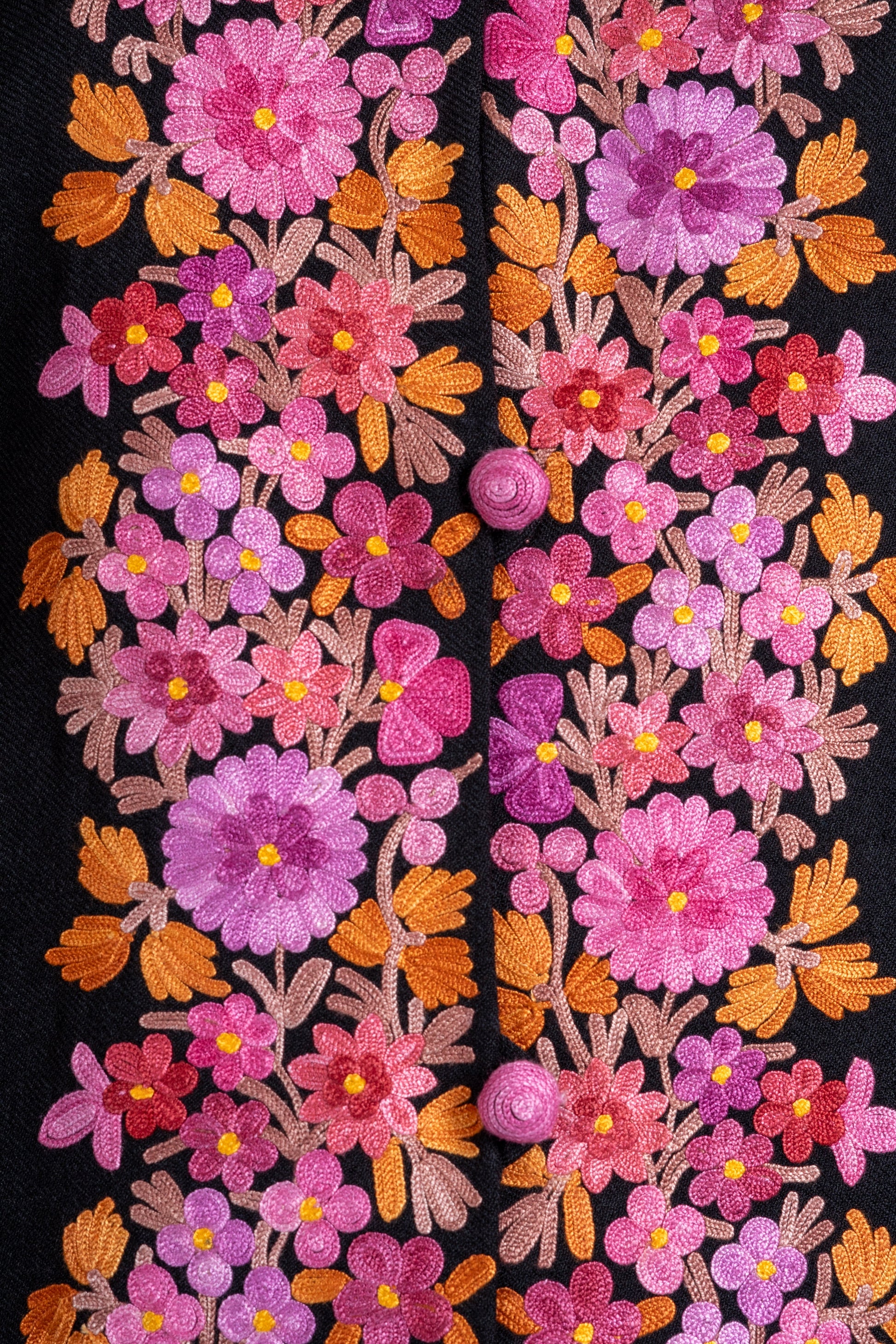 Step into the spotlight with this chic short Aari embroidered jacket, adorned with vibrant floral motifs in shades of pink, orange, and magenta. The embroidery, beautifully frames the front panel and cuffs, creating a delightful contrast against the deep black base. Perfect for adding a splash of color and elegance, this jacket showcases the delicate artistry of Kashmiri heritage.
