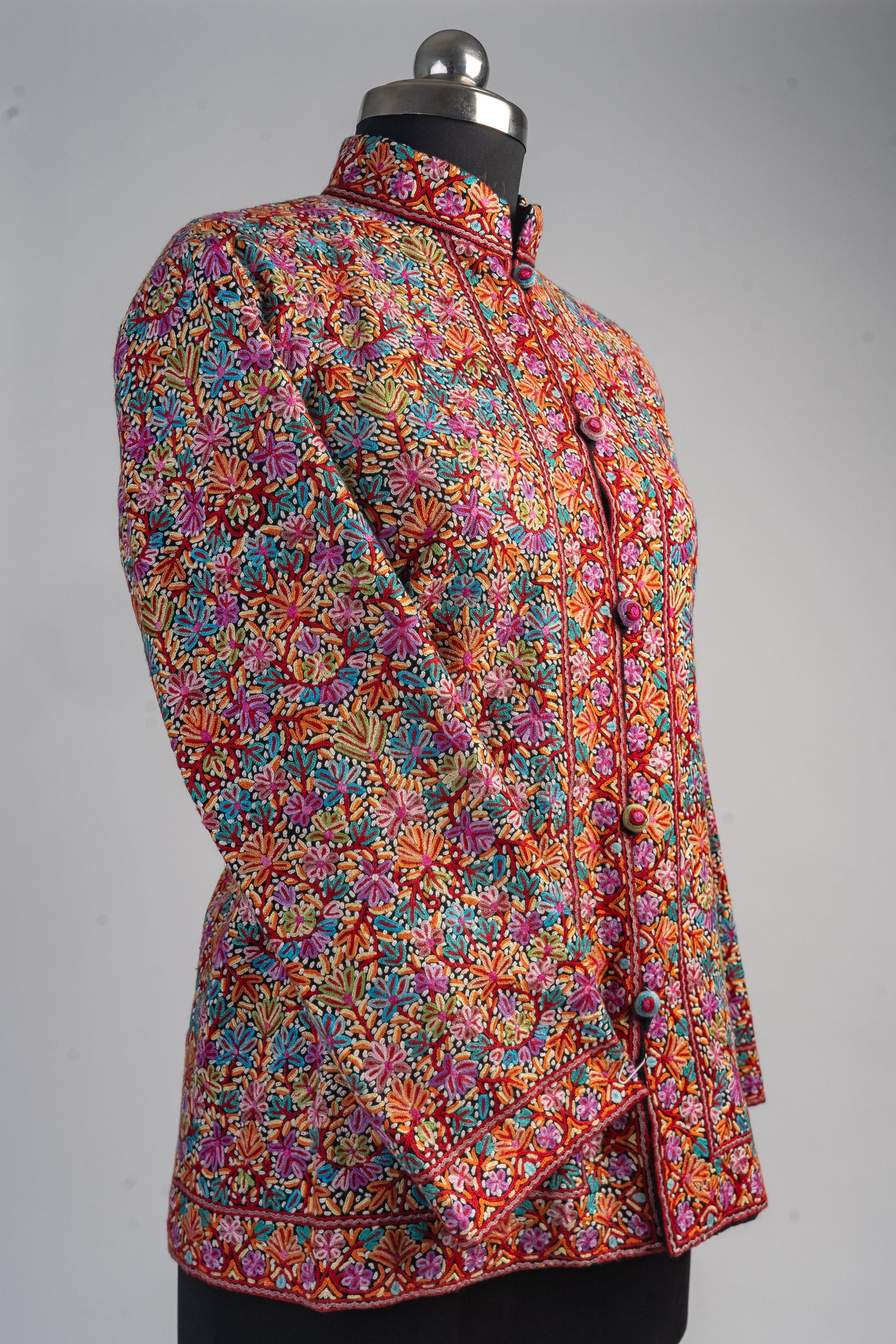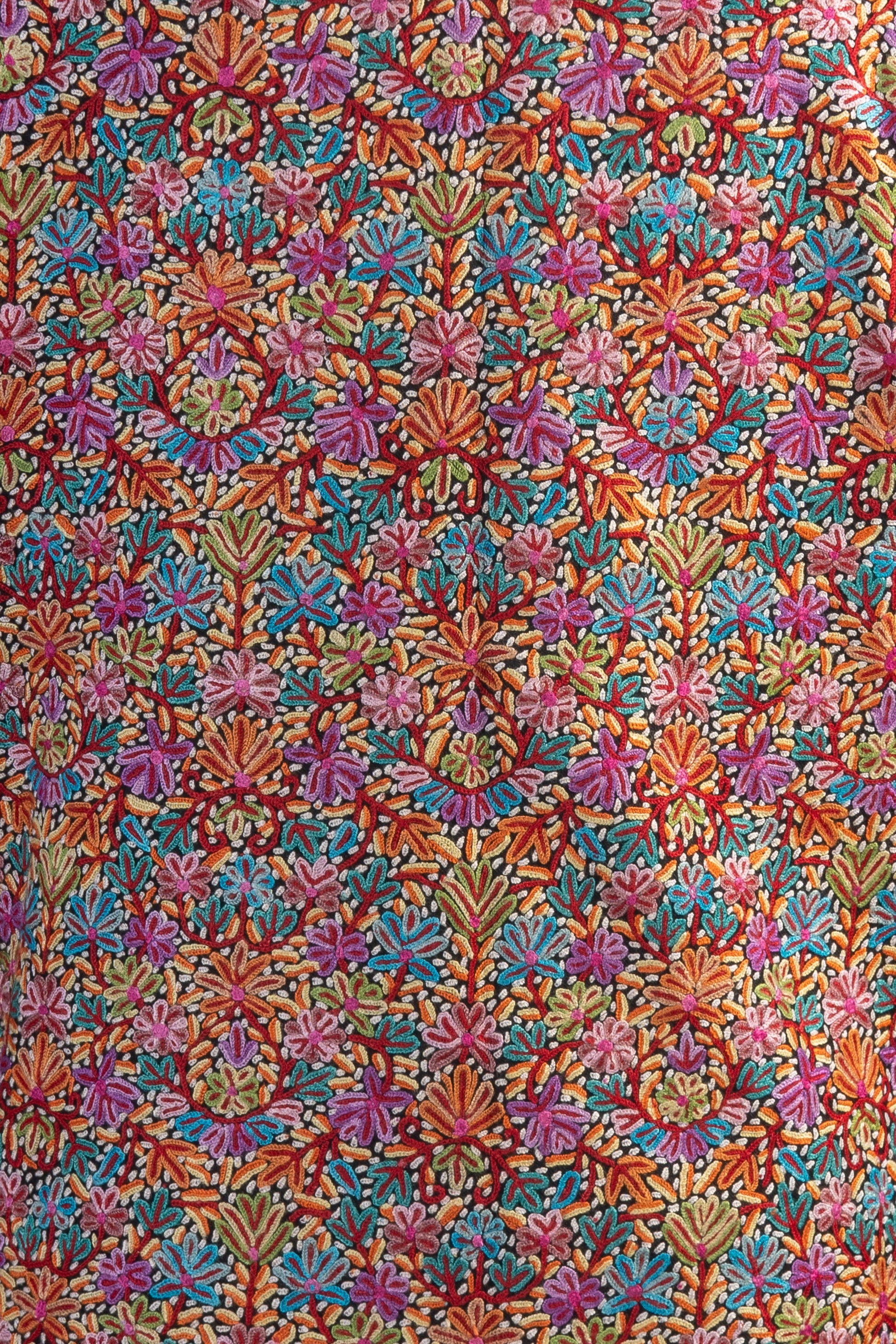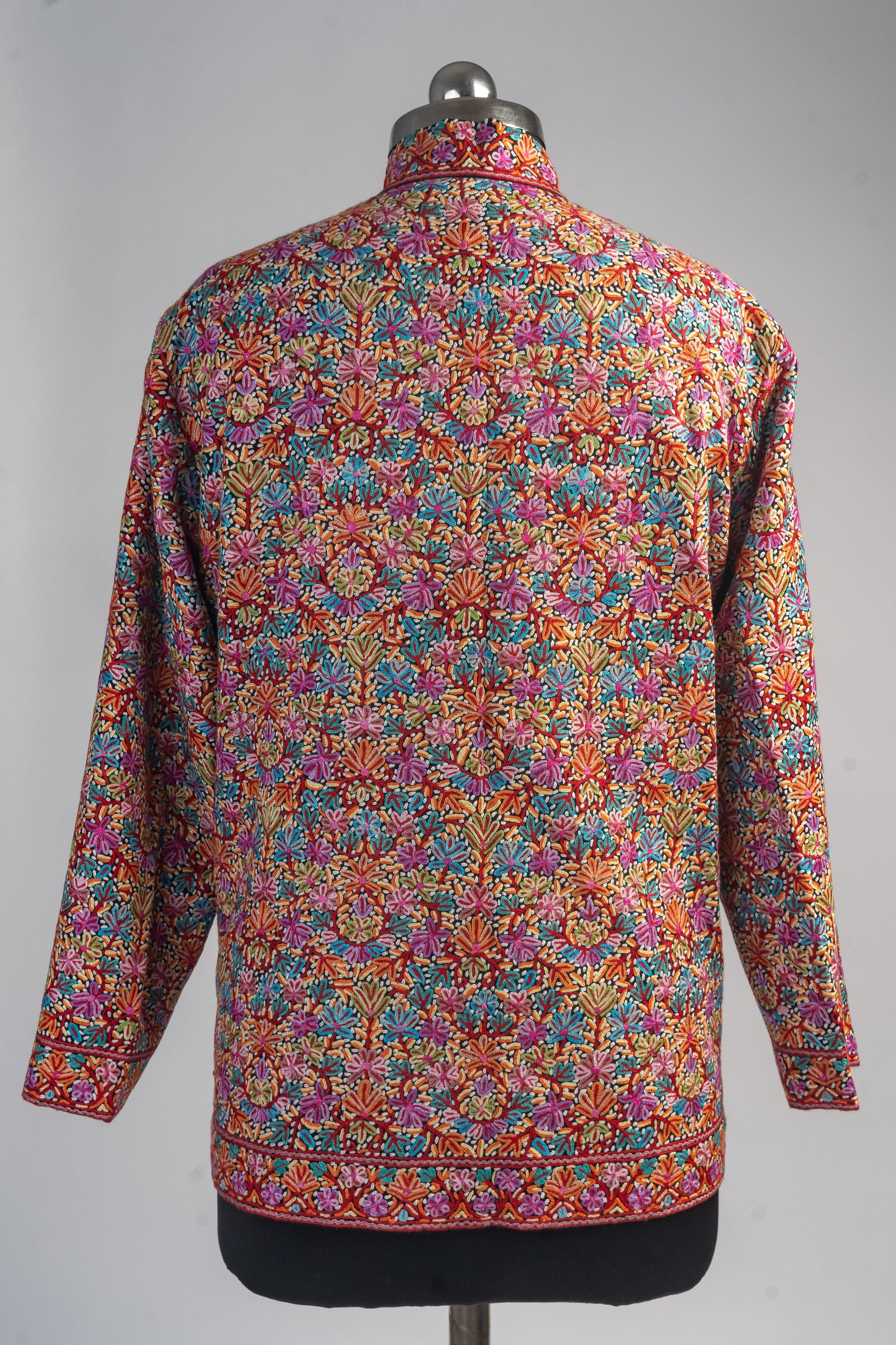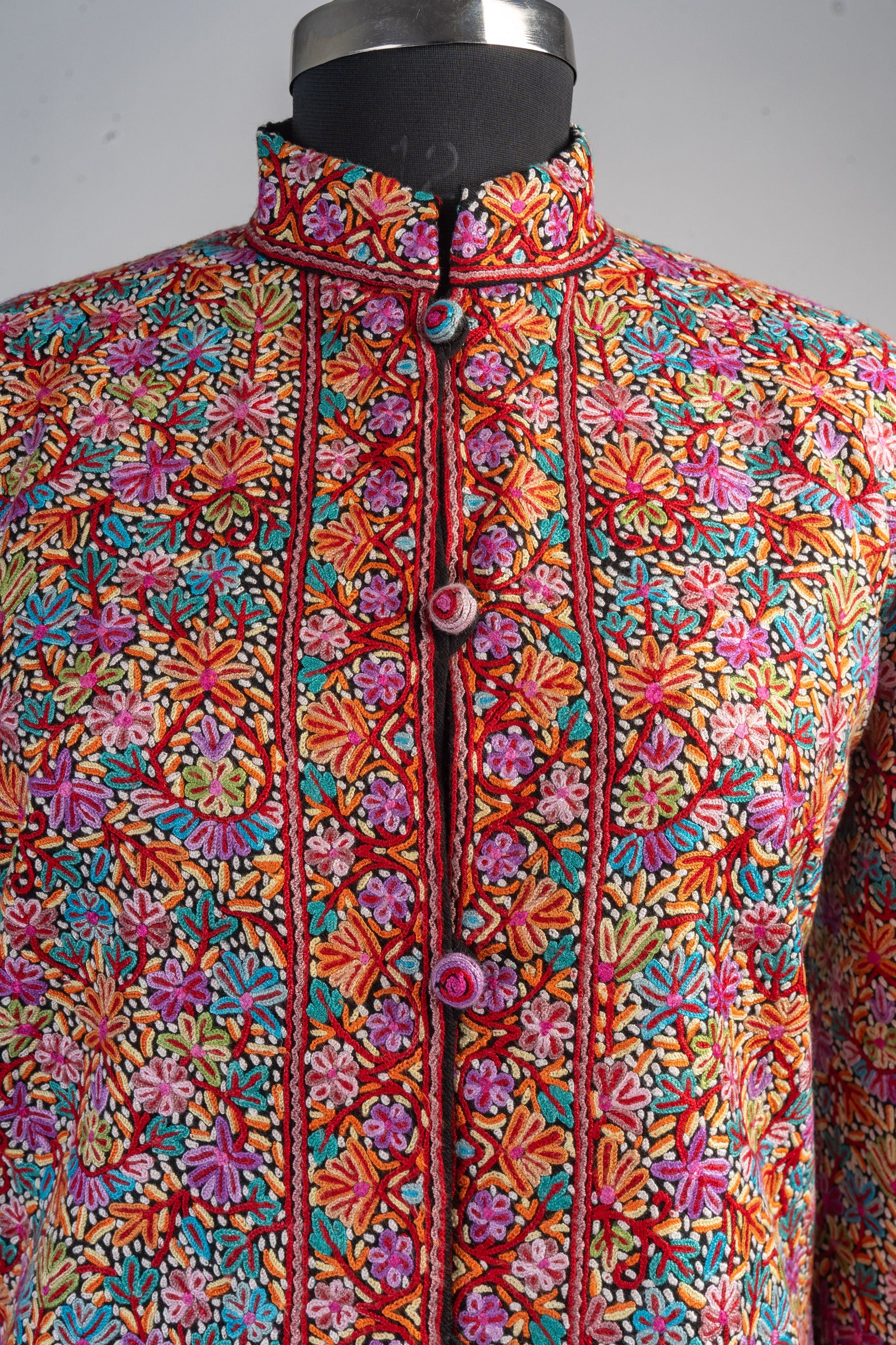 Immerse yourself in the breathtaking beauty of Kashmir with this exquisitely hand-embroidered Merino wool jacket. The delicate floral motifs, hand-stitched using the traditional Aari embroidery technique, feature intricate patterns of colorful blossoms that seem to come to life against the rich black background. The bright, contrasting embroidery wraps around the jacket, creating an eye-catching display of artistry that speaks to the craftsmanship of Kashmiri artisans.