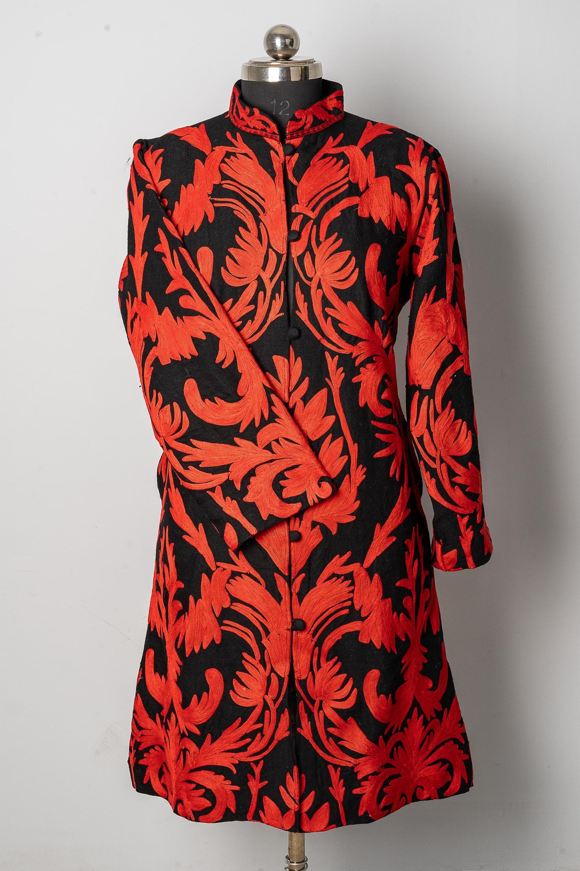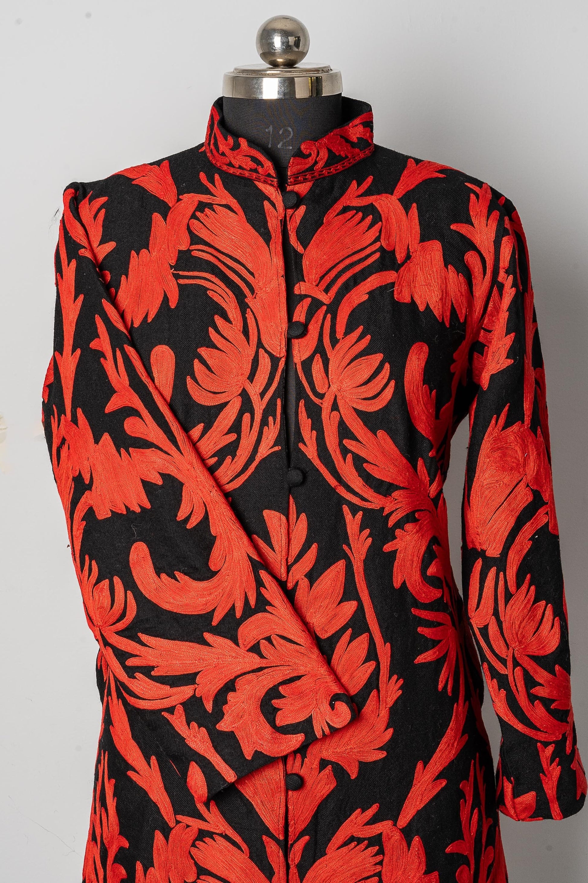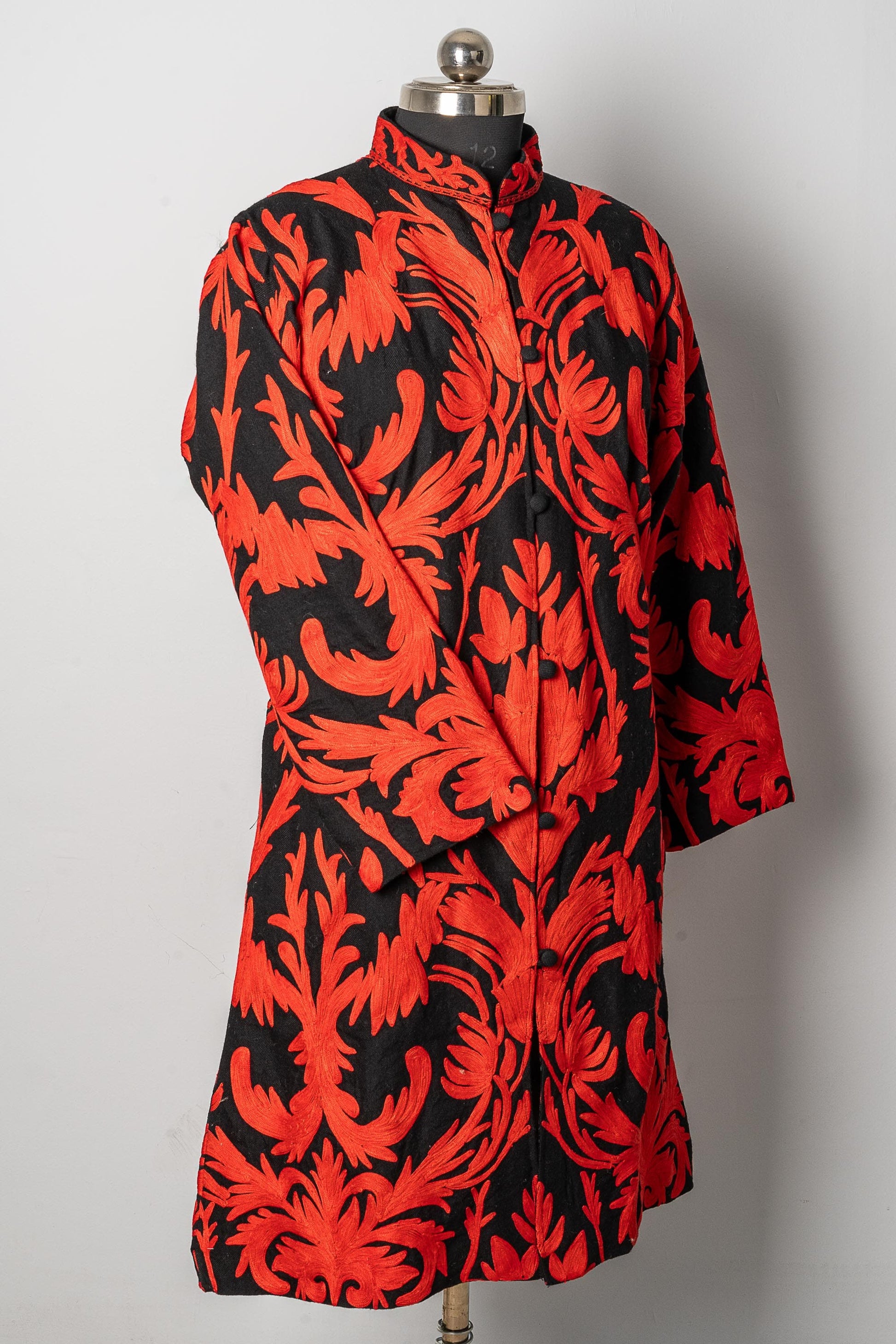Elevate your wardrobe with KashmKari's Kashmiri jacket, where tradition meets modernity. This black jacket, adorned with vibrant red Aari embroidery, showcases an exquisite floral pattern over its entirety. Whether paired with casual denim or a formal outfit, this jacket is a statement piece, adding a touch of elegance and cultural charm to any ensemble.