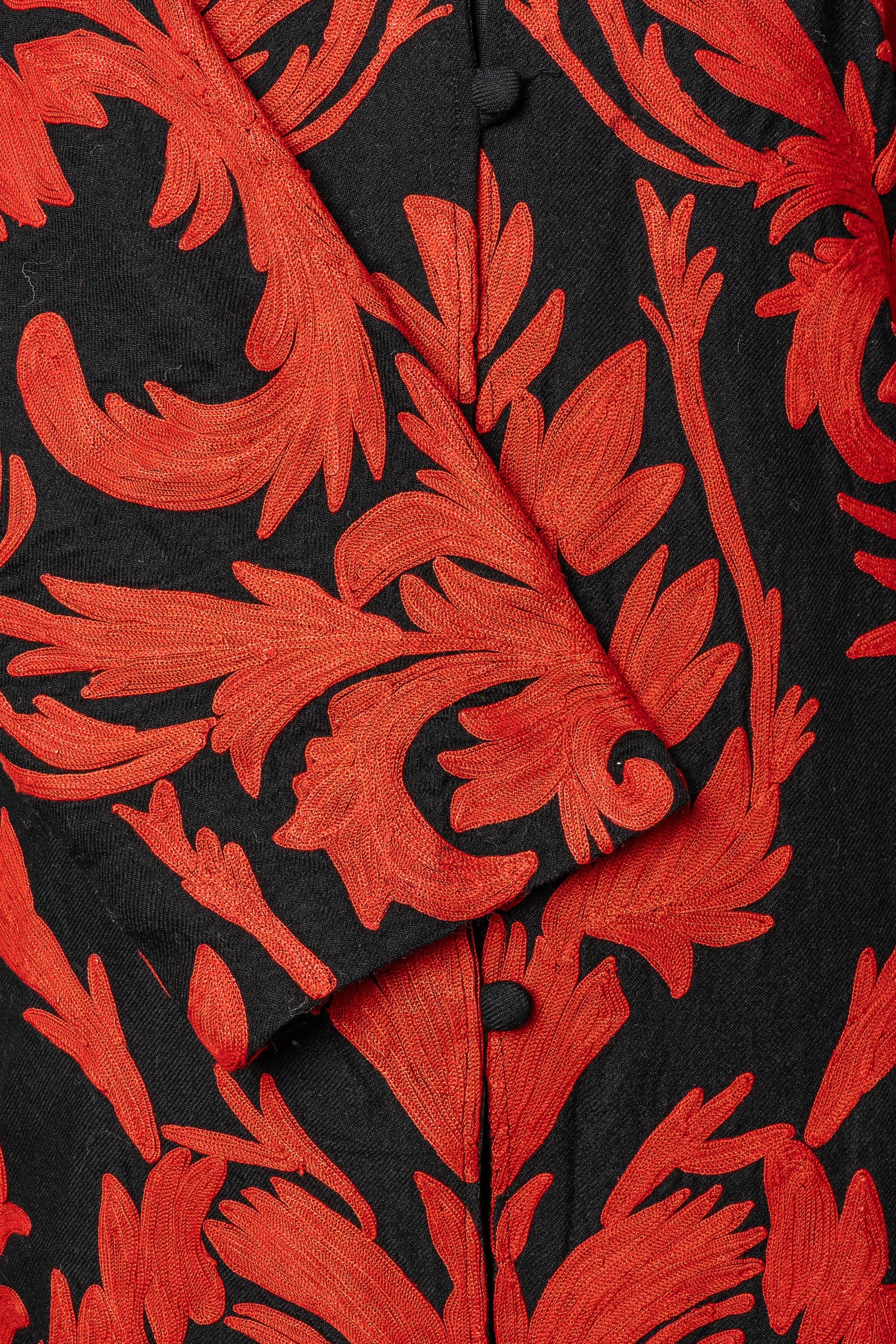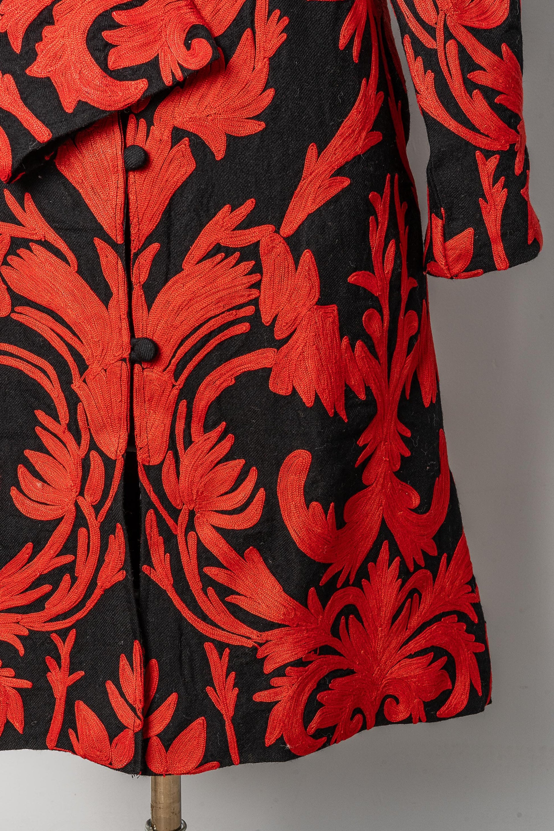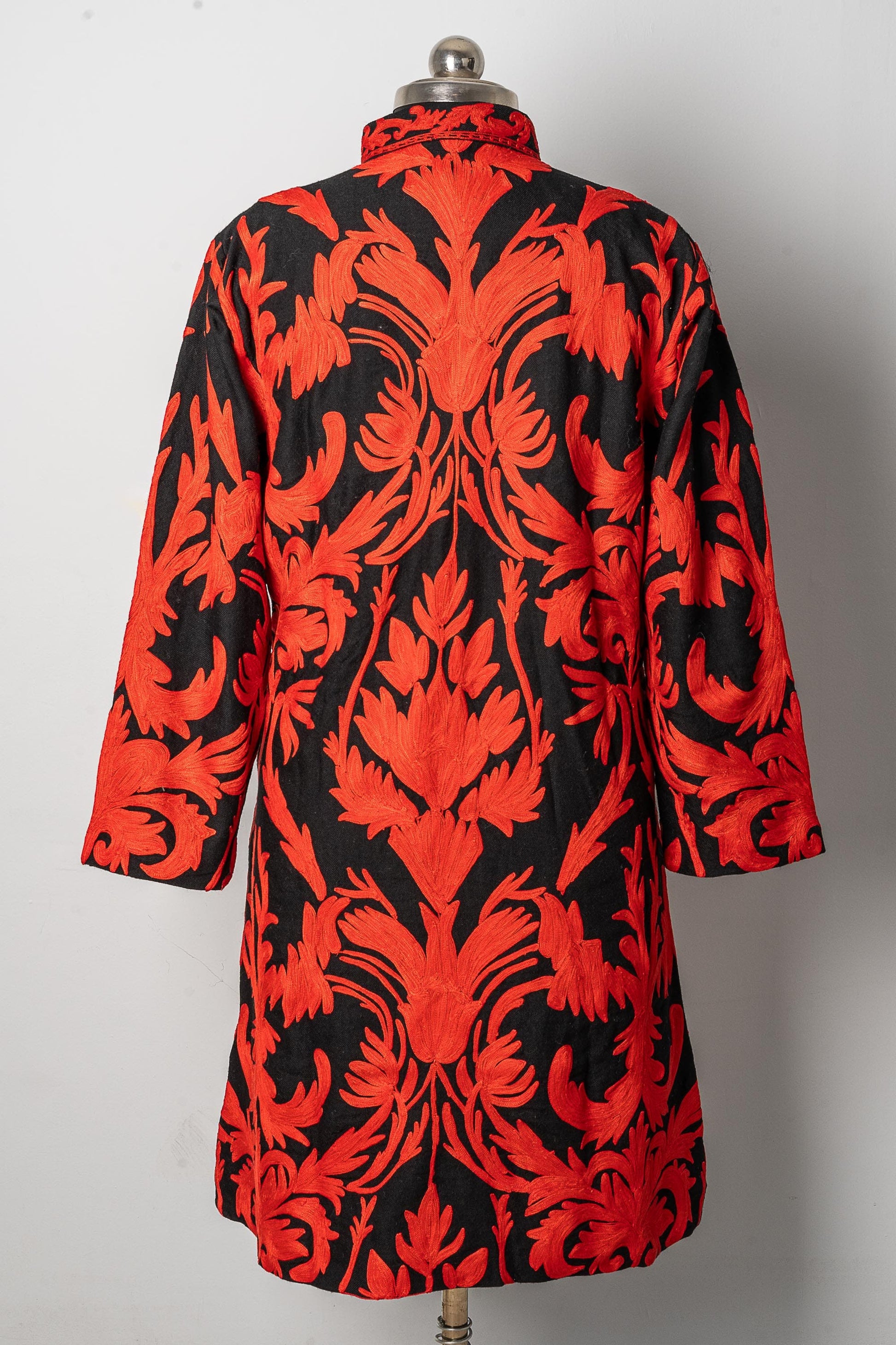Elevate your wardrobe with KashmKari's Kashmiri jacket, where tradition meets modernity. This black jacket, adorned with vibrant red Aari embroidery, showcases an exquisite floral pattern over its entirety. Whether paired with casual denim or a formal outfit, this jacket is a statement piece, adding a touch of elegance and cultural charm to any ensemble.