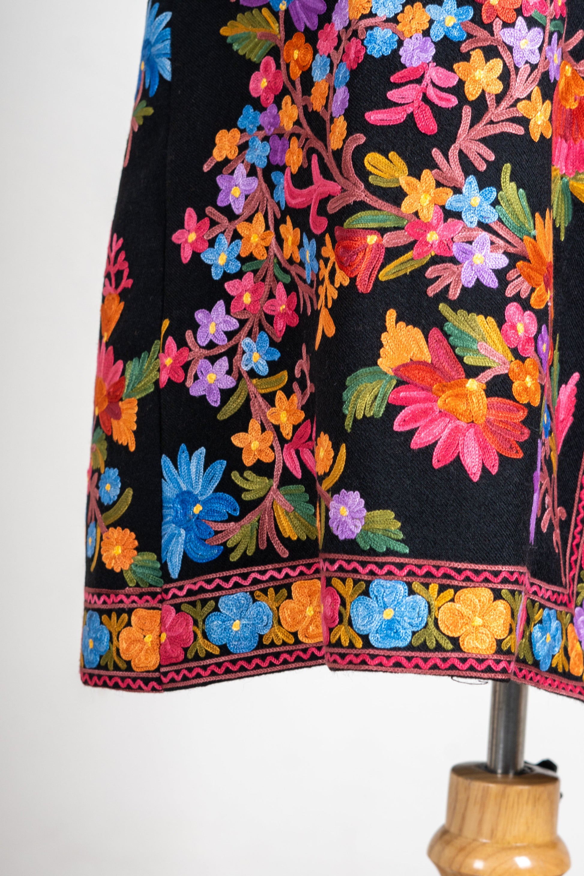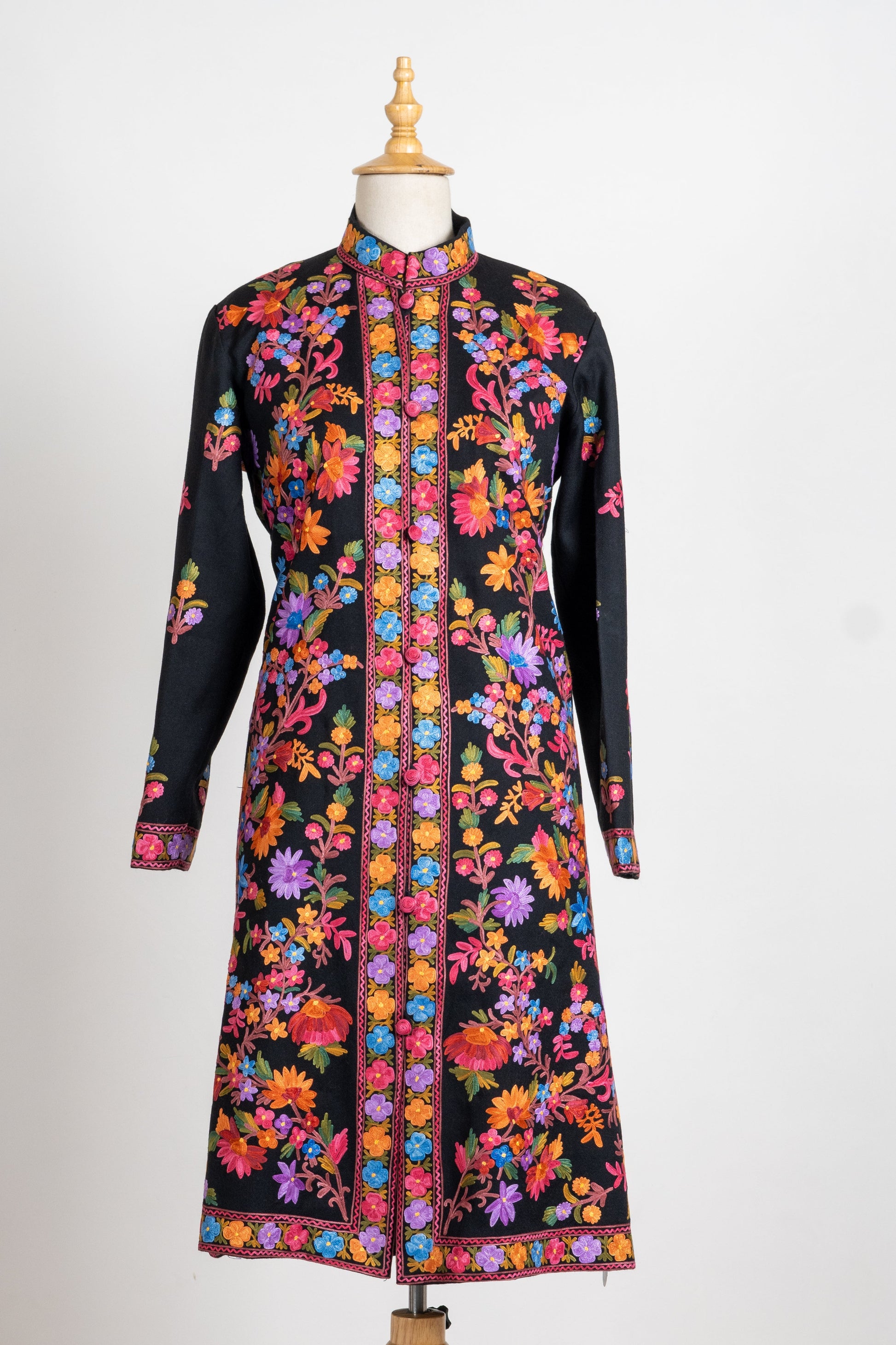 Embrace the timeless charm of Kashmiri artistry with this long Aari embroidered jacket. Adorned with vibrant floral motifs in striking hues of fuchsia, orange, and lavender, this piece captures the essence of Kashmiri gardens. The delicate embroidery, meticulously crafted, celebrates the unparalleled craftsmanship of the region.