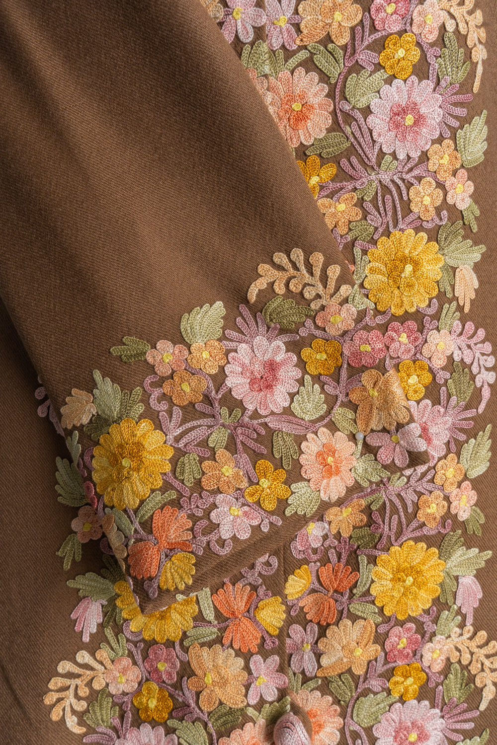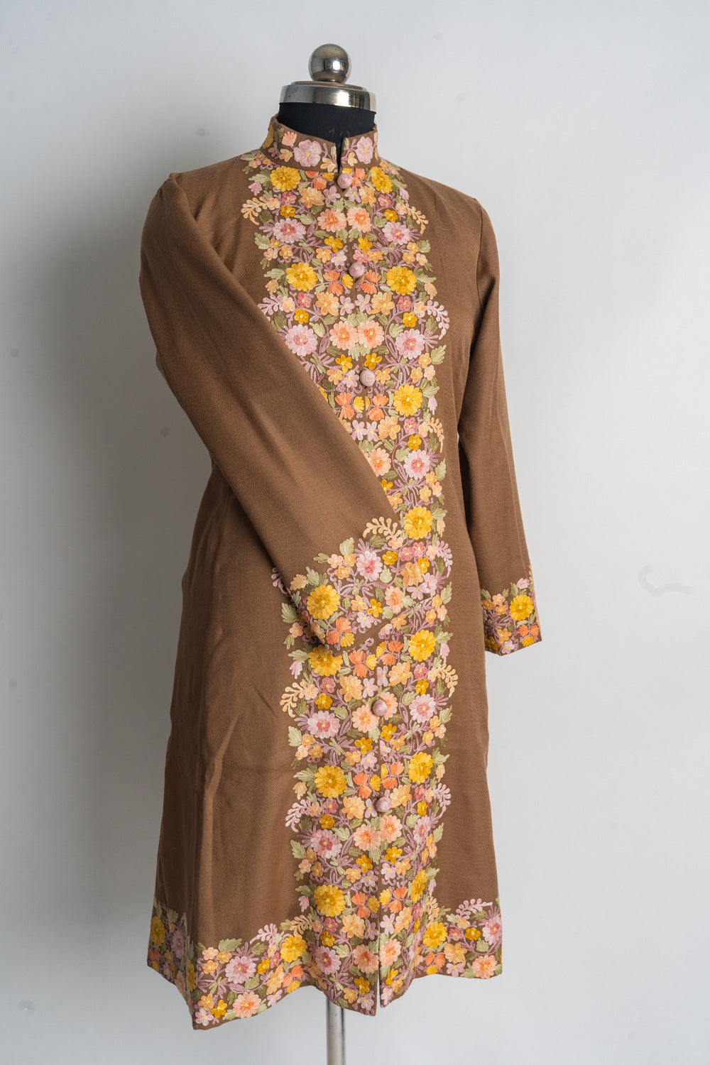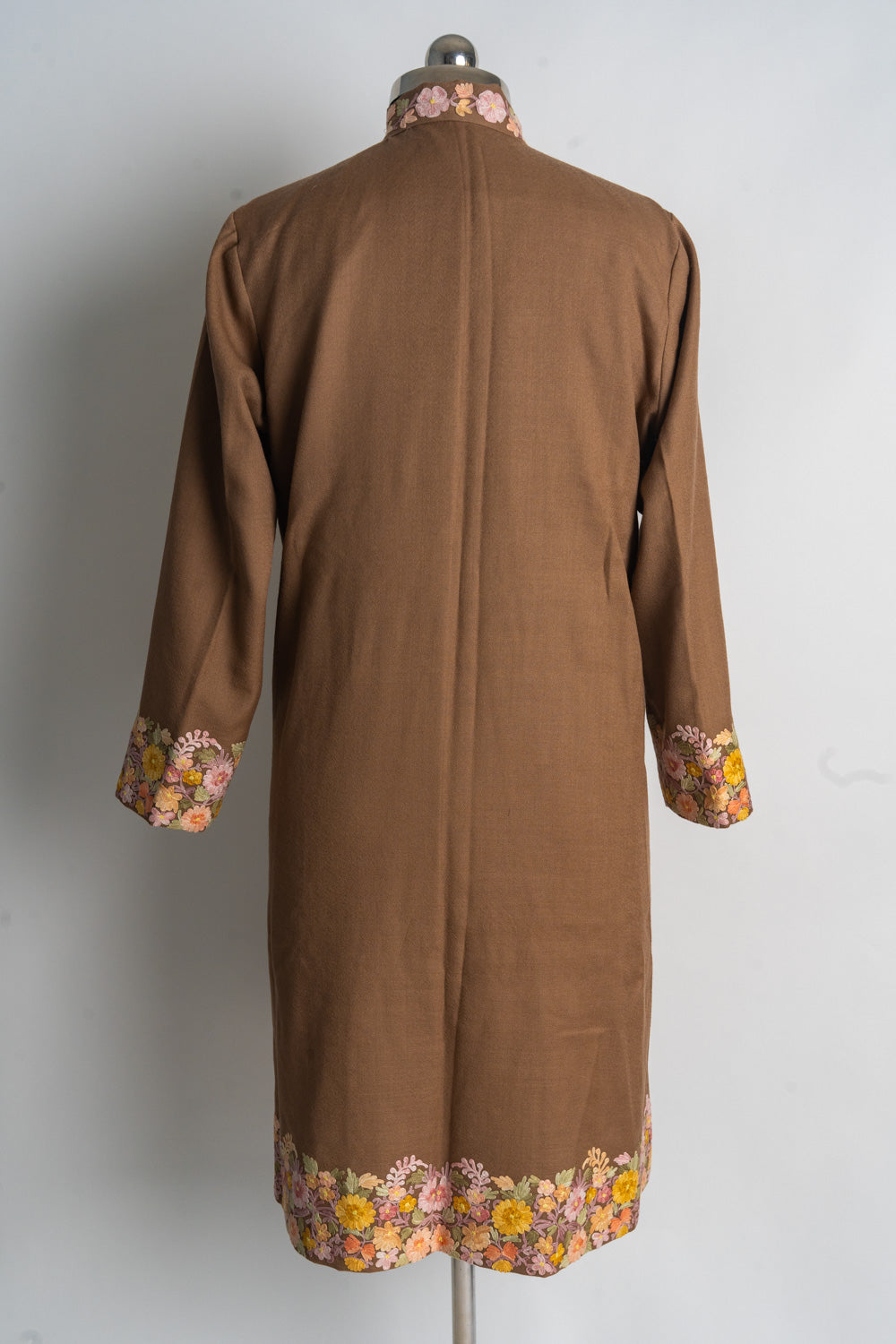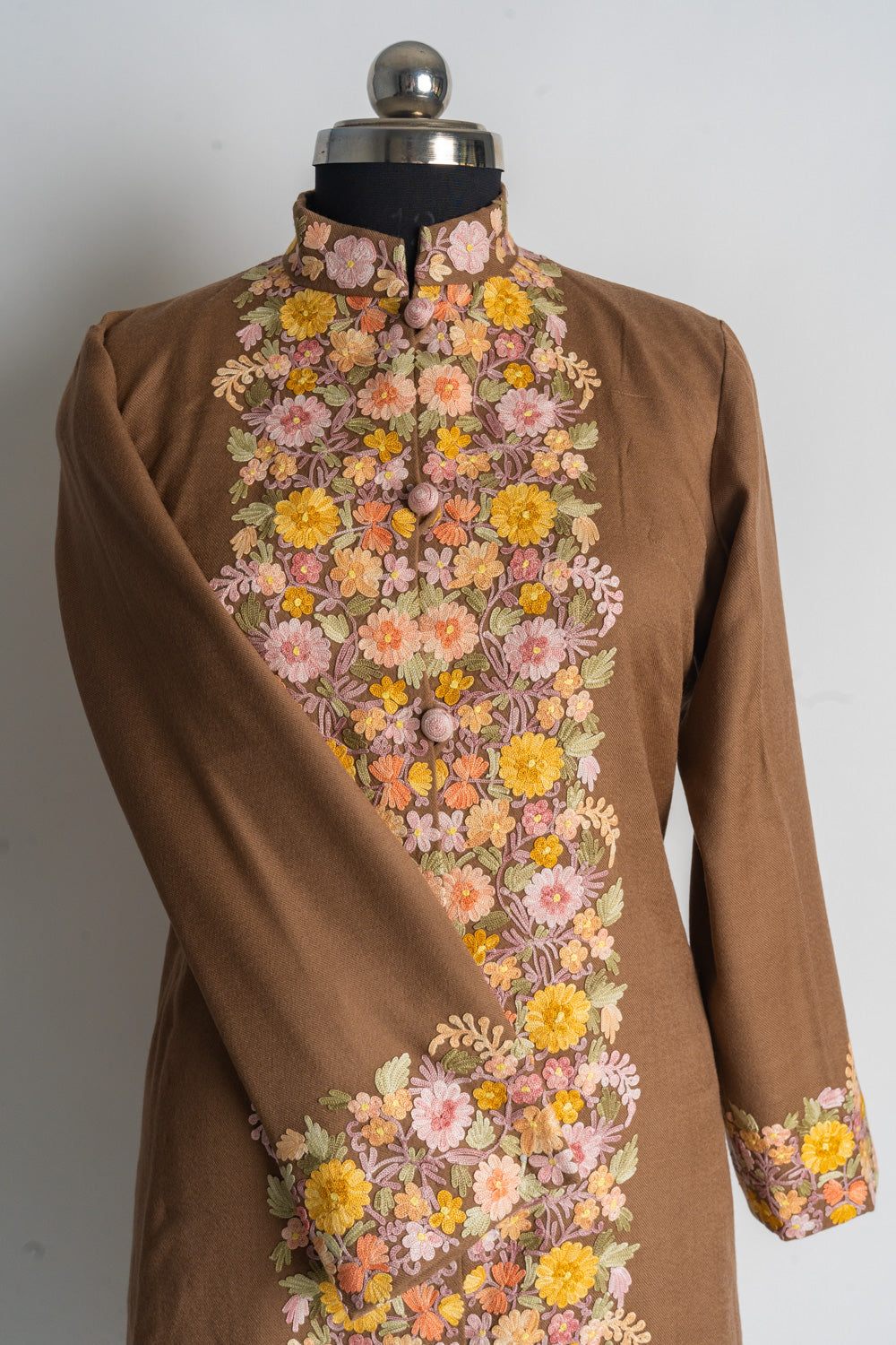 Immerse yourself in a symphony of colors with our Floral Symphony Kashmiri Long Jacket, featuring exquisite Aari embroidery. The warm brown fabric is adorned with delicate floral motifs in soft pastel hues, creating a harmonious blend of tradition and contemporary style. Each stitch reflects the exceptional craftsmanship of Kashmiri artisans, making this jacket a true masterpiece.
