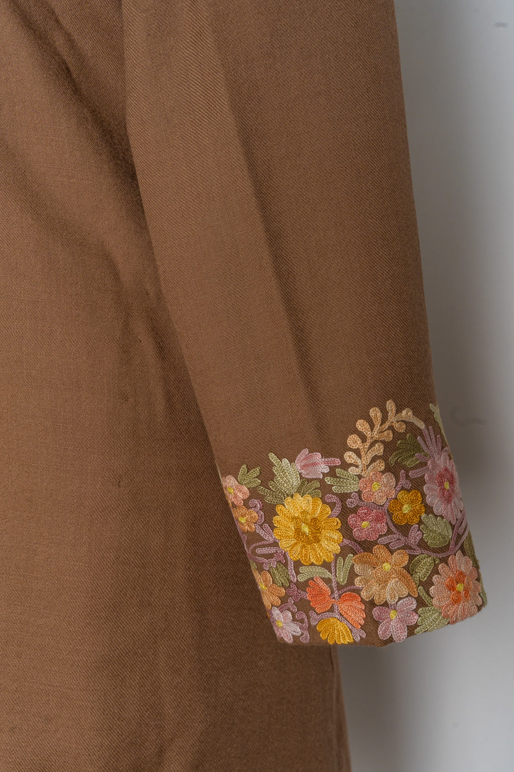 Perfect for both casual and formal settings, this long jacket offers a blend of comfort and elegance. The high collar and tailored fit add a modern touch, ensuring you look effortlessly stylish. Celebrate the beauty of Kashmiri embroidery with this stunning jacket, and let its floral charm brighten up your wardrobe.