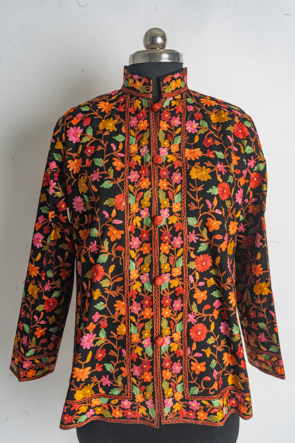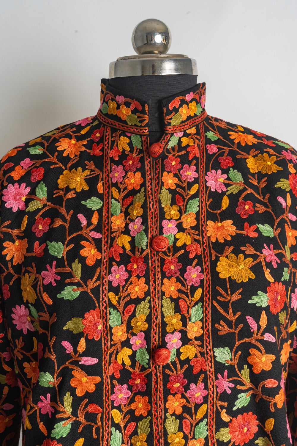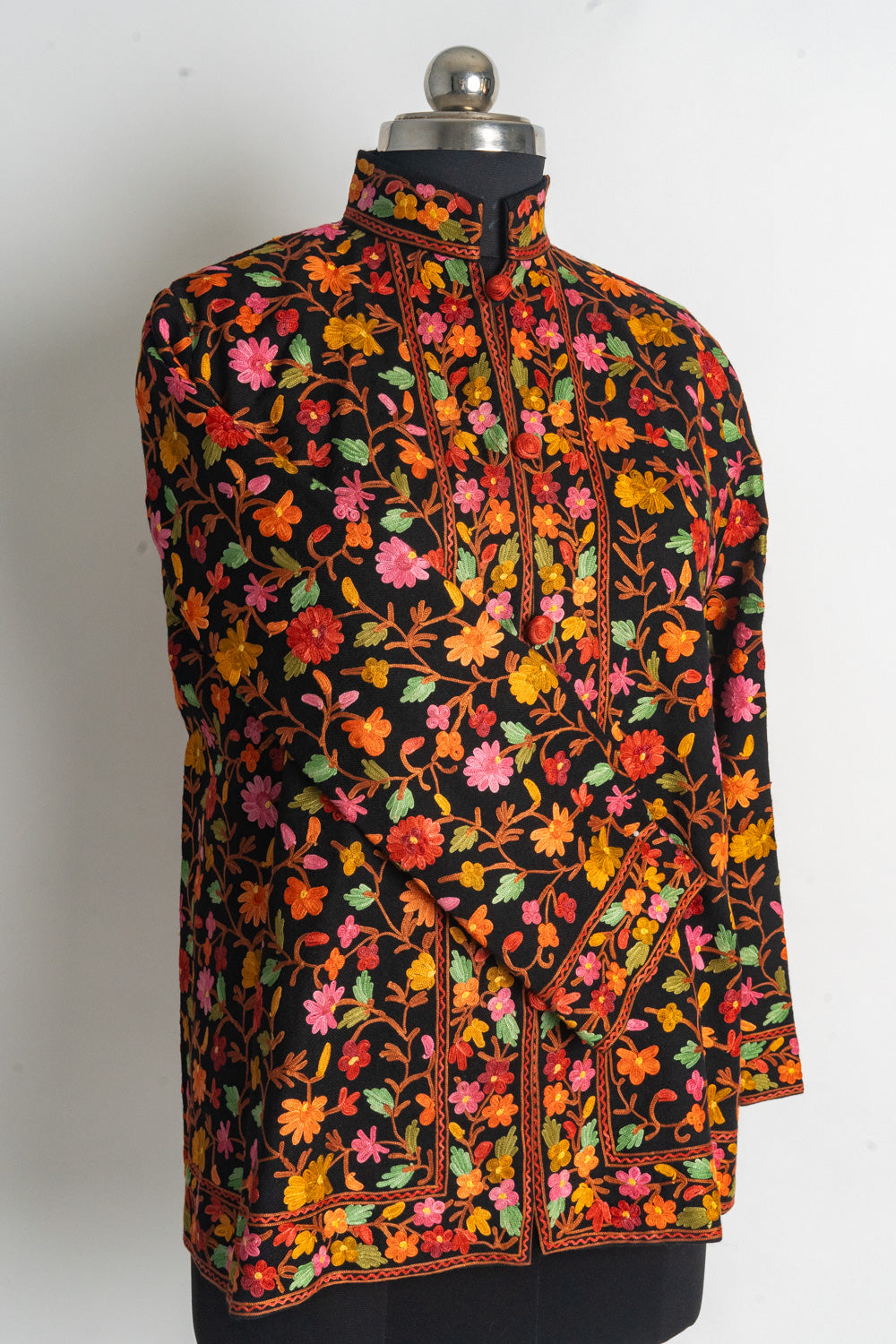 Step into the Garden of Eden with our Kashmiri Aari Embroidery Short Jacket, featuring a vibrant array of floral motifs in rich, colorful hues. This exquisite piece showcases the exceptional skill of Kashmiri artisans, with intricate embroidery that brings the jacket to life. The bright flowers against a deep black background create a striking contrast, making this jacket a standout addition to any luxury collection.