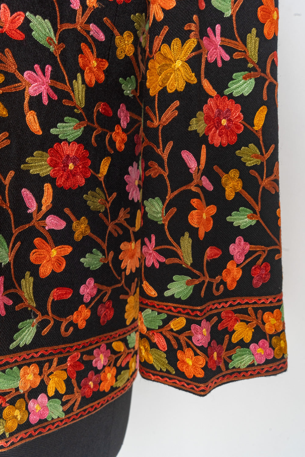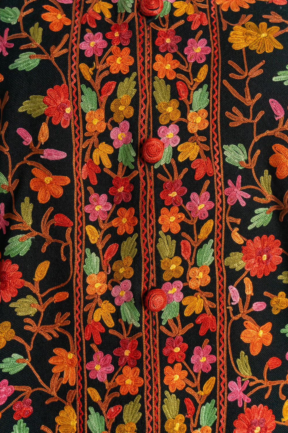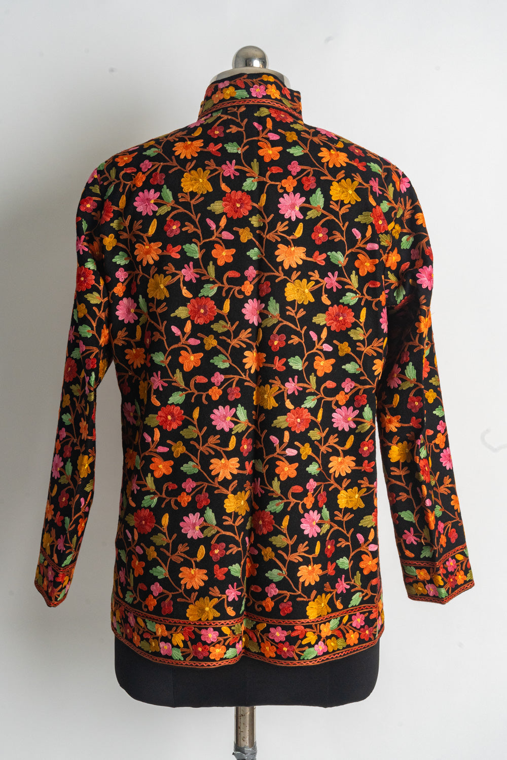 Step into the Garden of Eden with our Kashmiri Aari Embroidery Short Jacket, featuring a vibrant array of floral motifs in rich, colorful hues. This exquisite piece showcases the exceptional skill of Kashmiri artisans, with intricate embroidery that brings the jacket to life. The bright flowers against a deep black background create a striking contrast, making this jacket a standout addition to any luxury collection.