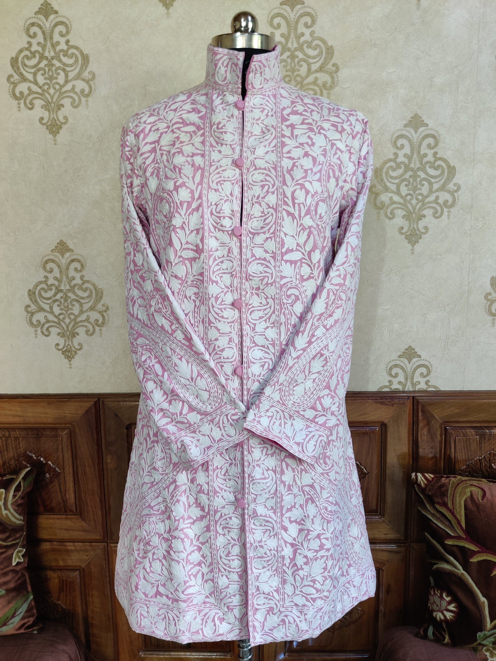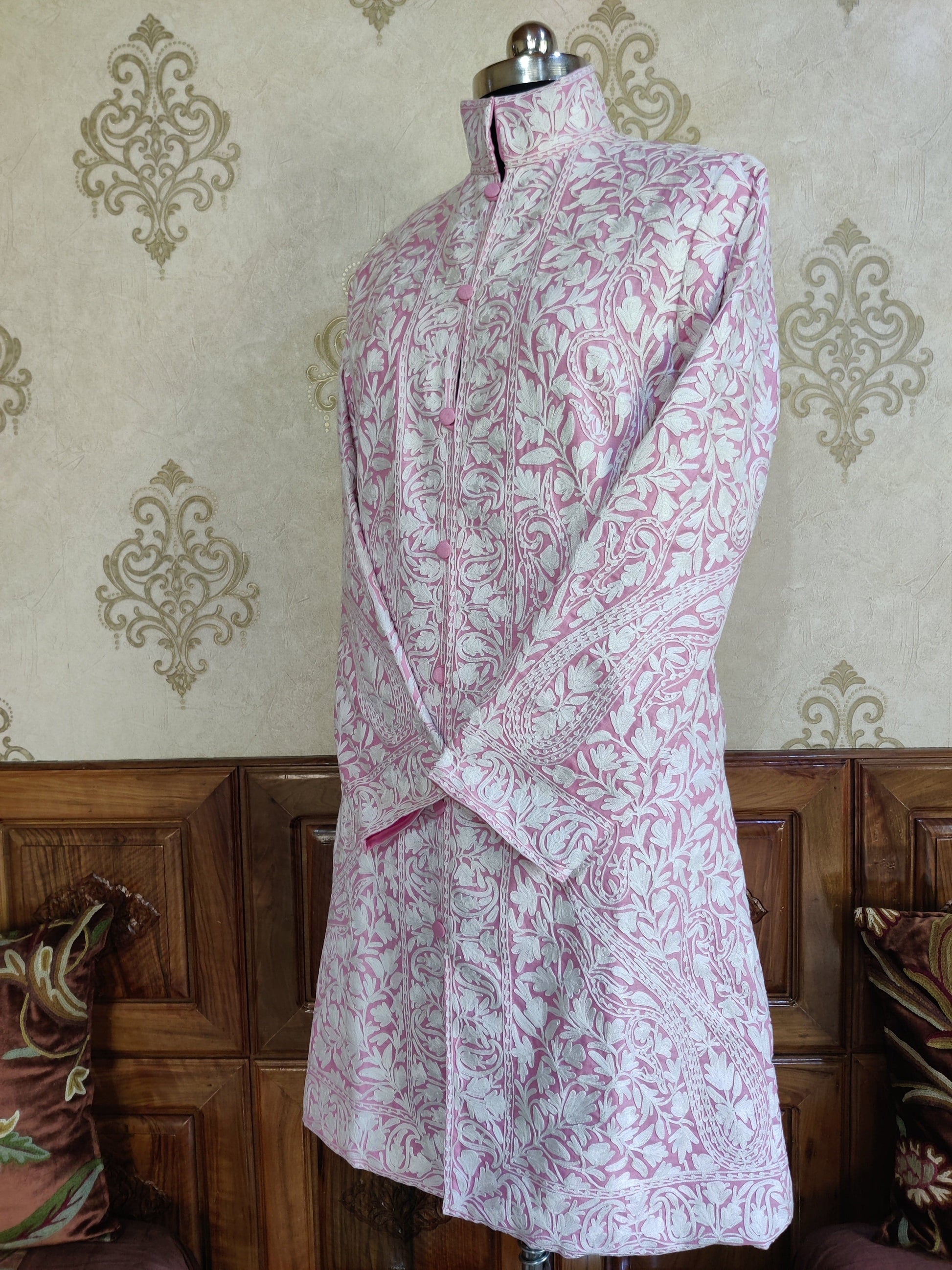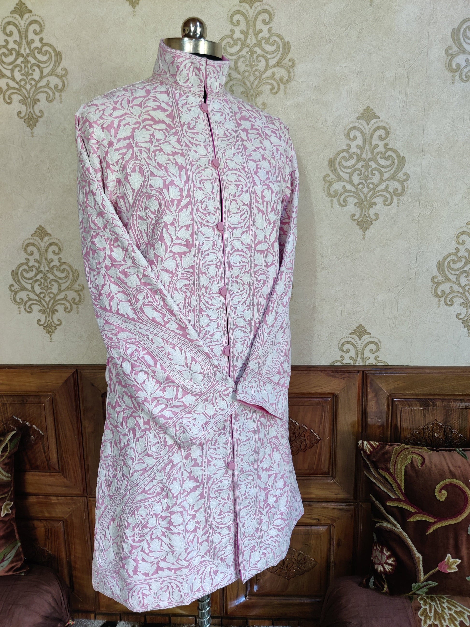 Ideal for festive gatherings, weddings, or cultural events, this jacket is a testament to timeless elegance and superior artistry. Indulge in the opulence of Kashmiri tradition with the Gulabi Shahana Jacket, a luxurious addition to your wardrobe that reflects refined taste and cultural appreciation.