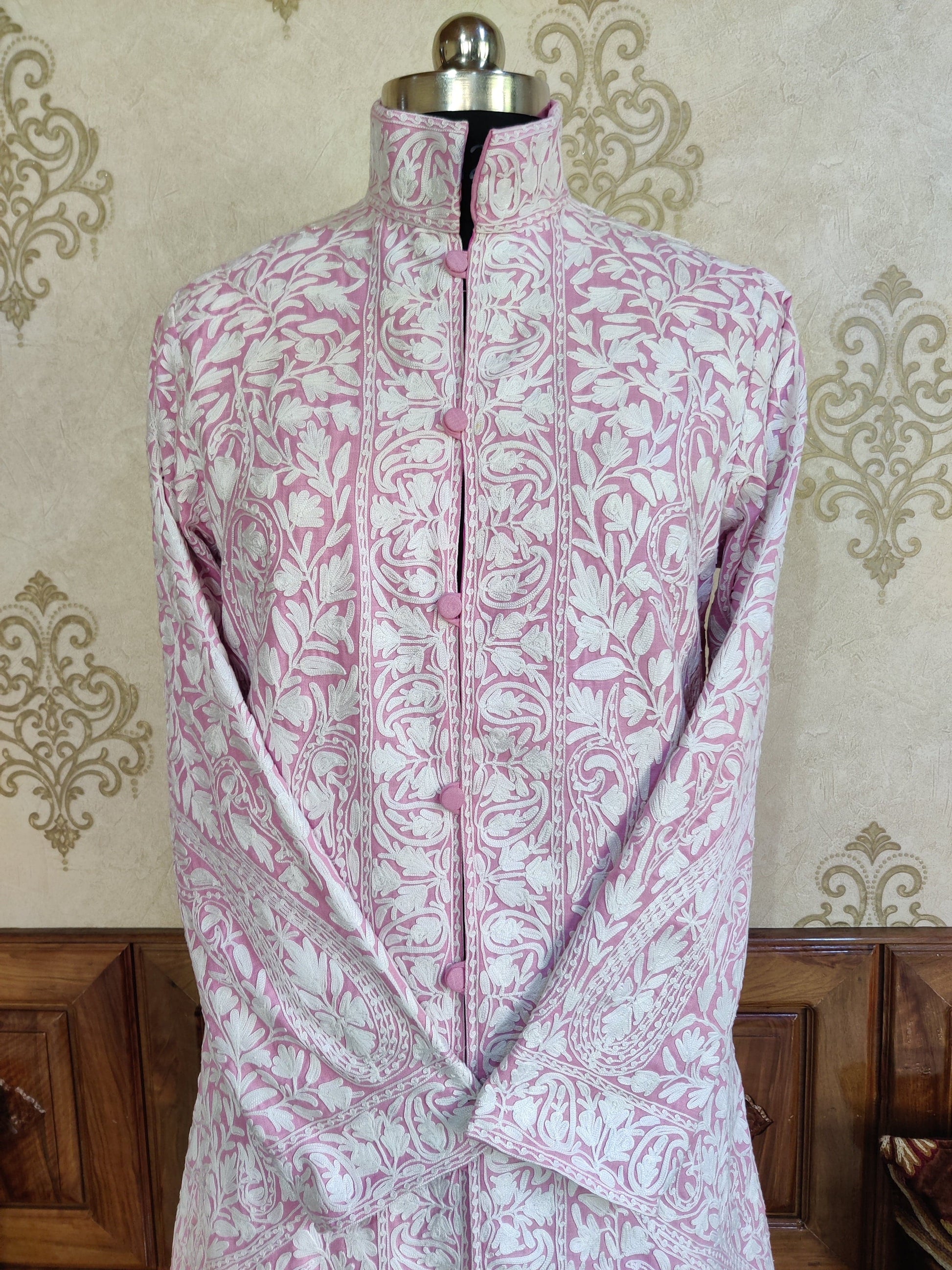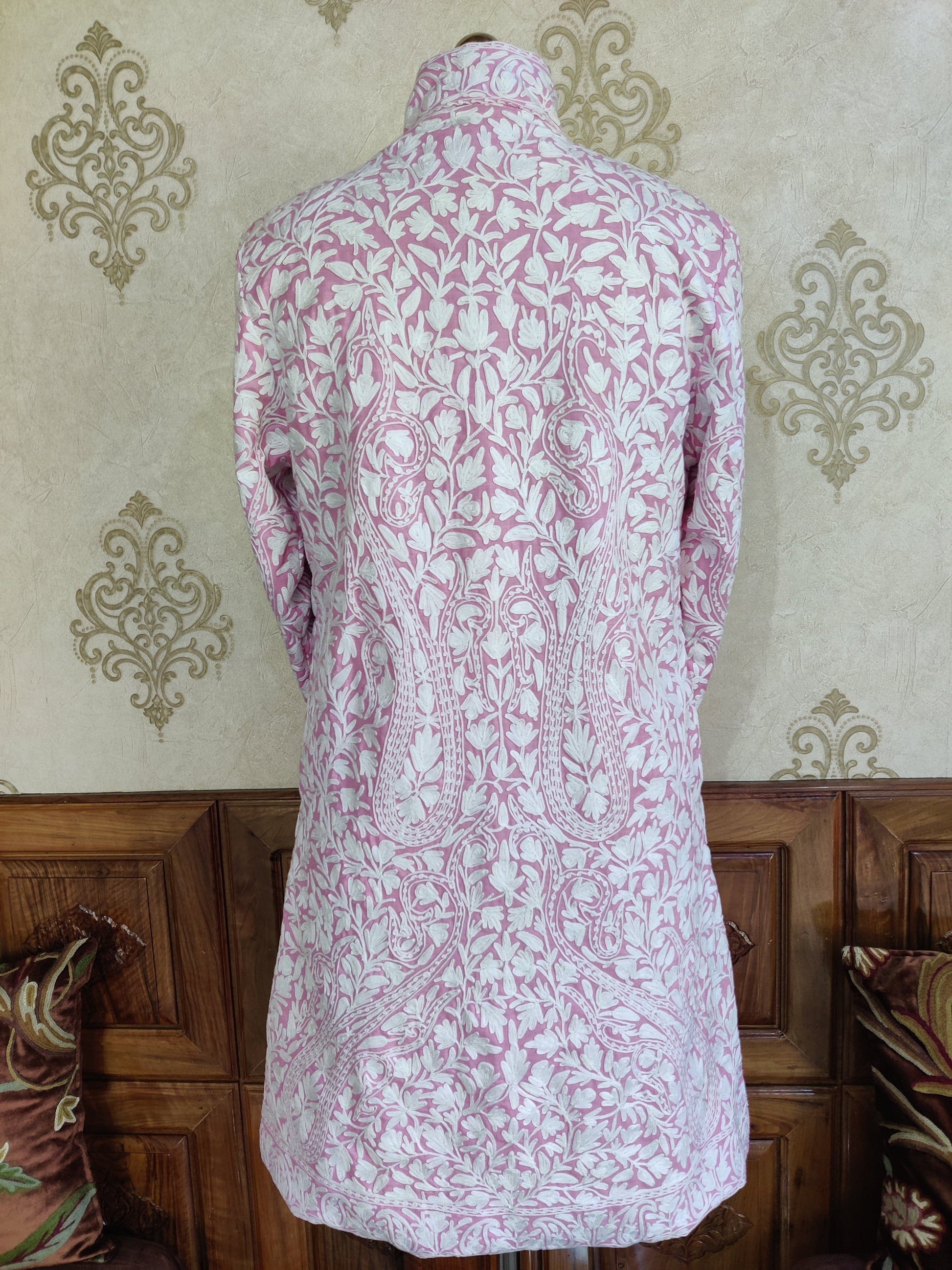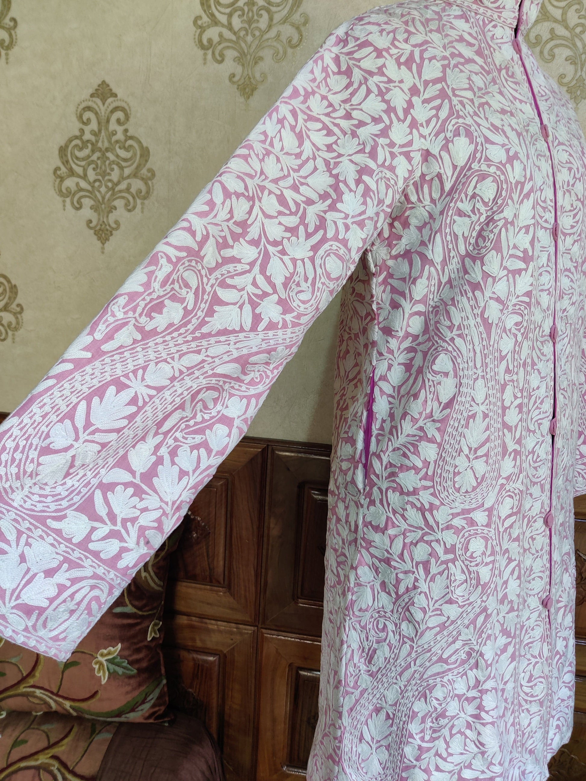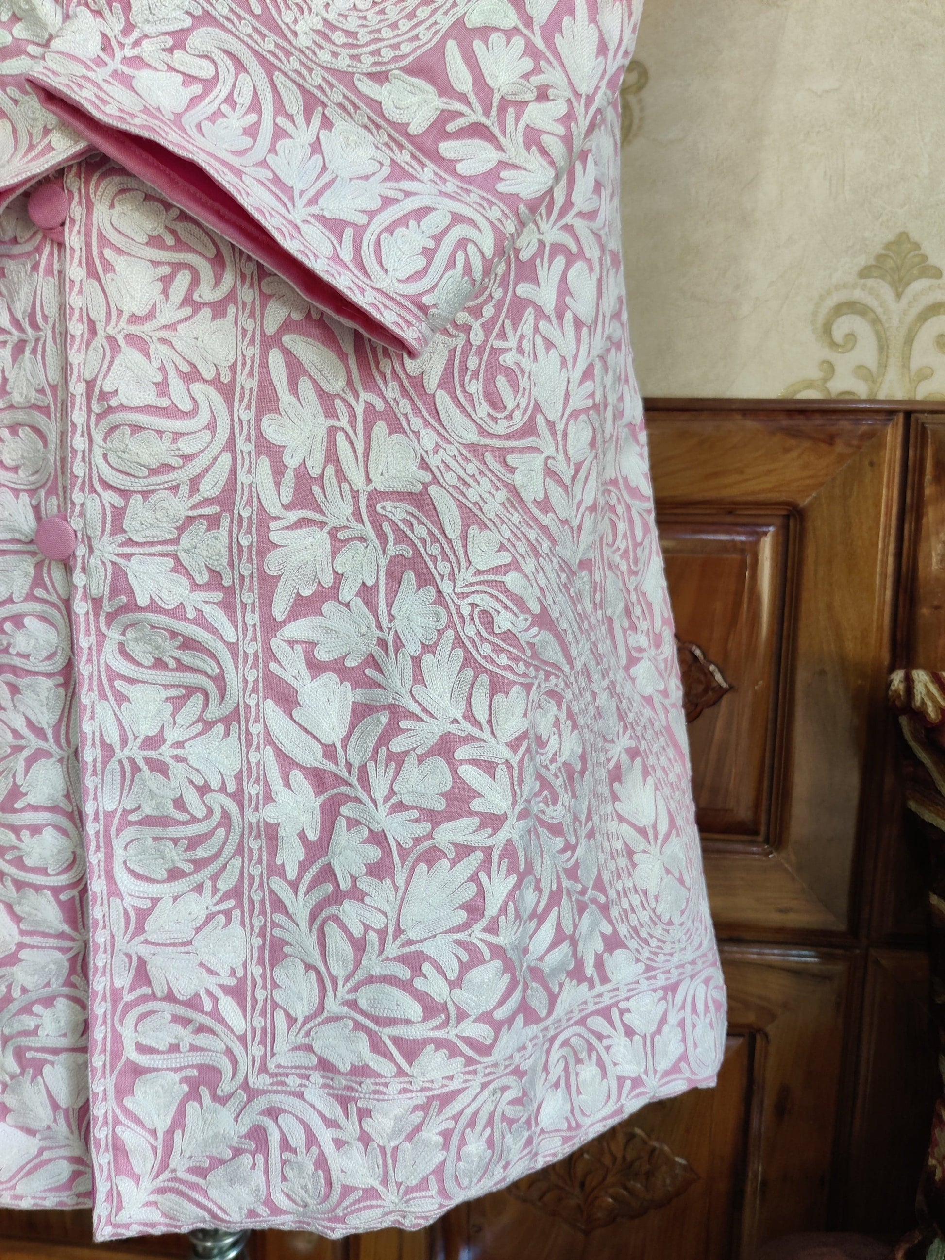 Elevate your style with the exquisite Gulabi Shahana Jacket, a stunning fusion of tradition and luxury. This elegantly tailored jacket features the rich heritage of Kashmiri embroidery, meticulously hand-stitched on a soft pink base. The intricate white floral patterns flow seamlessly across the fabric, creating a mesmerizing contrast that exudes sophistication and cultural depth.