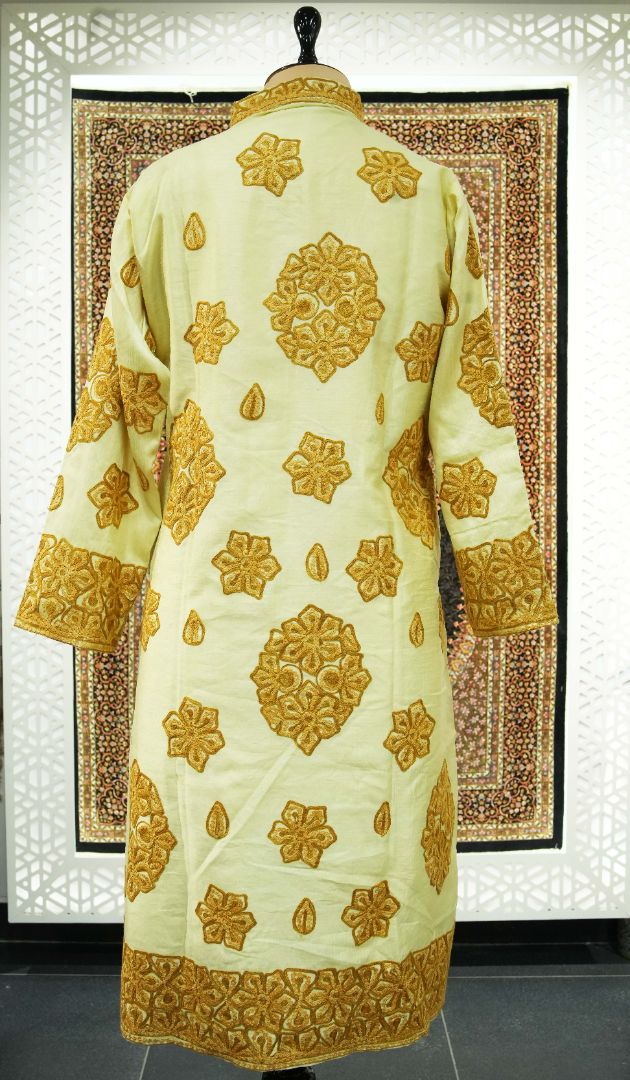Embrace the splendor of tradition with our Golden Majesty Kashmiri Aari Embroidery Long Jacket. This stunning piece features a serene ivory base, richly adorned with intricate golden Aari embroidery. The detailed floral patterns, meticulously hand-embroidered by skilled artisans, bring to life the timeless elegance of Kashmiri craftsmanship. The jacket’s regal design and luxurious feel make it an ideal choice for special occasions and festive celebrations.