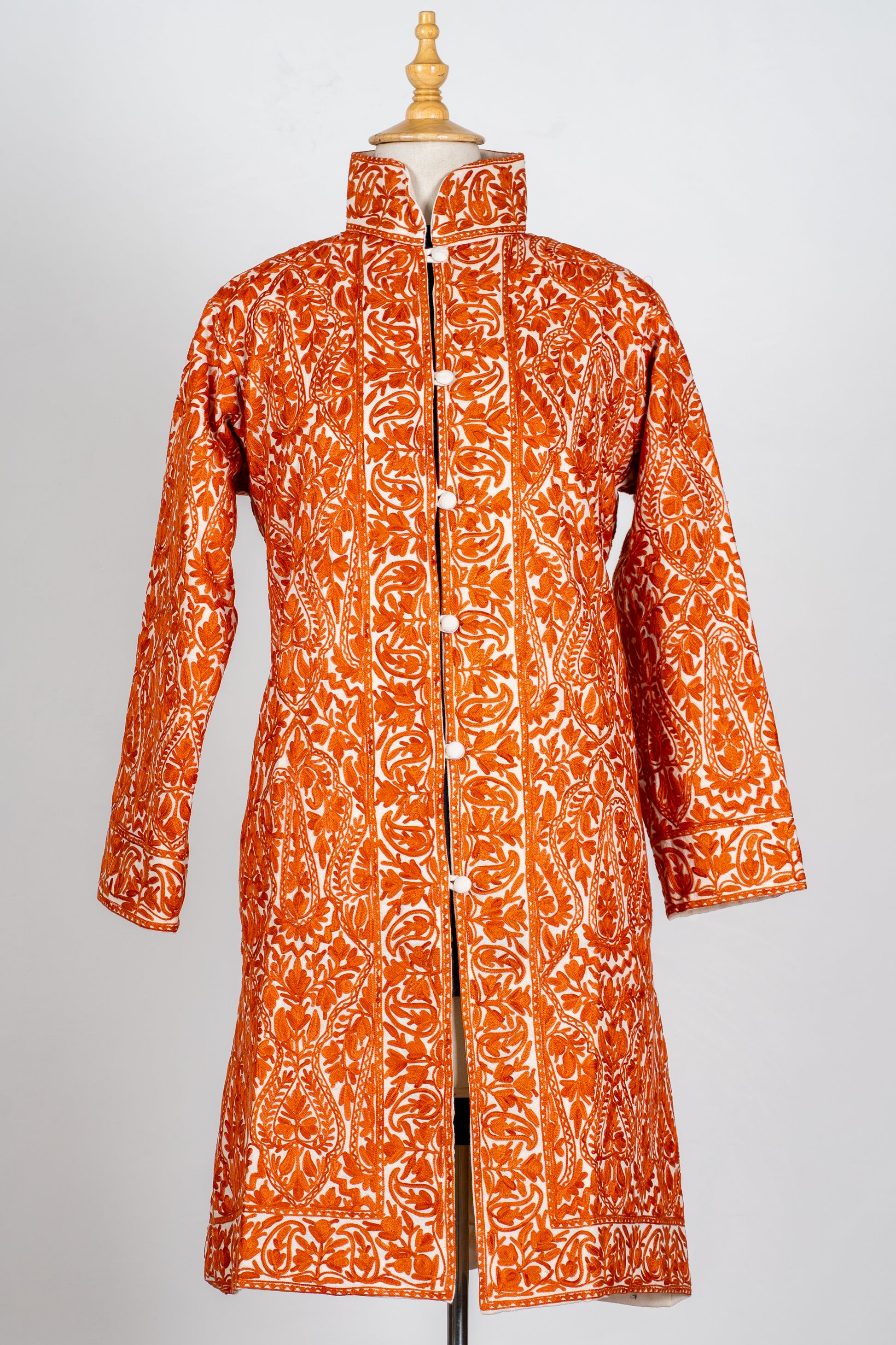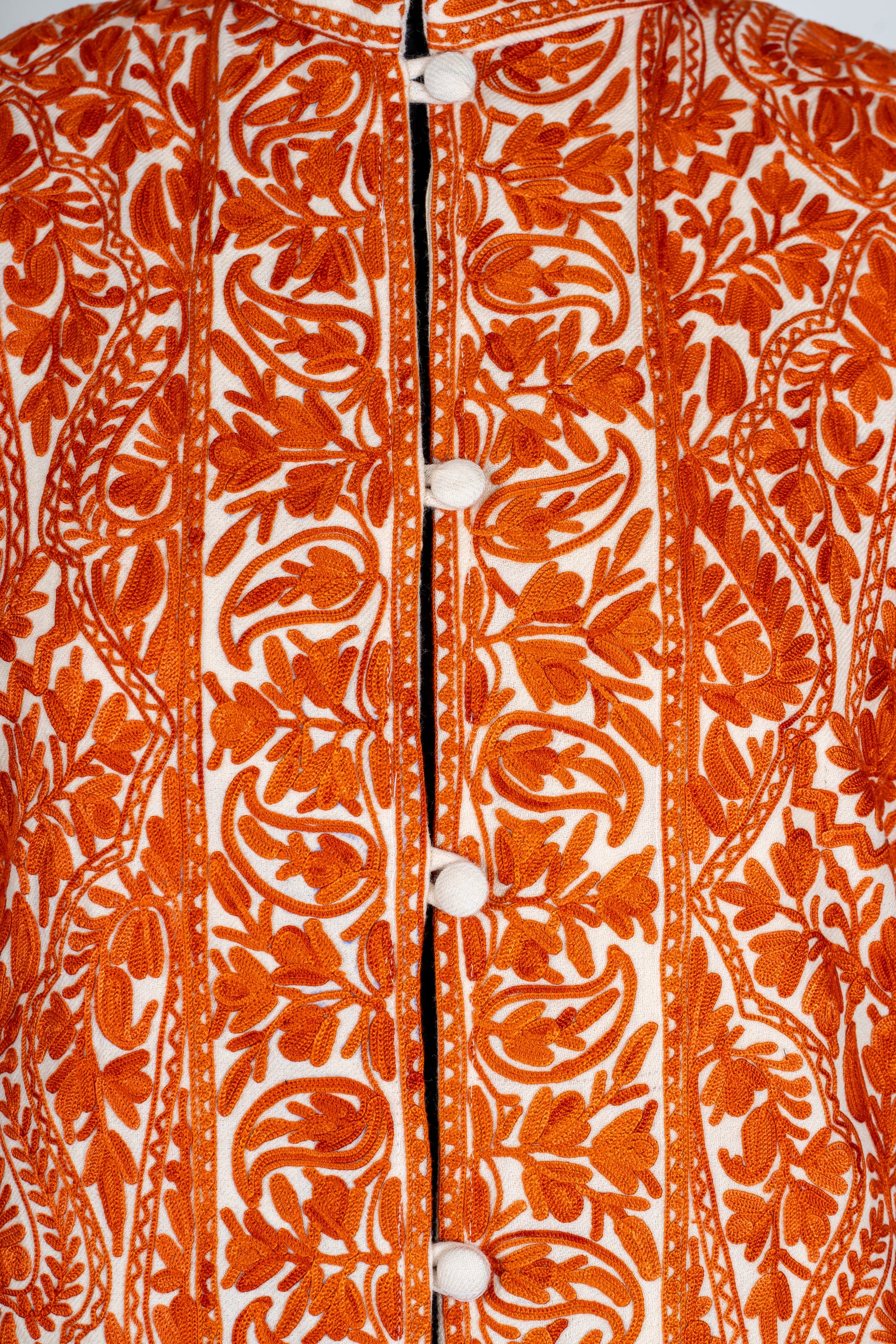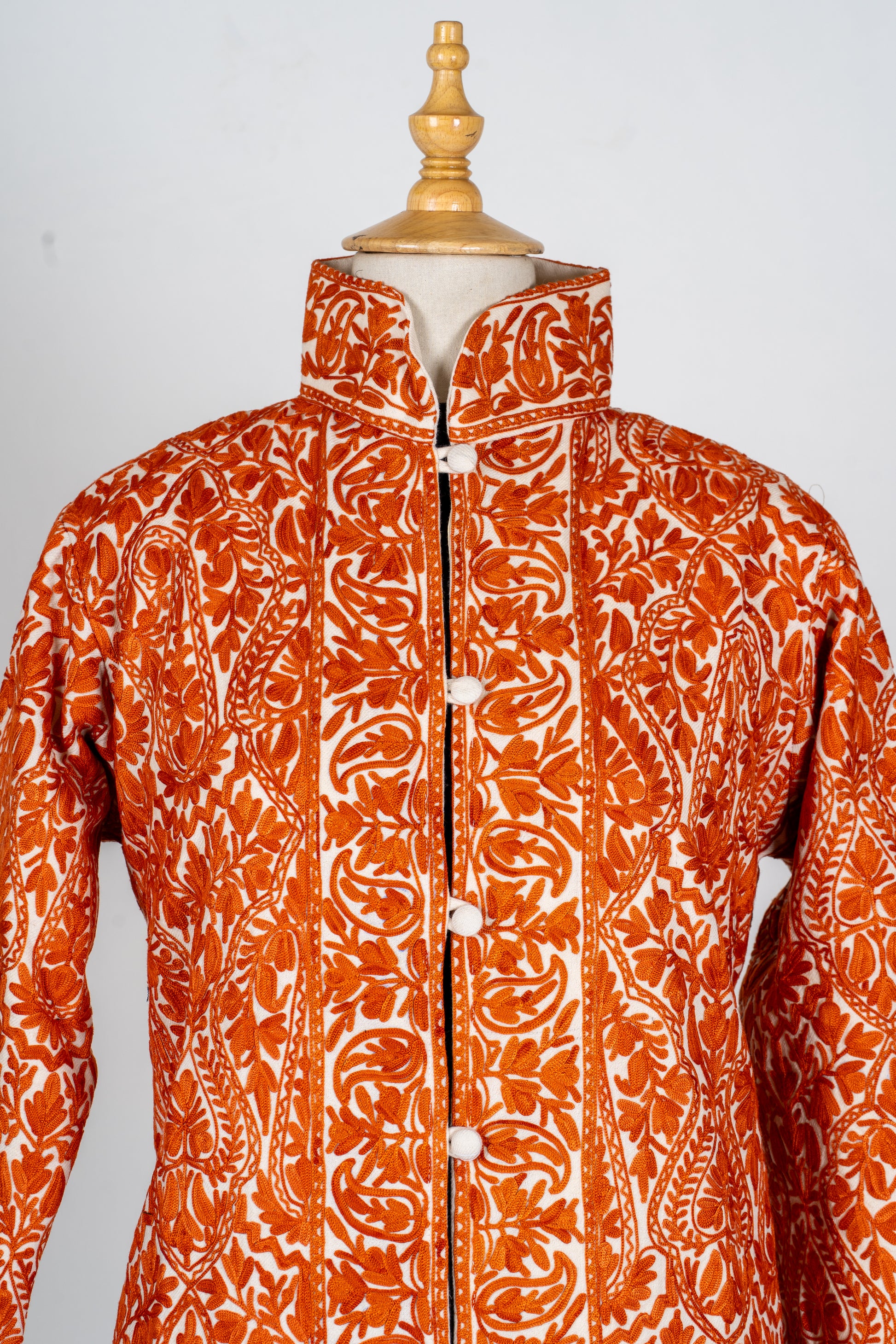 Kesar Aura: Aari Embroidered Long Jacket in Fiery Saffron