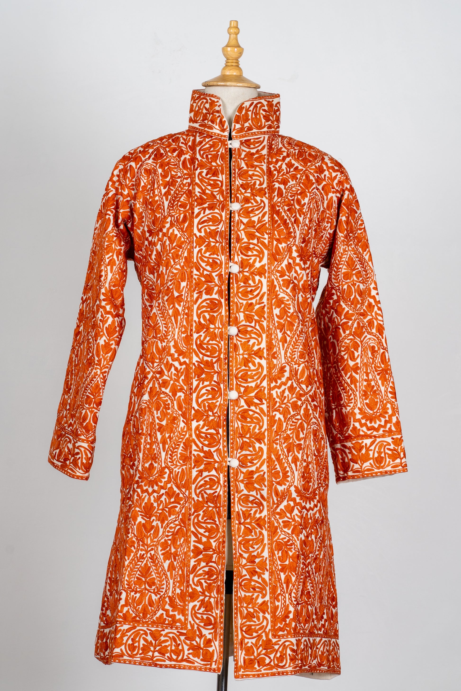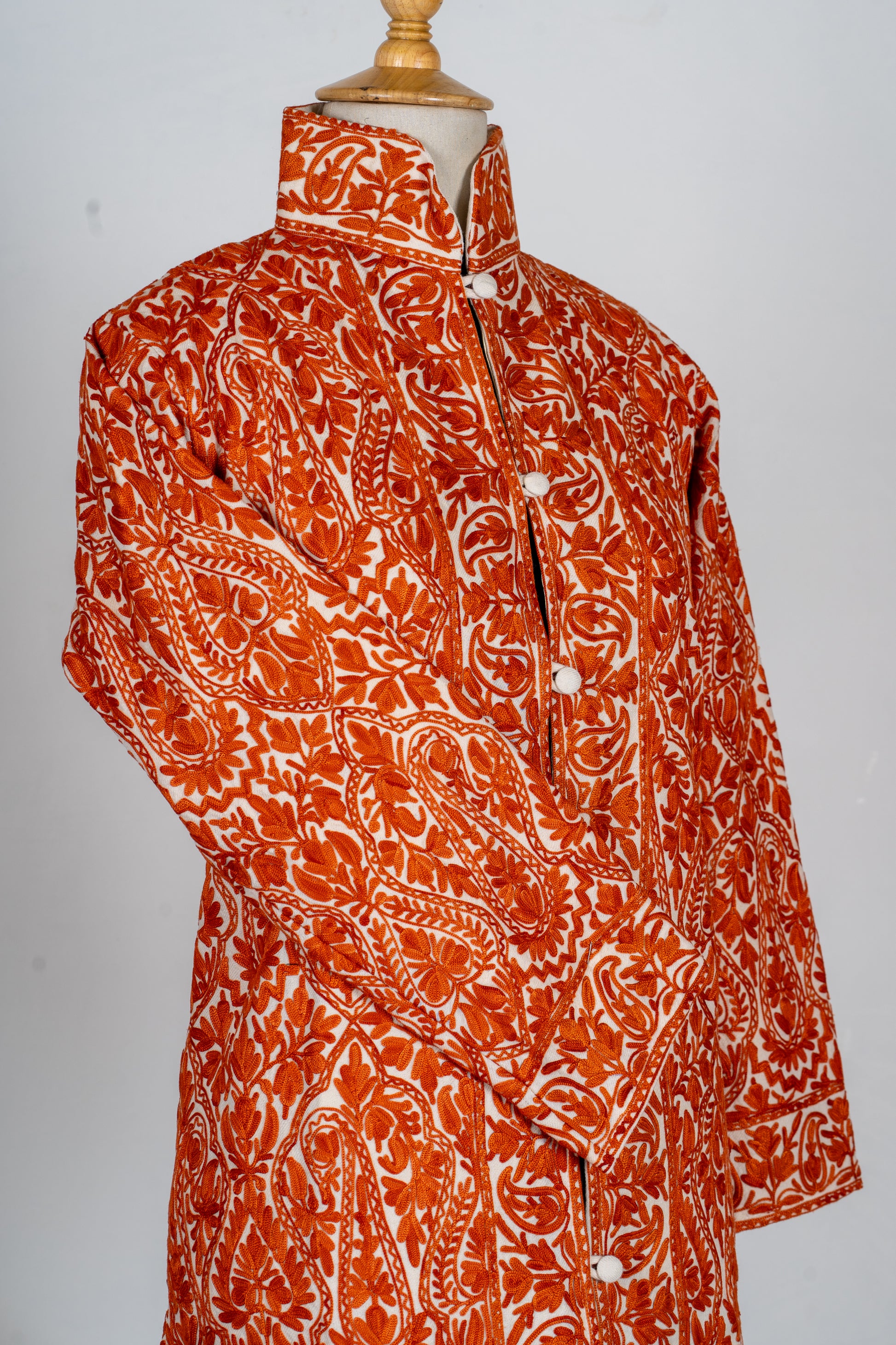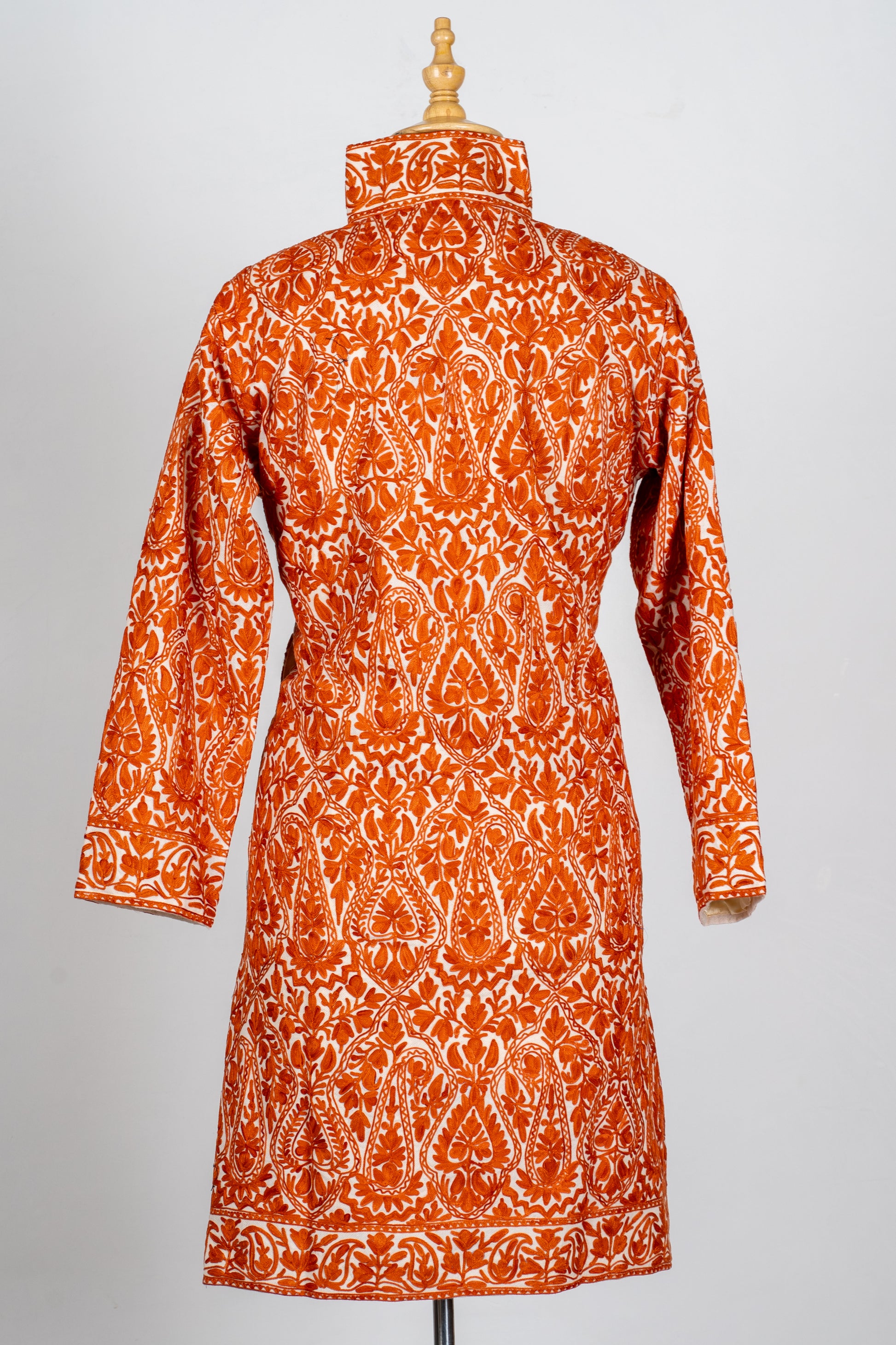 Kesar Aura: Aari Embroidered Long Jacket in Fiery Saffron