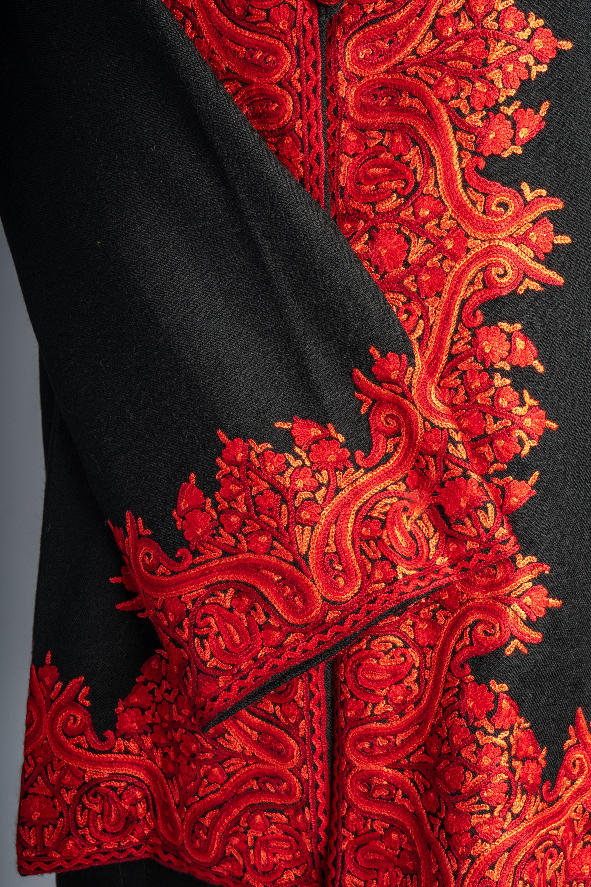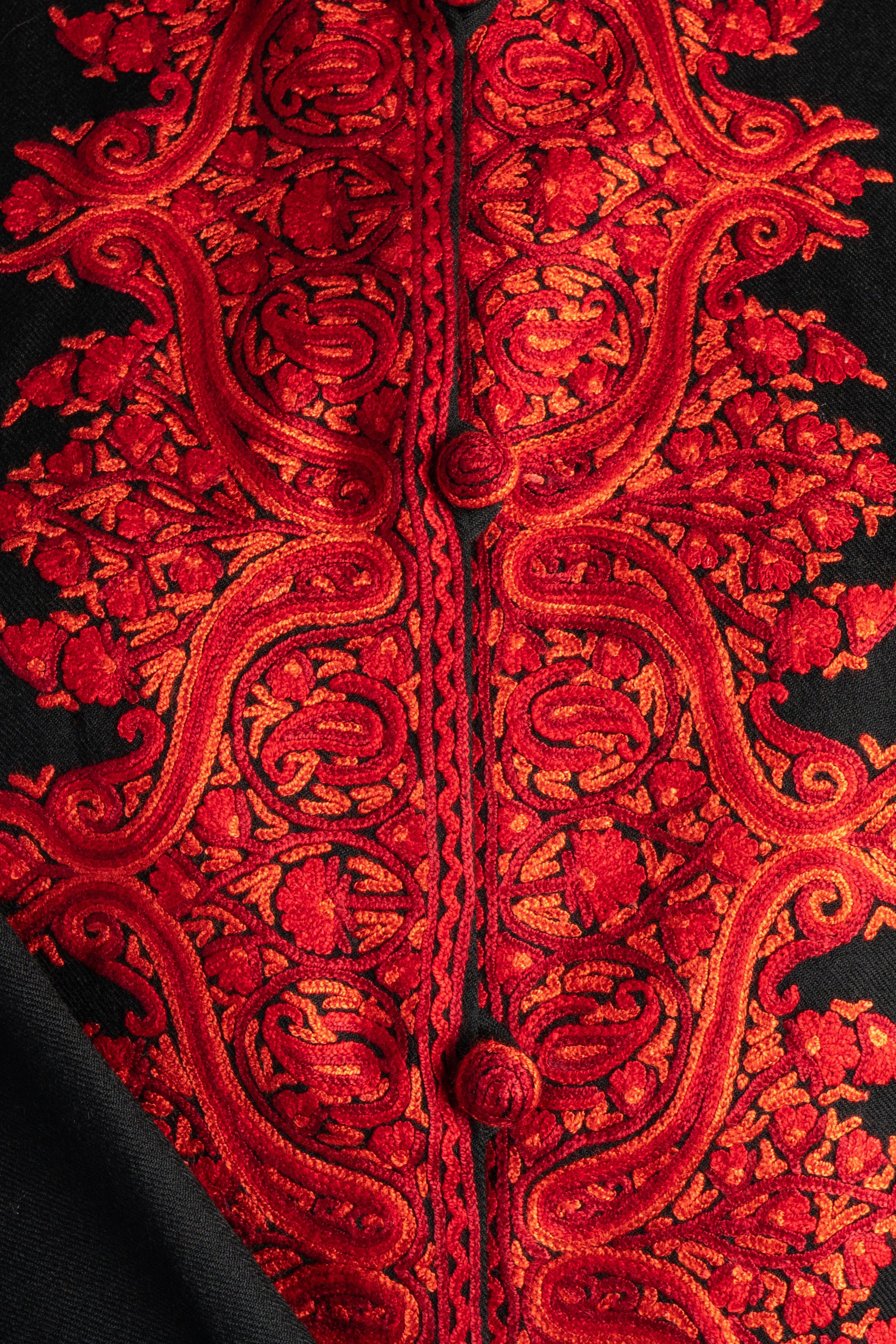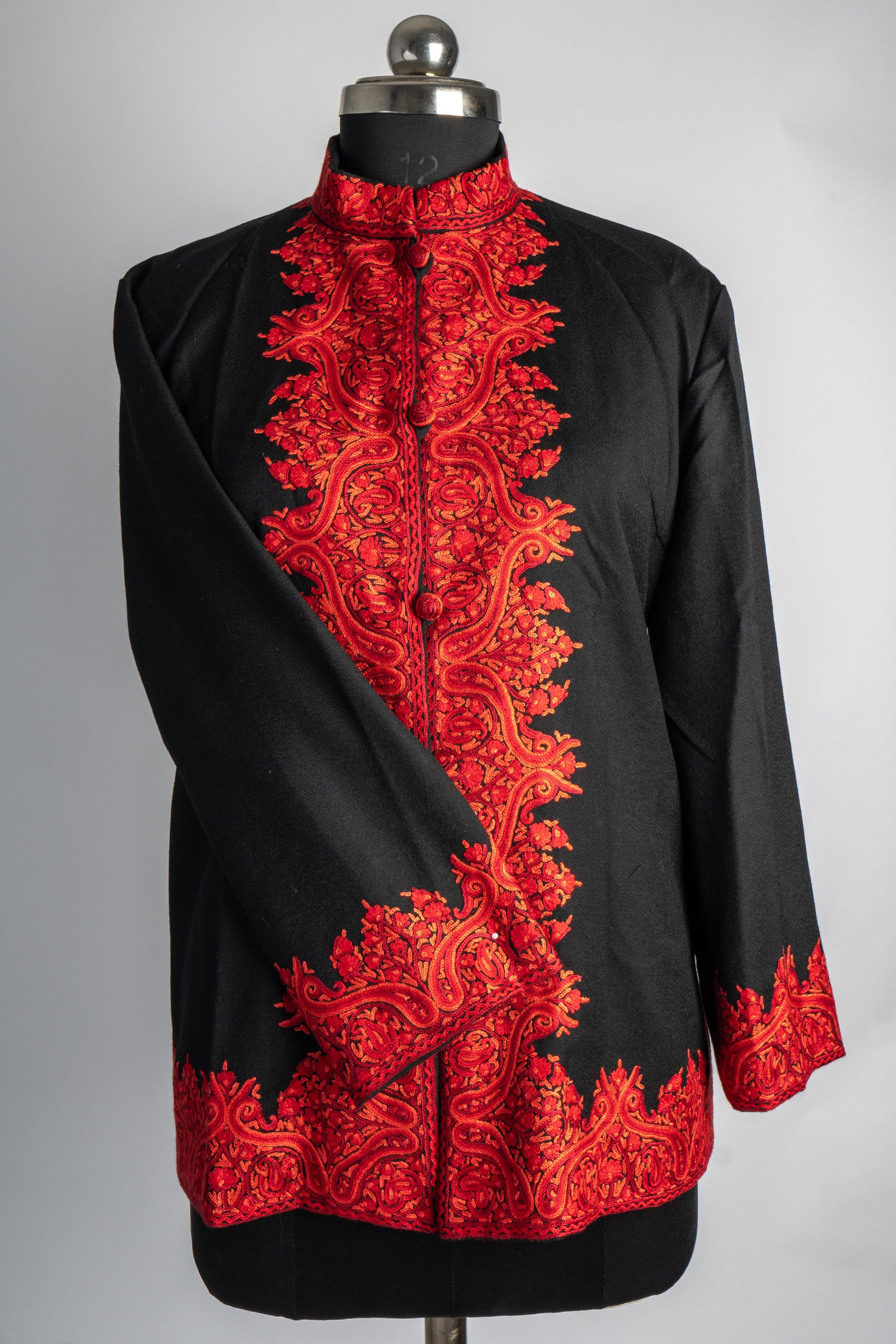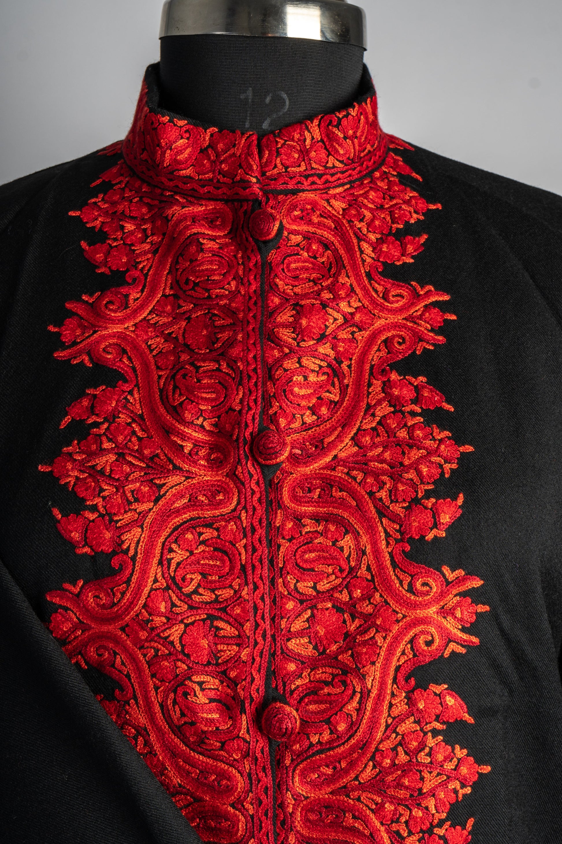 The Lal-Aftaab Aari Embroidered Jacket radiates power and elegance with its fiery red embroidery against a black backdrop. This striking design features bold paisleys, reminiscent of the fiery sun, meticulously hand-embroidered along the front and sleeves. The intensity of the color combination makes this piece an undeniable statement jacket that turns heads effortlessly.