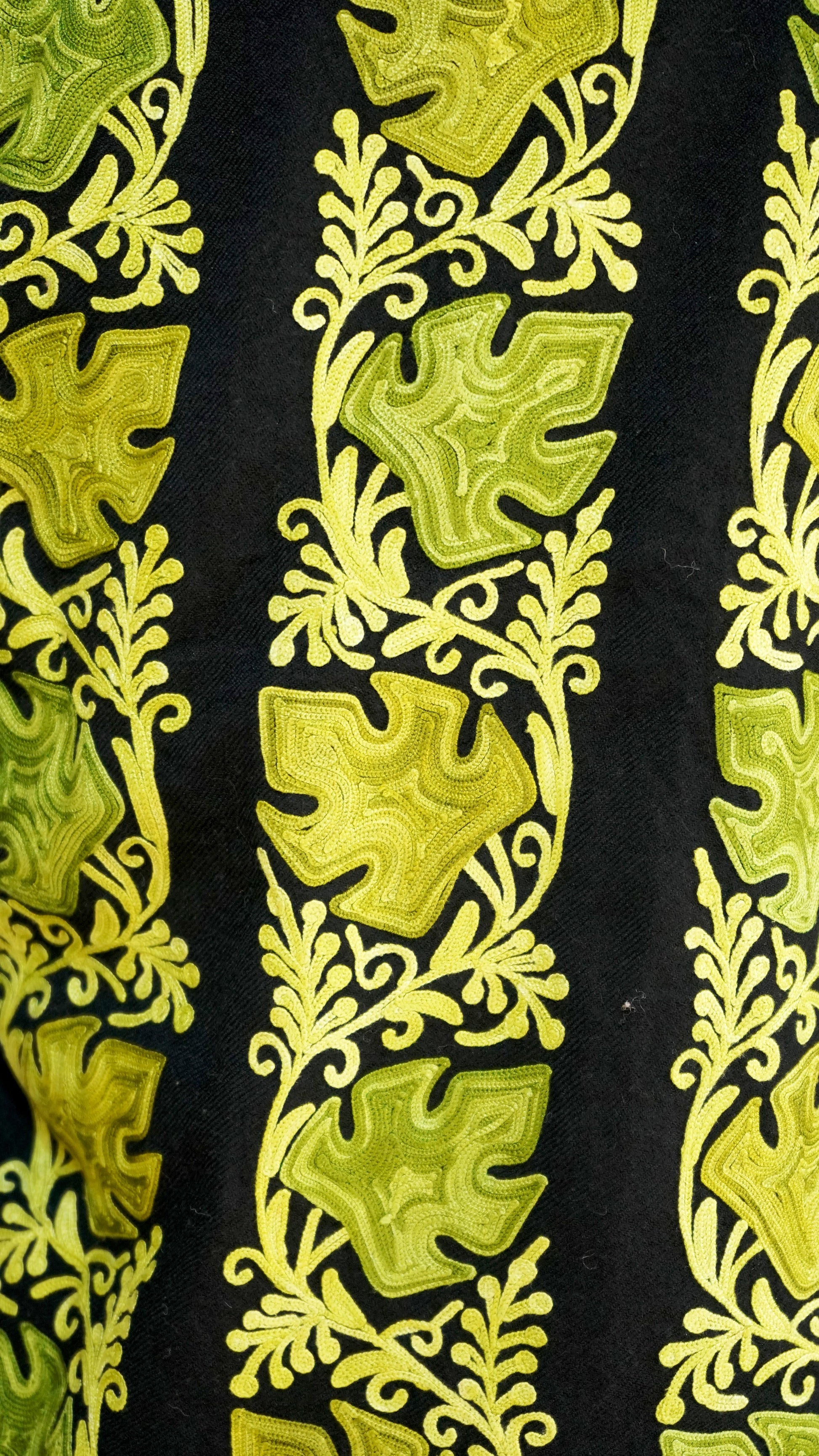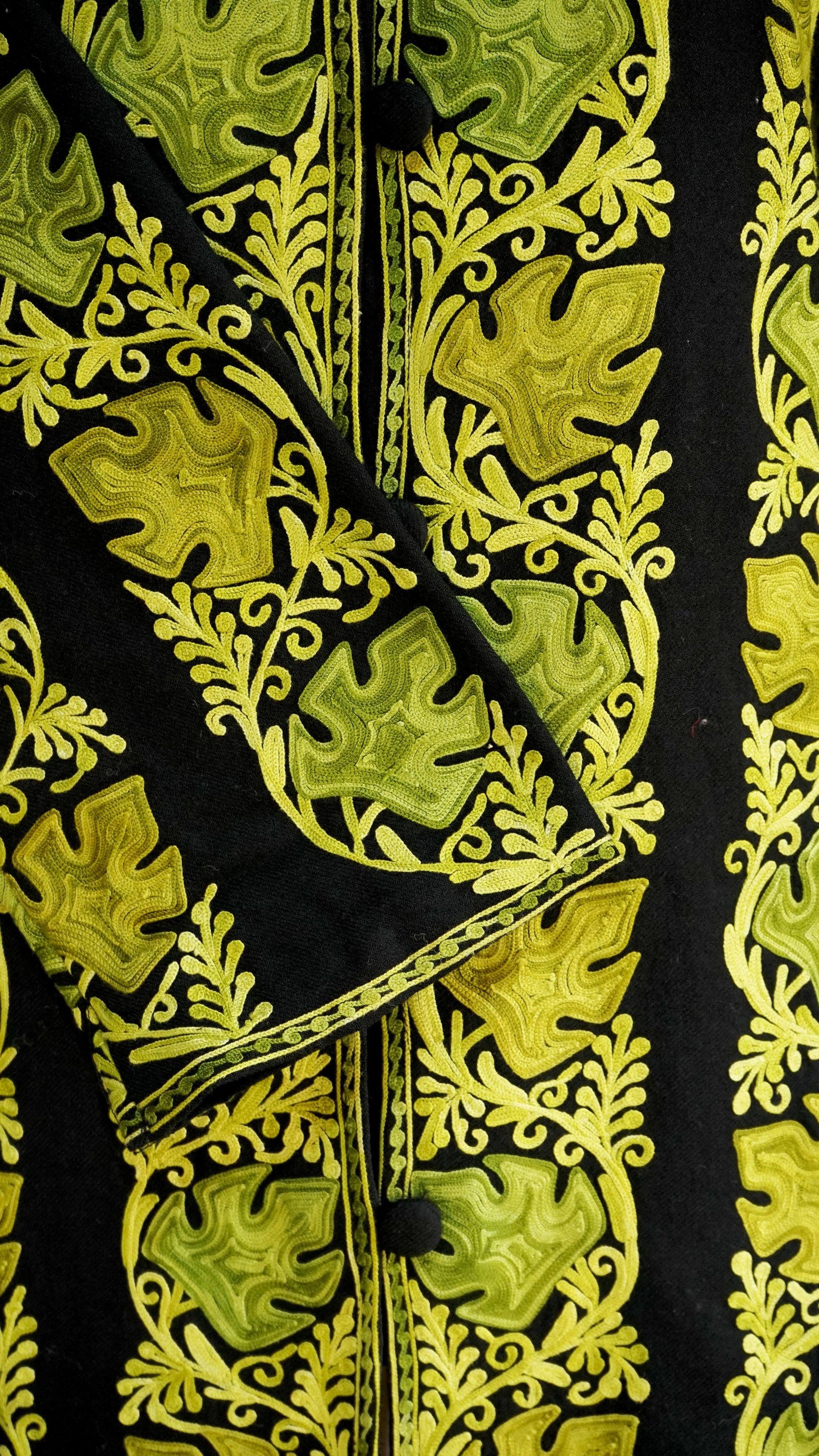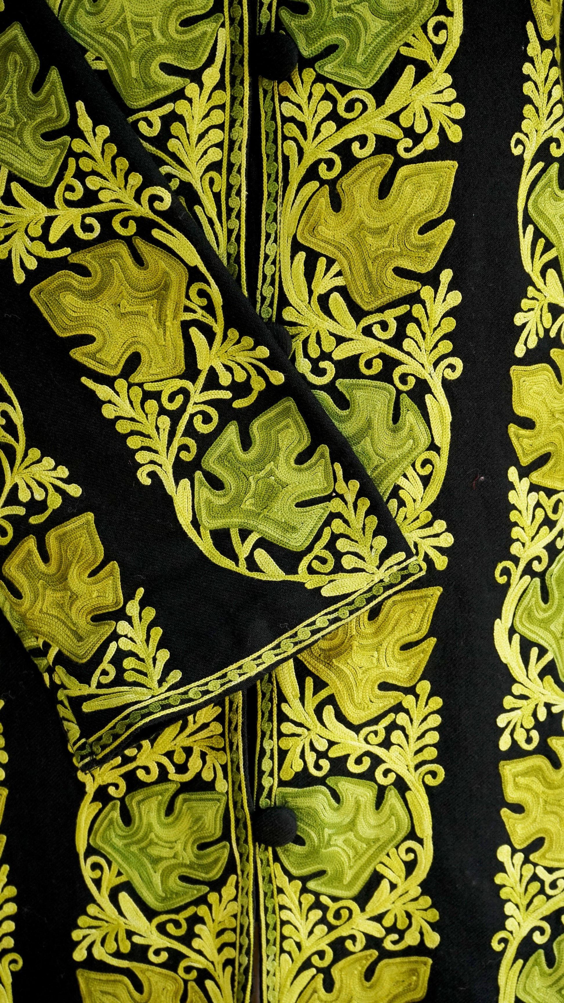 Step into timeless sophistication with our Regal Heritage Aari Embroidered Jacket, a true testament to the rich heritage of Kashmiri craftsmanship. This jacket features exquisite aari embroidery in vibrant color, meticulously embroidered onto a luxurious black fabric. The intricate floral and paisley motifs symbolize the lush landscapes of Kashmir, creating a visual symphony that resonates with cultural depth and elegance.