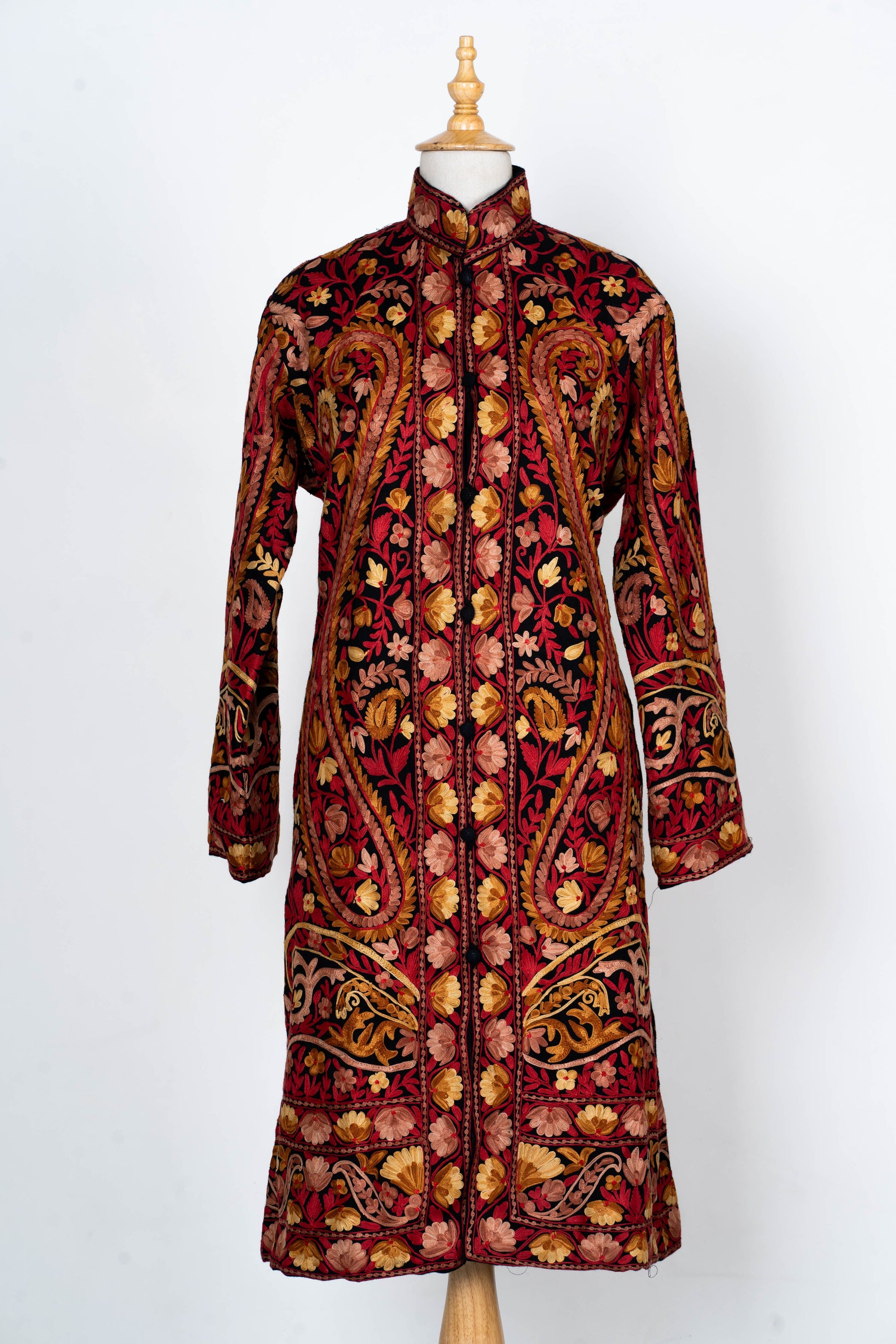 Majestic Bloom: Aari Embroidered Long Jacket in Crimson Splendor