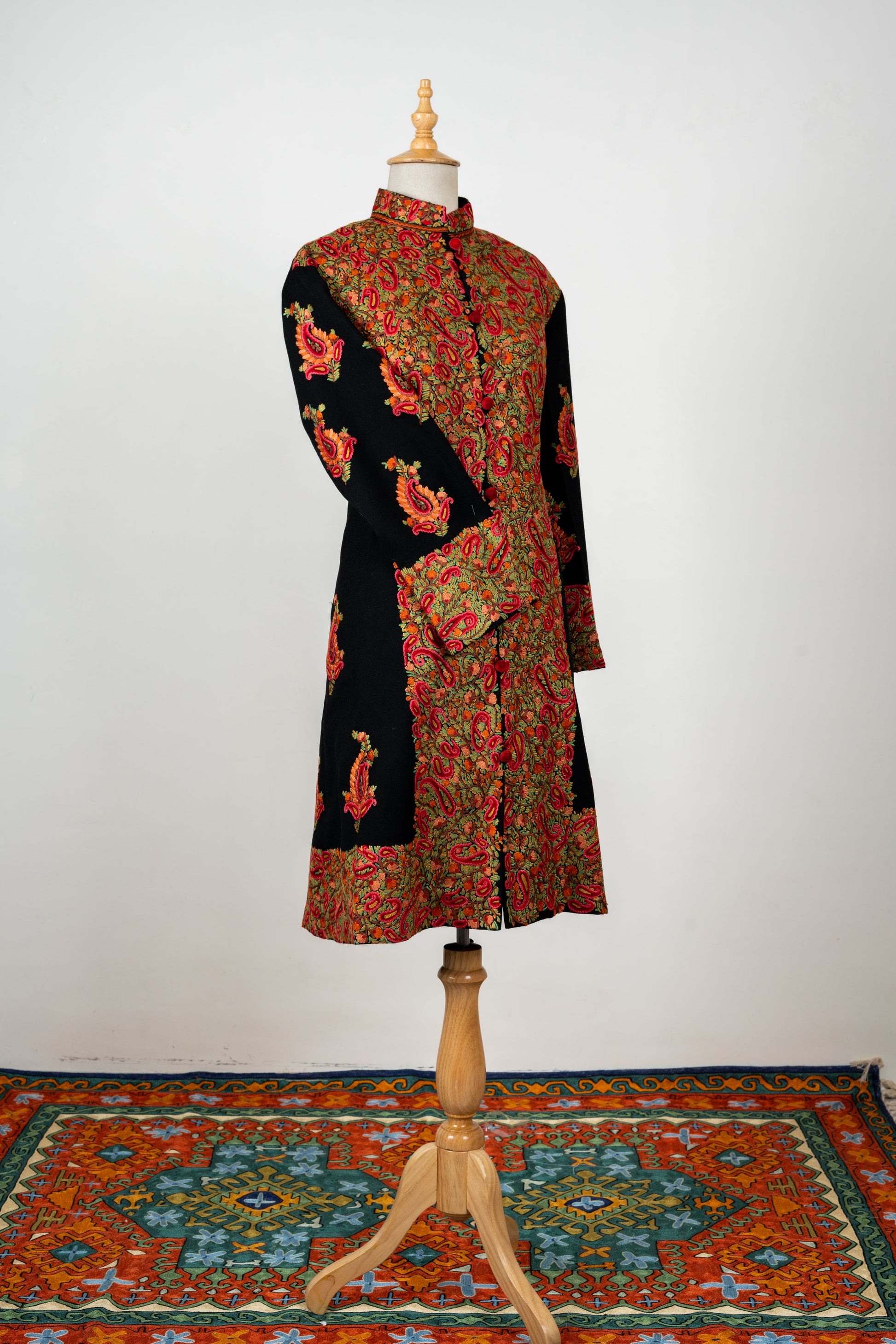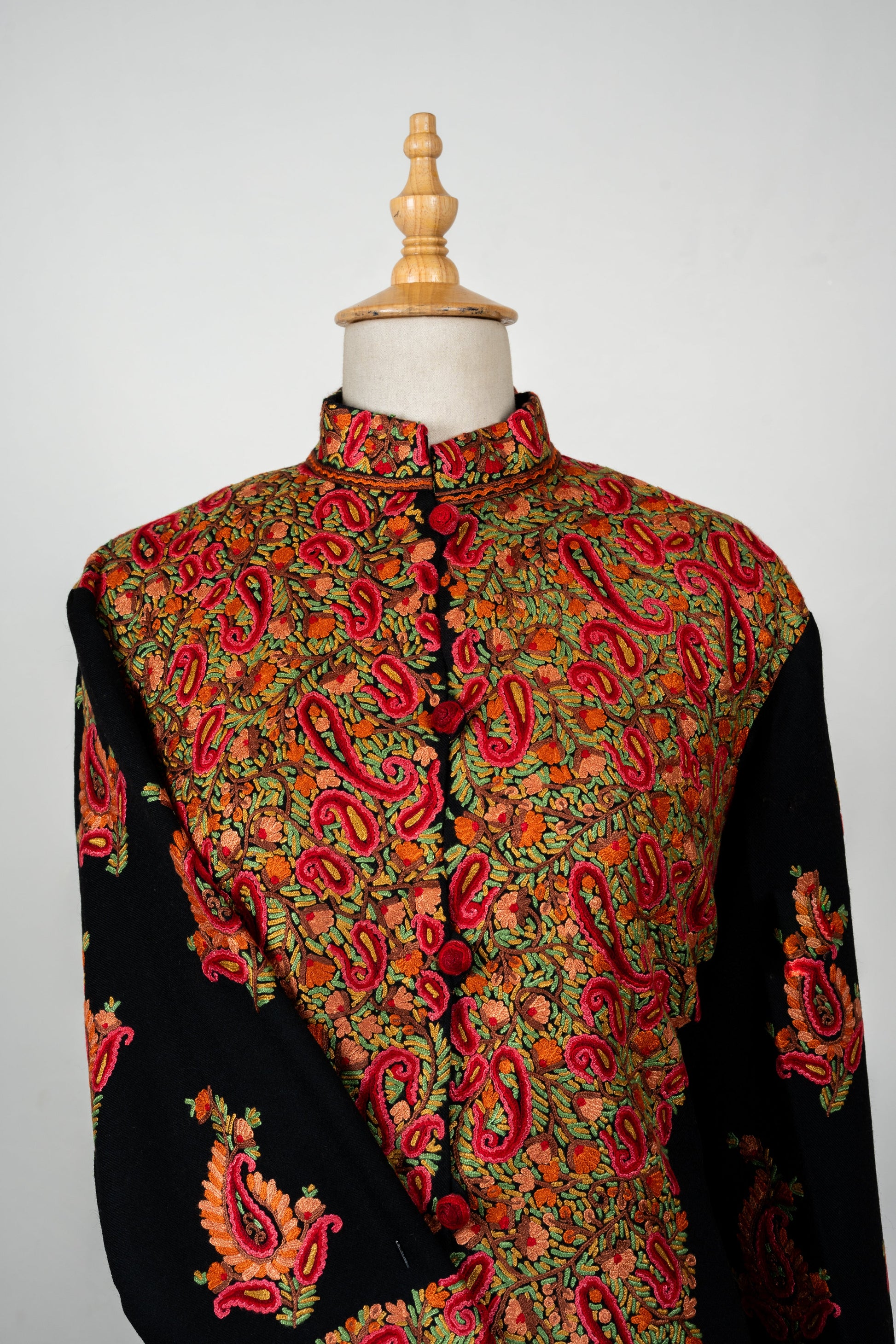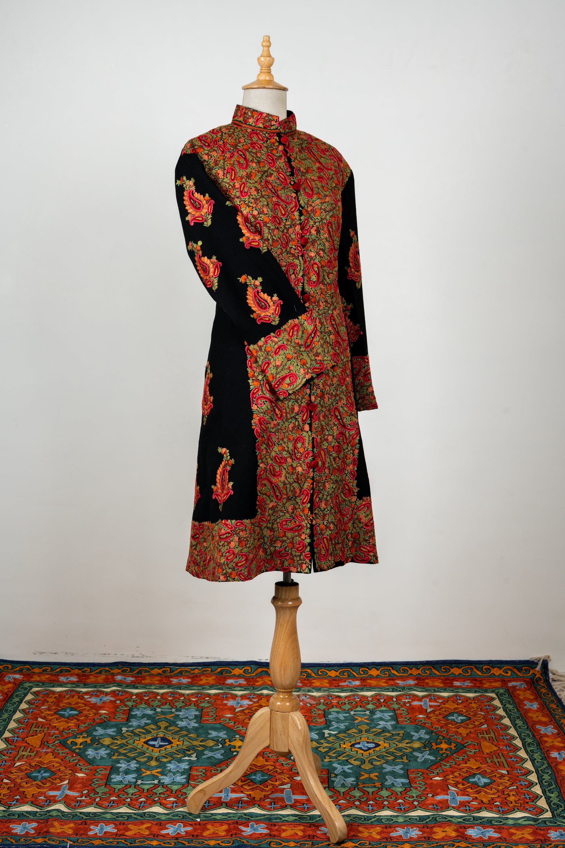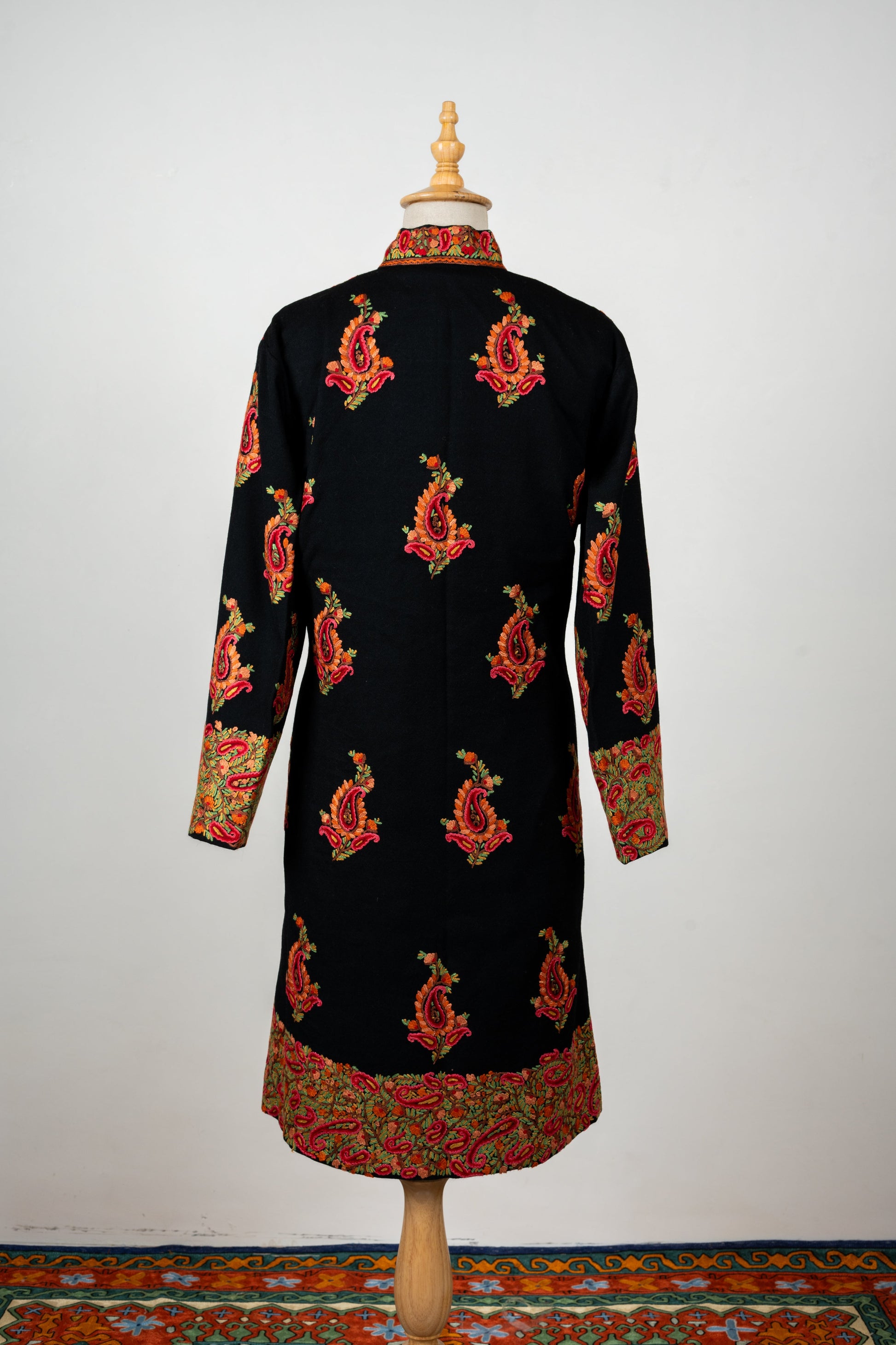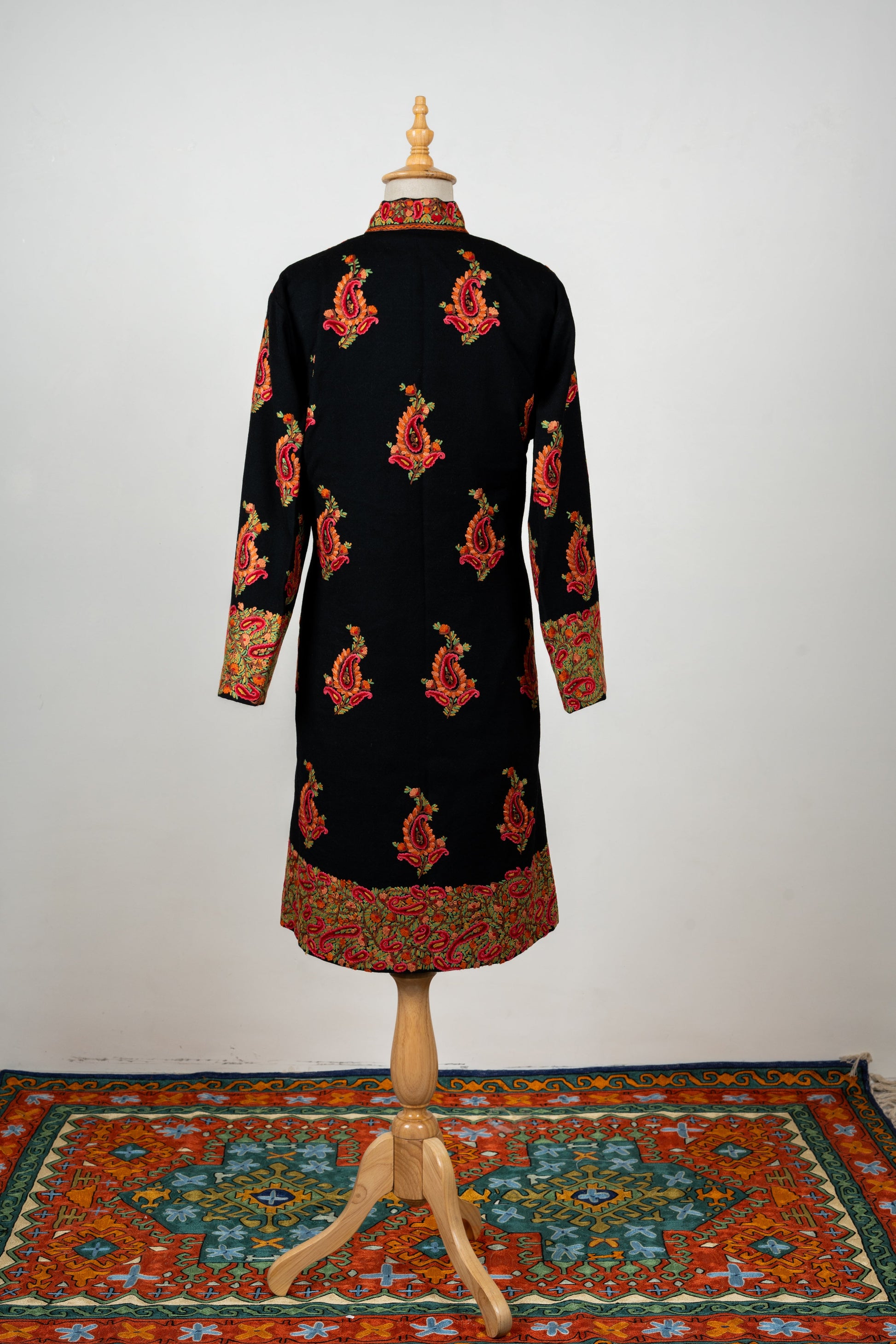Bringing together the richness of mustard, red, and olive threads, this pure wool long jacket is a canvas of finely detailed Aari hand embroidery. The swirling paisleys and floral vines recall the gardens of Kashmir in full bloom.