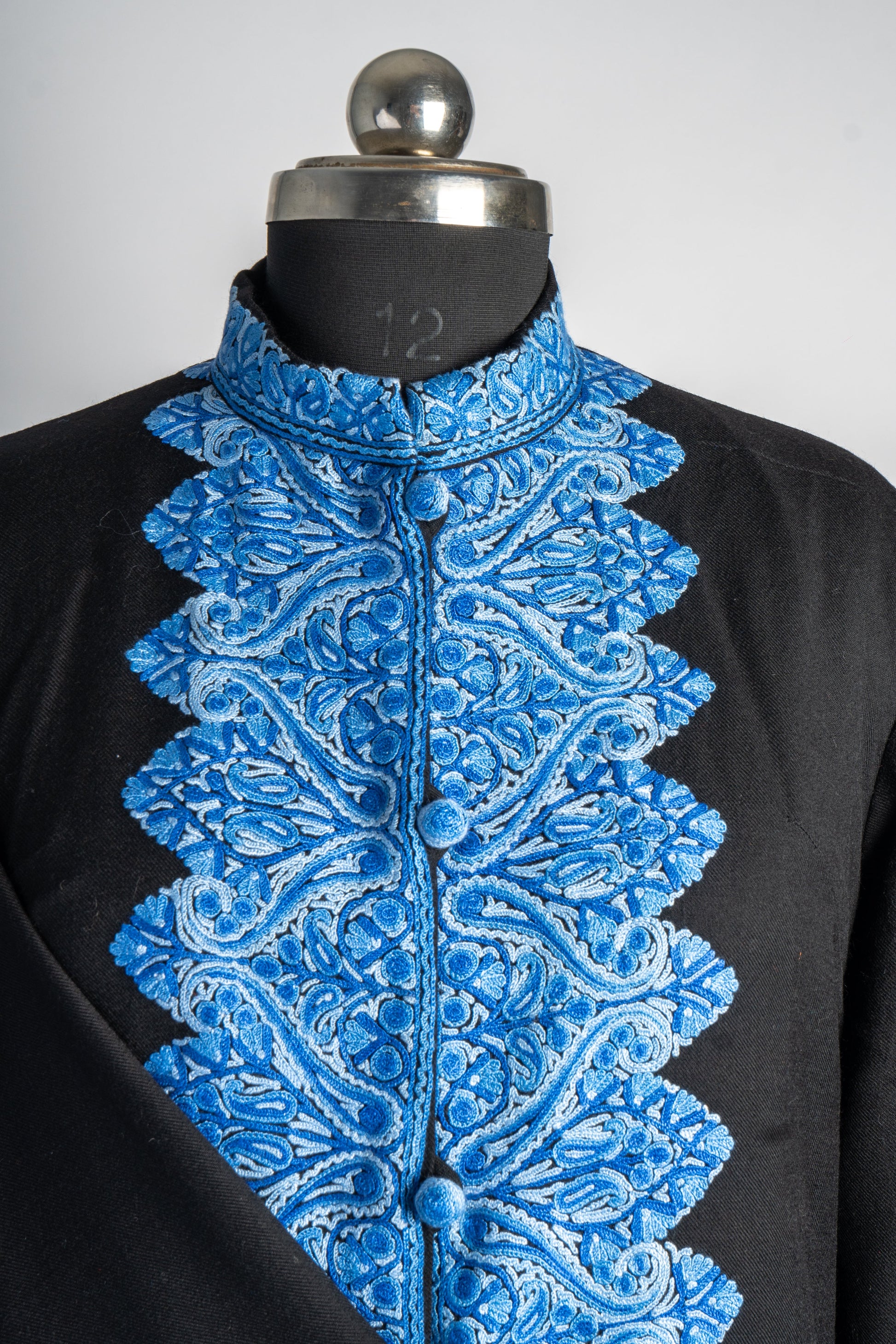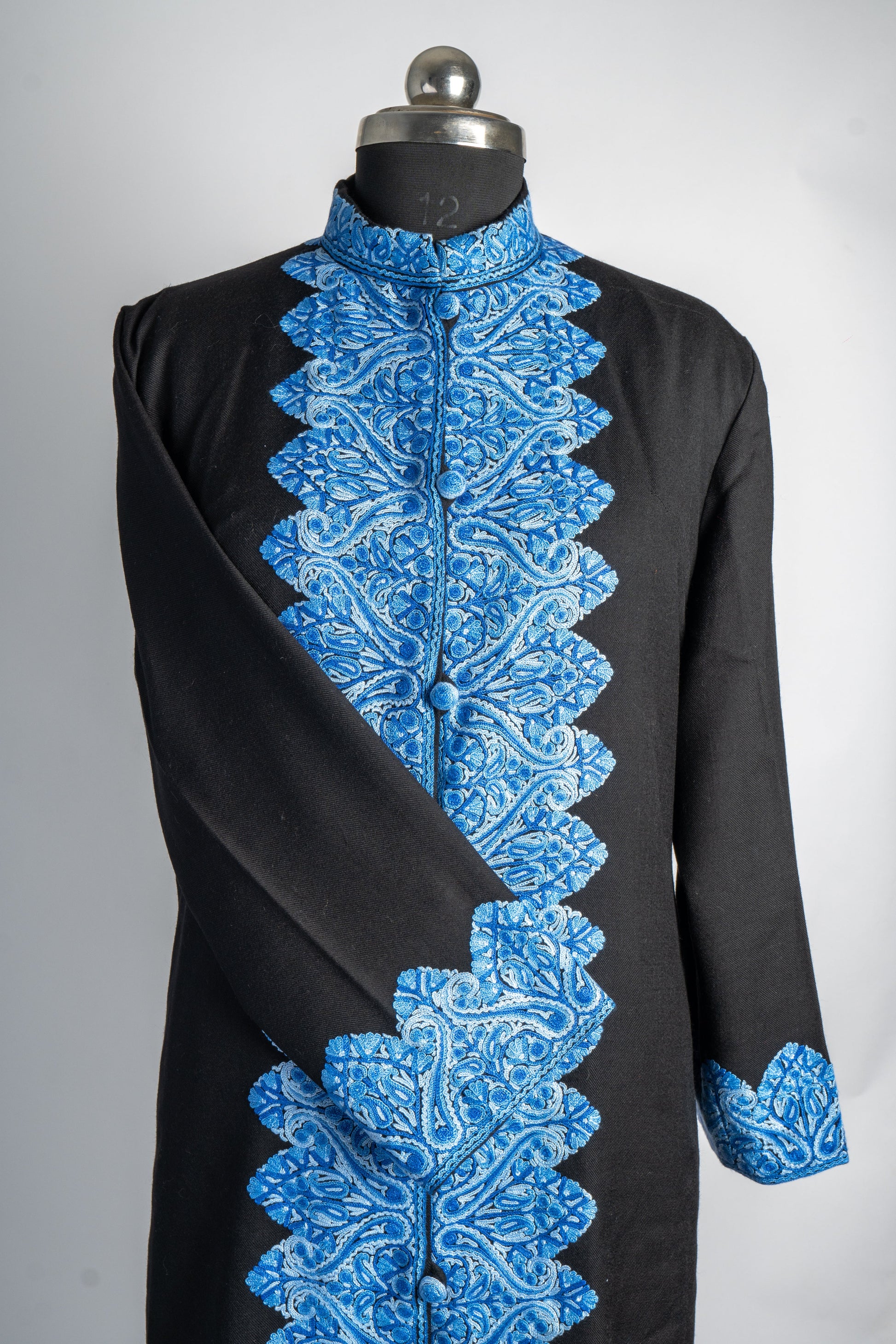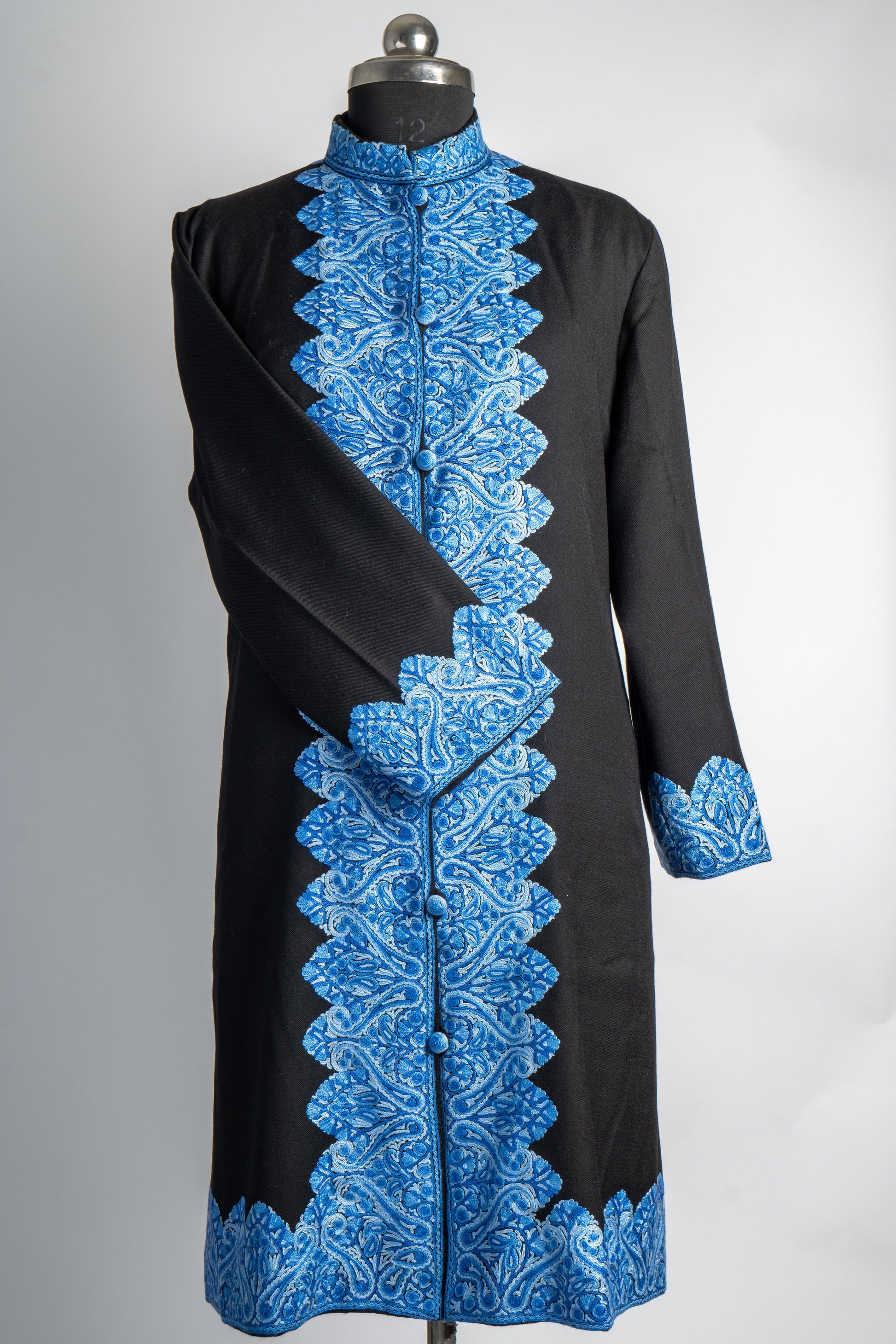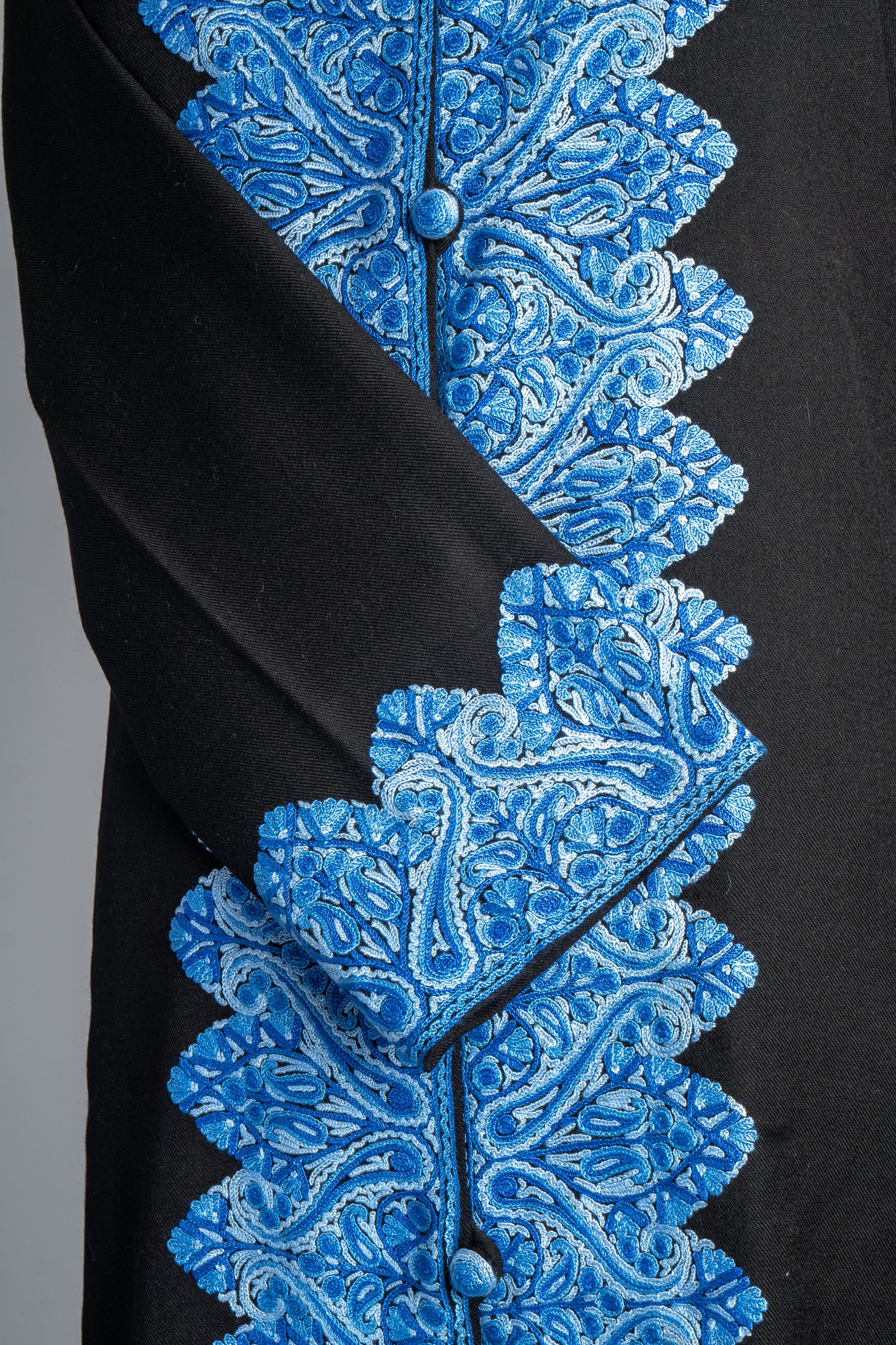 Evoking the calm of a Kashmiri winter sky, the Neela Gulzar Hand Embroidered Jacket features intricate blue embroidery against a classic black canvas. The delicate paisley and floral designs that line the jacket are reminiscent of flowing rivers and serene landscapes. Meticulously hand-embroidered with the centuries-old Aari technique, each stitch showcases the mastery of Kashmiri artisans who have perfected this craft.