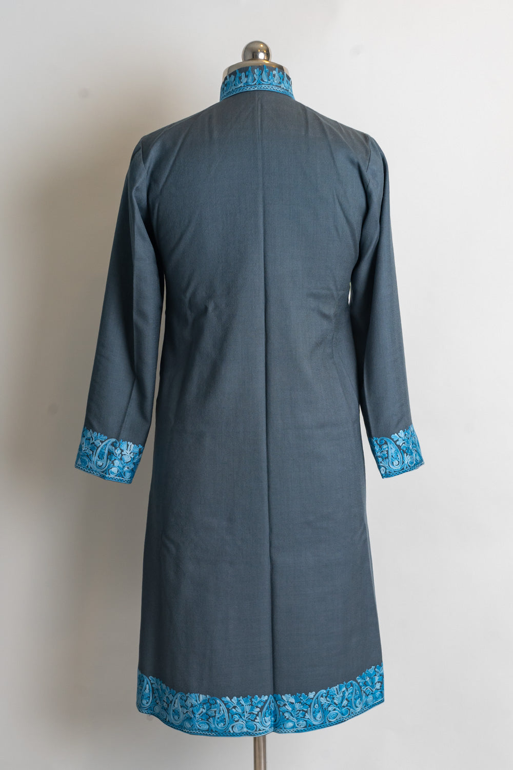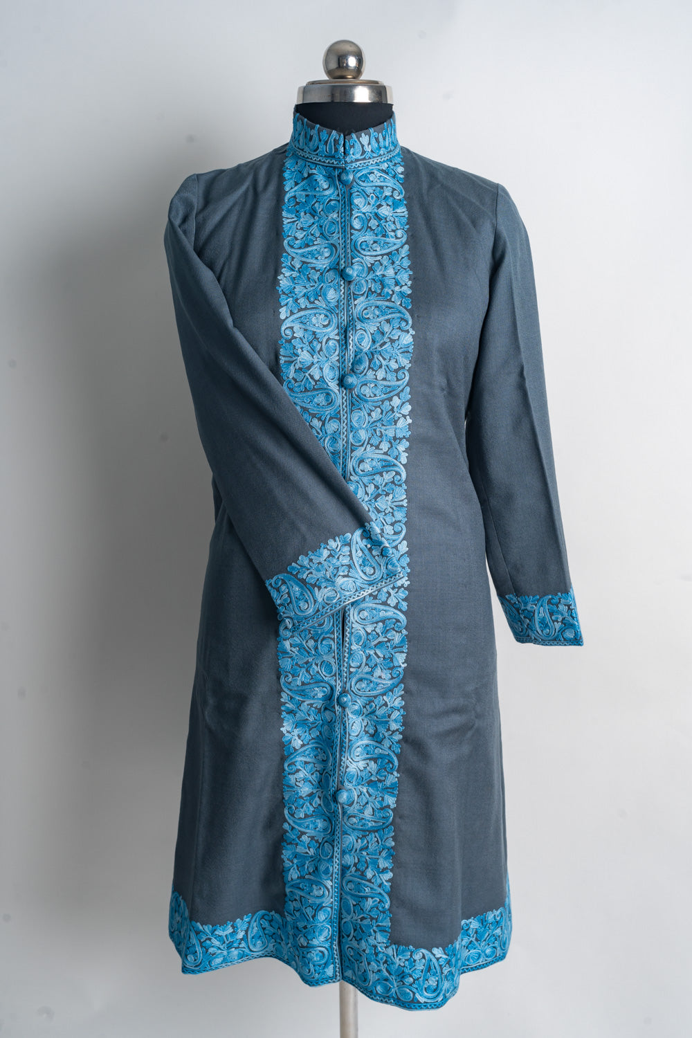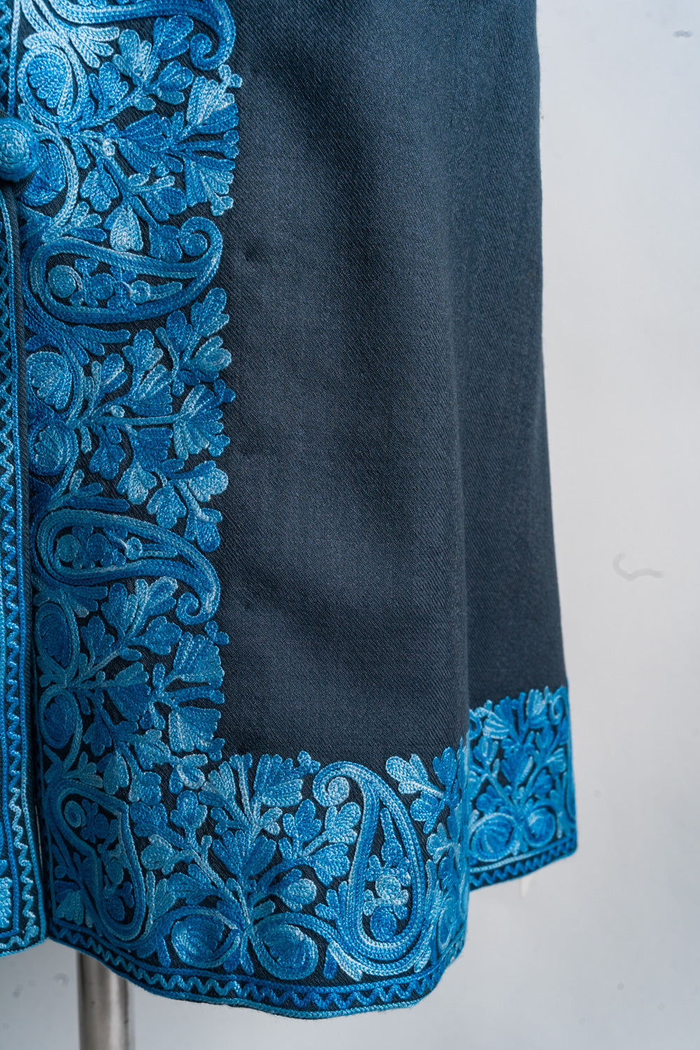 Ideal for both formal and casual settings, this long jacket promises comfort and sophistication. The high collar and tailored fit enhance its elegant appeal, ensuring you make a stylish impression. Embrace the tranquil beauty of Kashmiri embroidery with this exquisite jacket, and let its ocean breeze inspire your wardrobe.