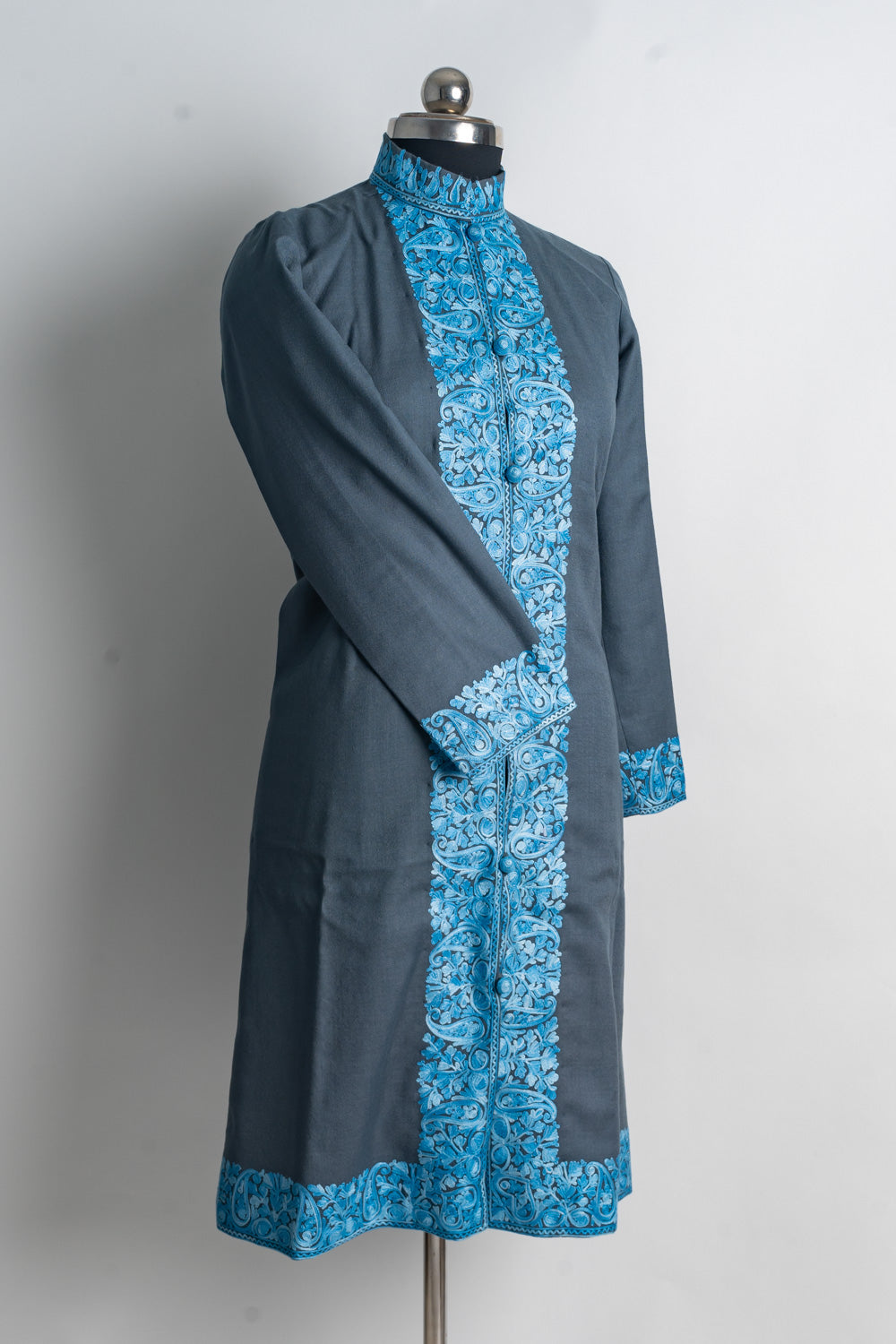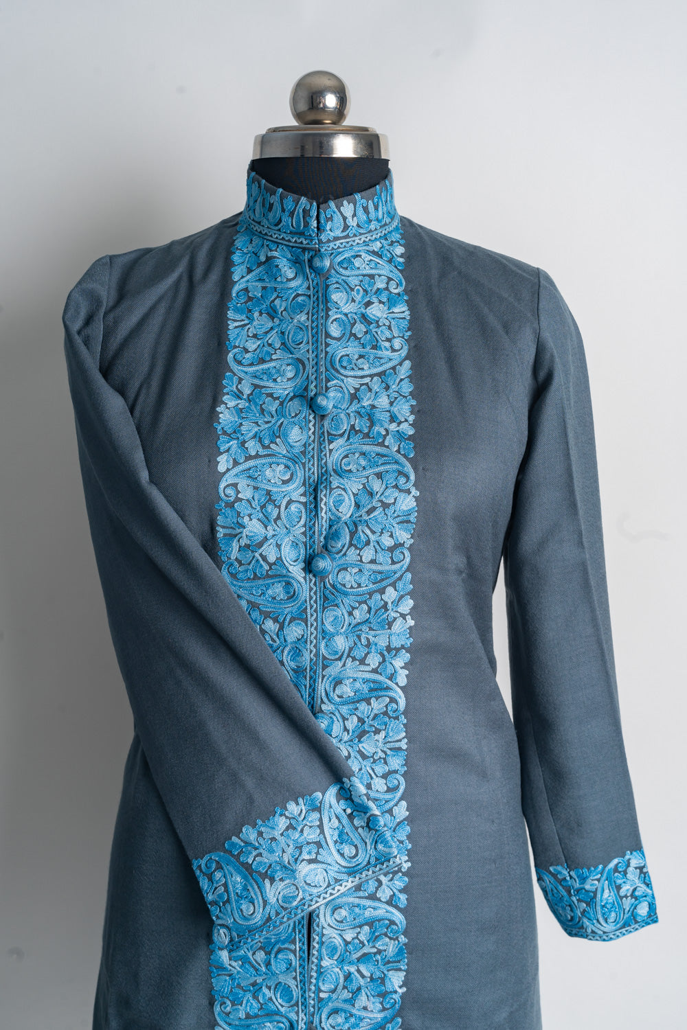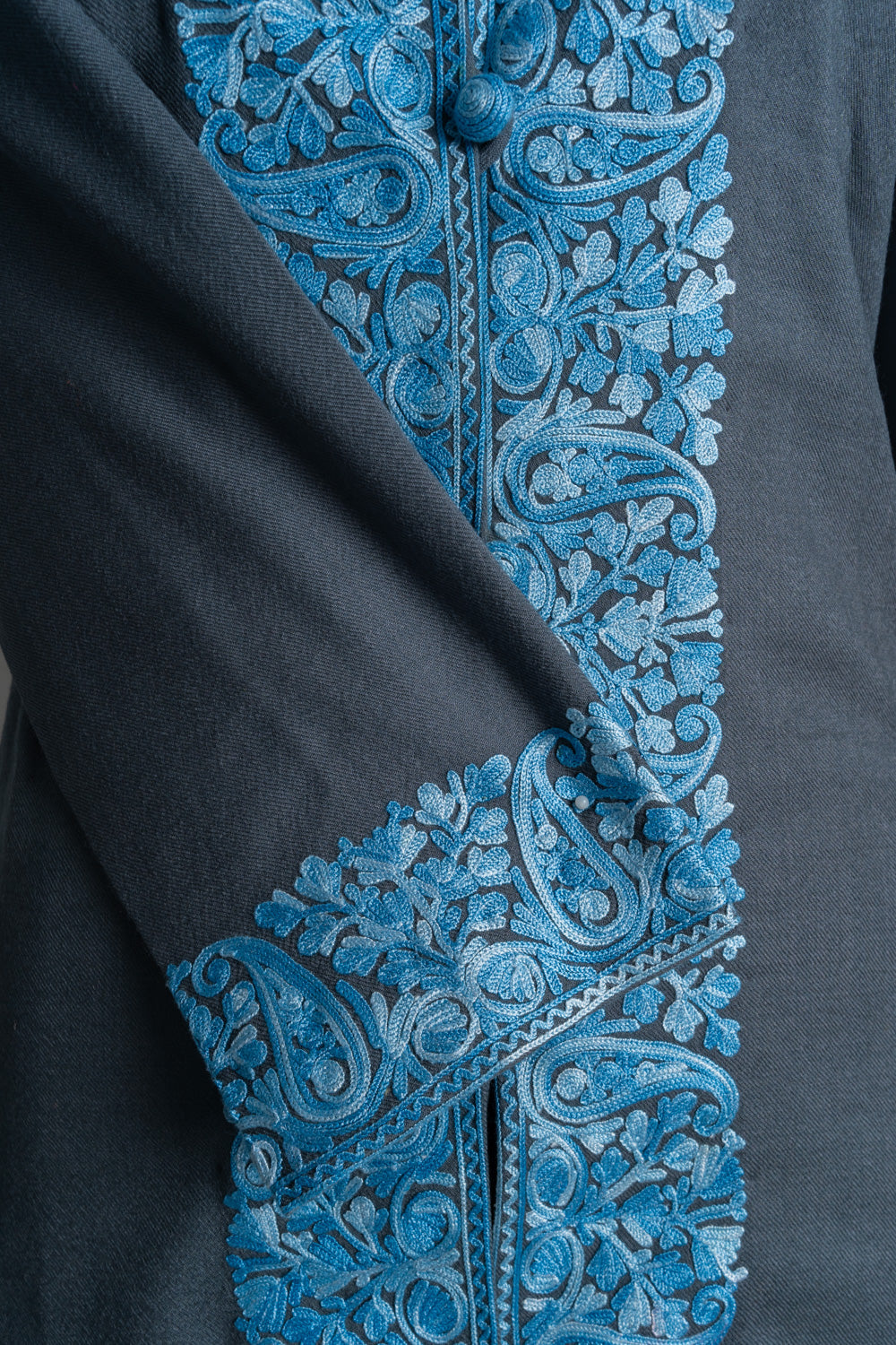 Feel the serene elegance of the Ocean Breeze with our Kashmiri Aari Embroidery Long Jacket. This stunning piece features intricate floral and paisley motifs embroidered in refreshing shades of blue, beautifully set against a cool grey backdrop. The detailed patterns reflect the meticulous craftsmanship of Kashmiri artisans, offering a harmonious blend of tradition and contemporary style.