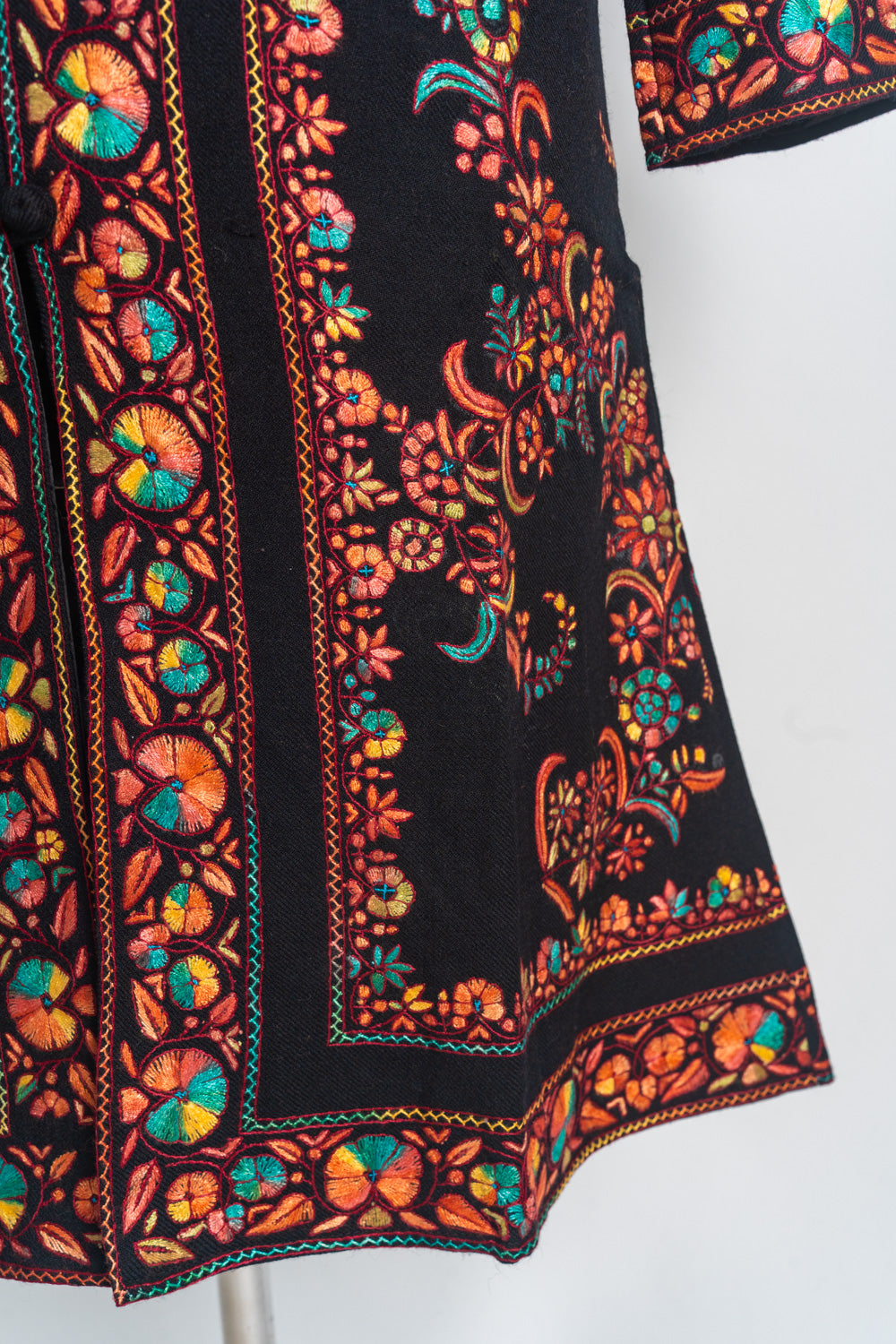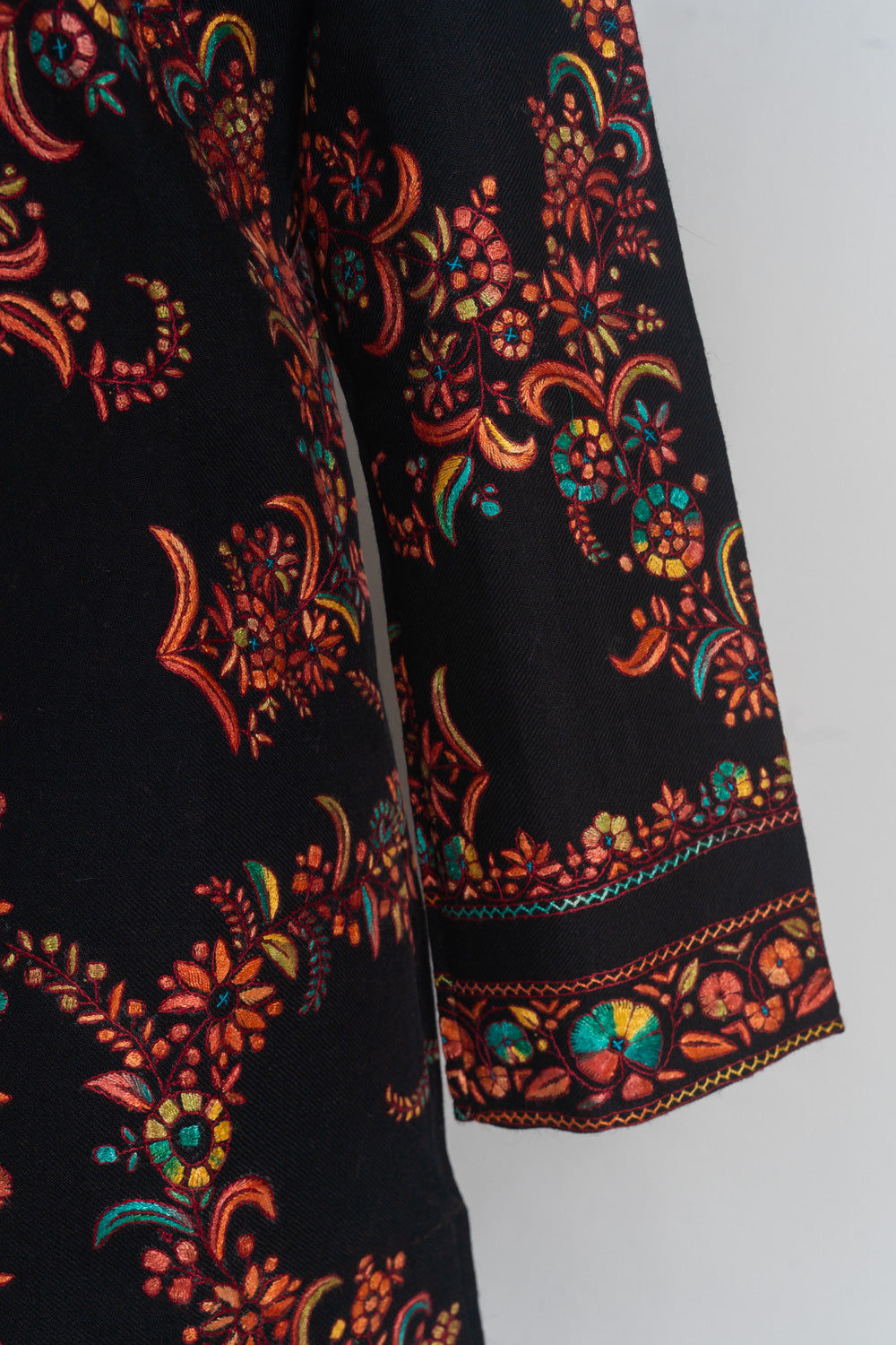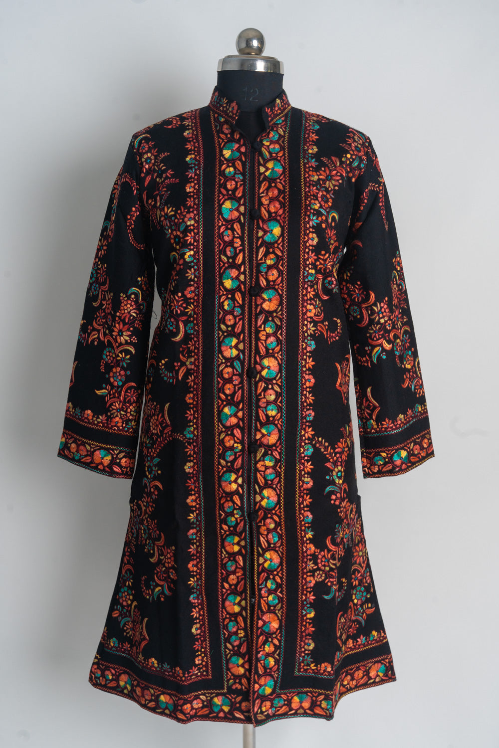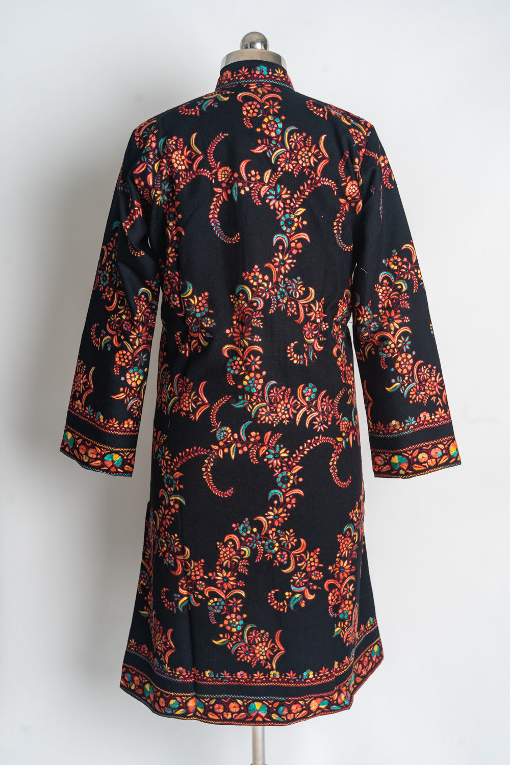 Designed for the discerning fashion enthusiast, this long jacket promises both style and comfort. Its high collar and tailored silhouette ensure a sophisticated look, making it ideal for formal events and special occasions. Embrace the vibrant charm of Kashmir with this exquisite, handcrafted piece, and let its radiant beauty enhance your wardrobe.