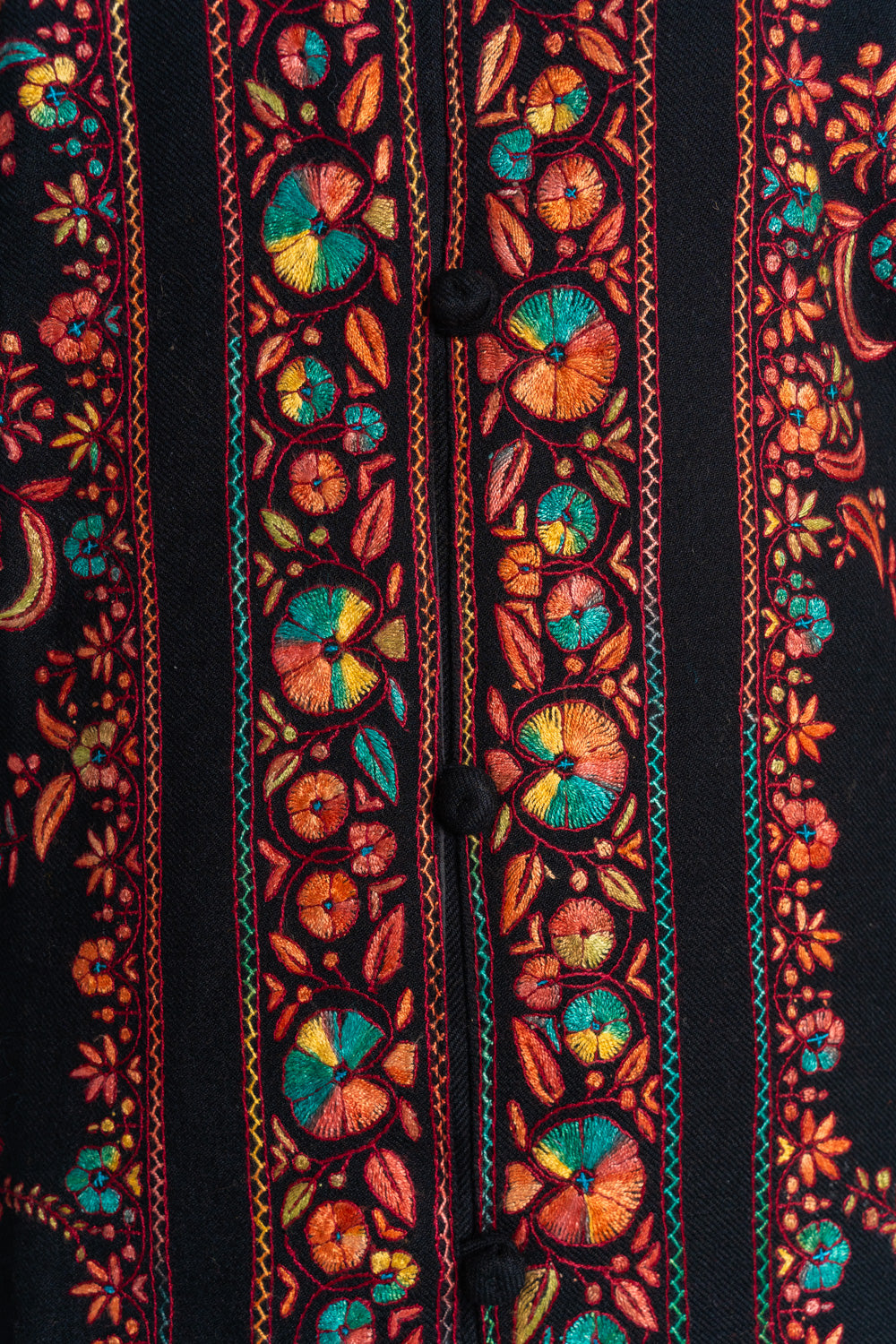Experience the radiant beauty of our Handcrafted Jacket, featuring bold floral motifs in striking red and green hues. Set against a deep black backdrop, the intricate embroidery is meticulously hand-embroidered by our skilled artisans, creating a captivating visual appeal. This jacket embodies the rich cultural heritage and artistic brilliance of Kashmiri craftsmanship, offering a perfect blend of tradition and modern elegance.