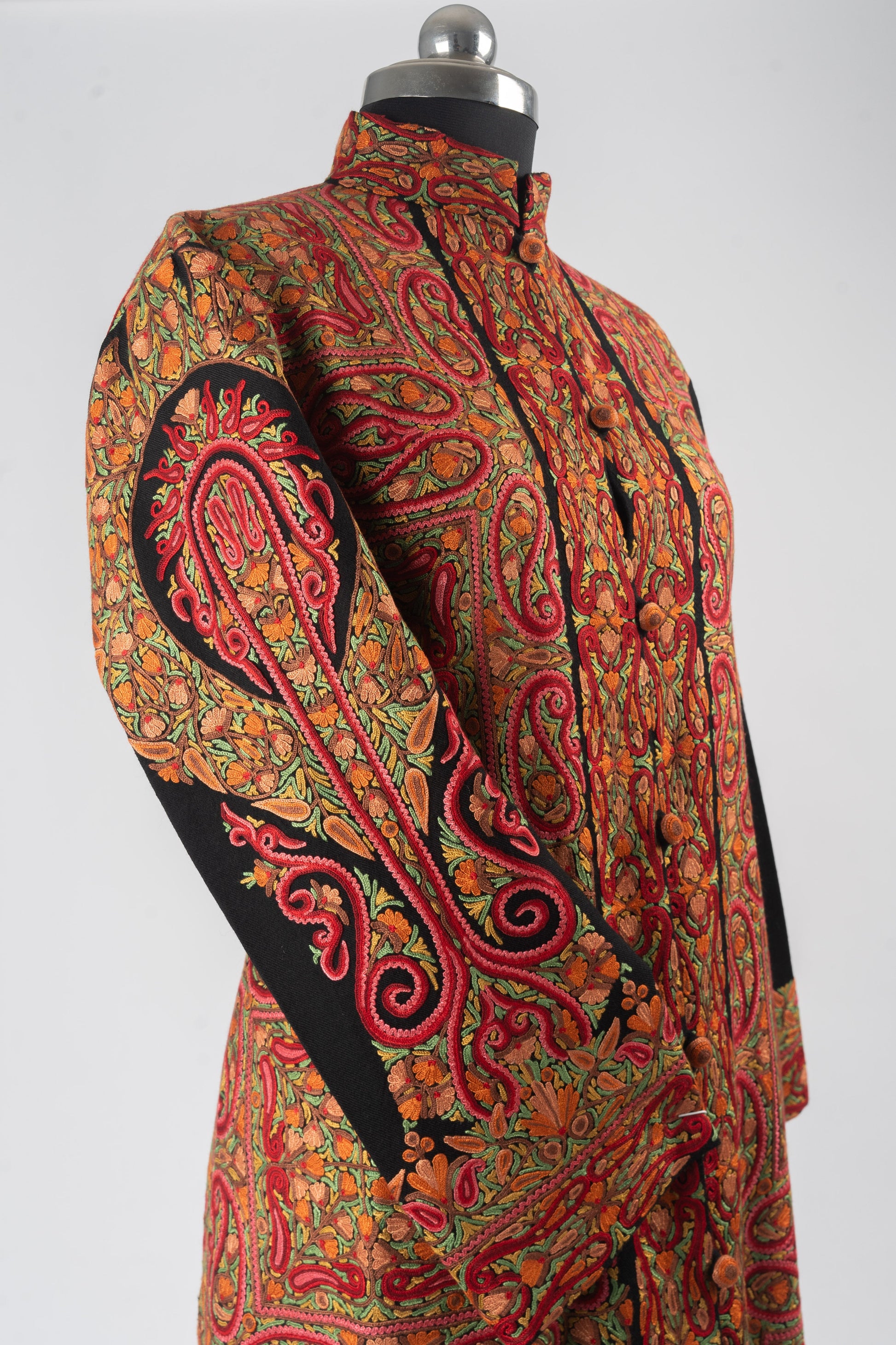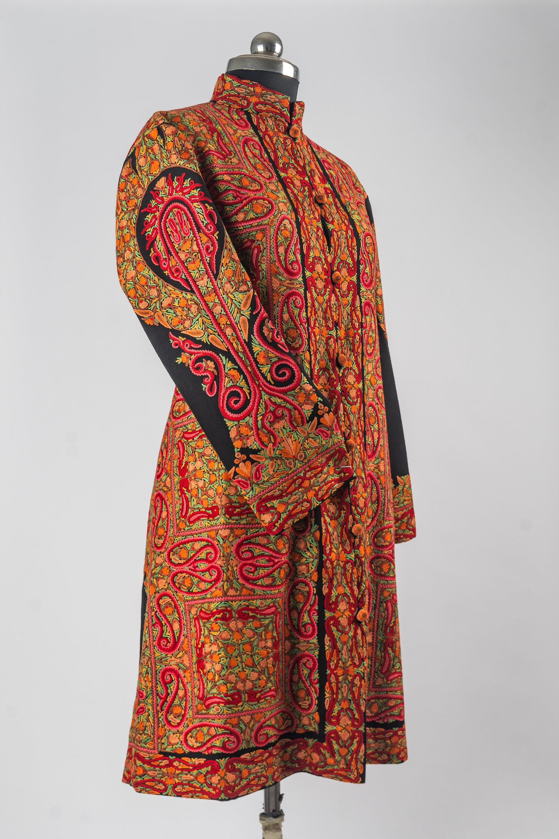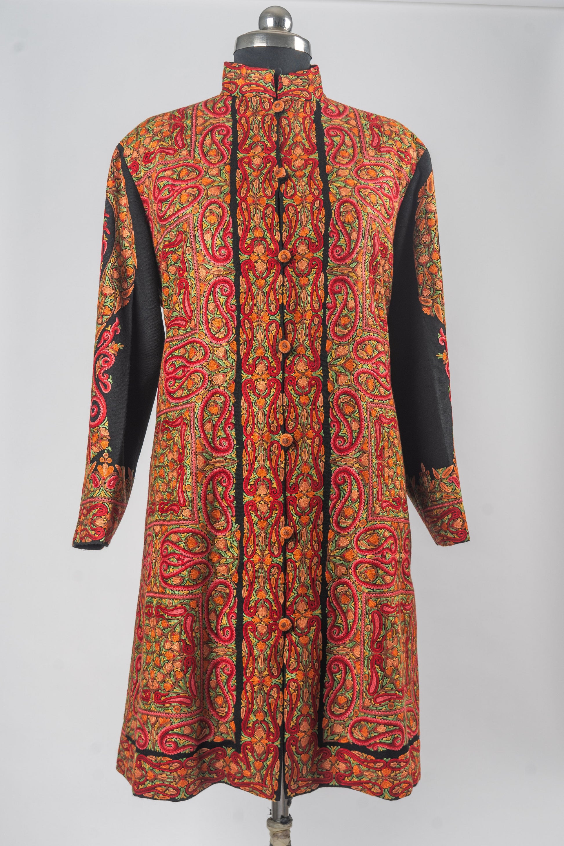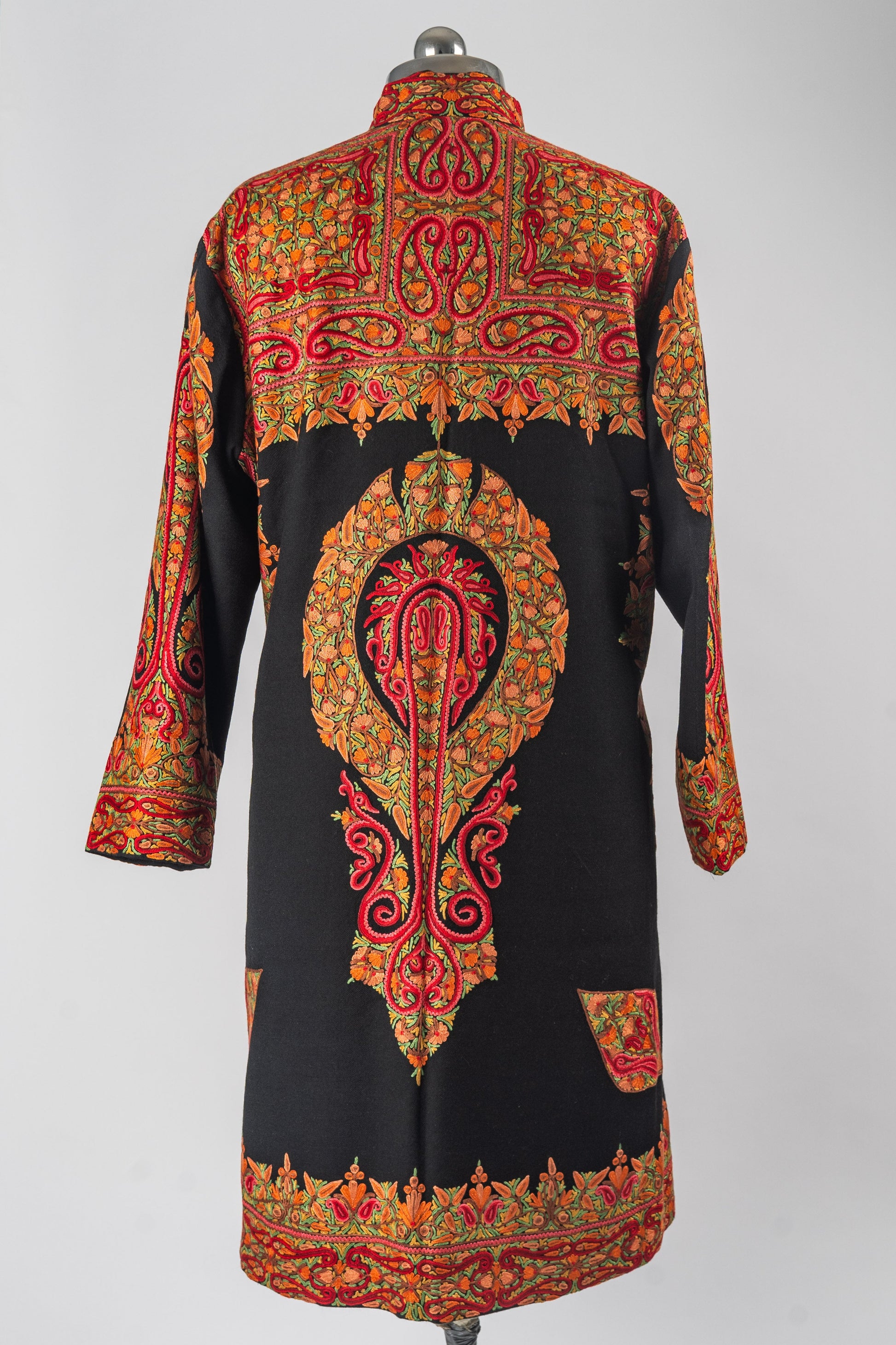 Crafted from the finest Merino wool, this jacket not only exudes warmth but also reflects the essence of Kashmiri heritage in every stitch. Whether worn at a formal gathering or layered for a casual outing, the vibrant details and impeccable craftsmanship of this jacket will make it a centerpiece in your collection. The flattering long-line silhouette and structured fit ensure a graceful drape, blending luxury with comfort. Embrace the legacy of Kashmiri artisanship with this exquisite, statement-making piece.
