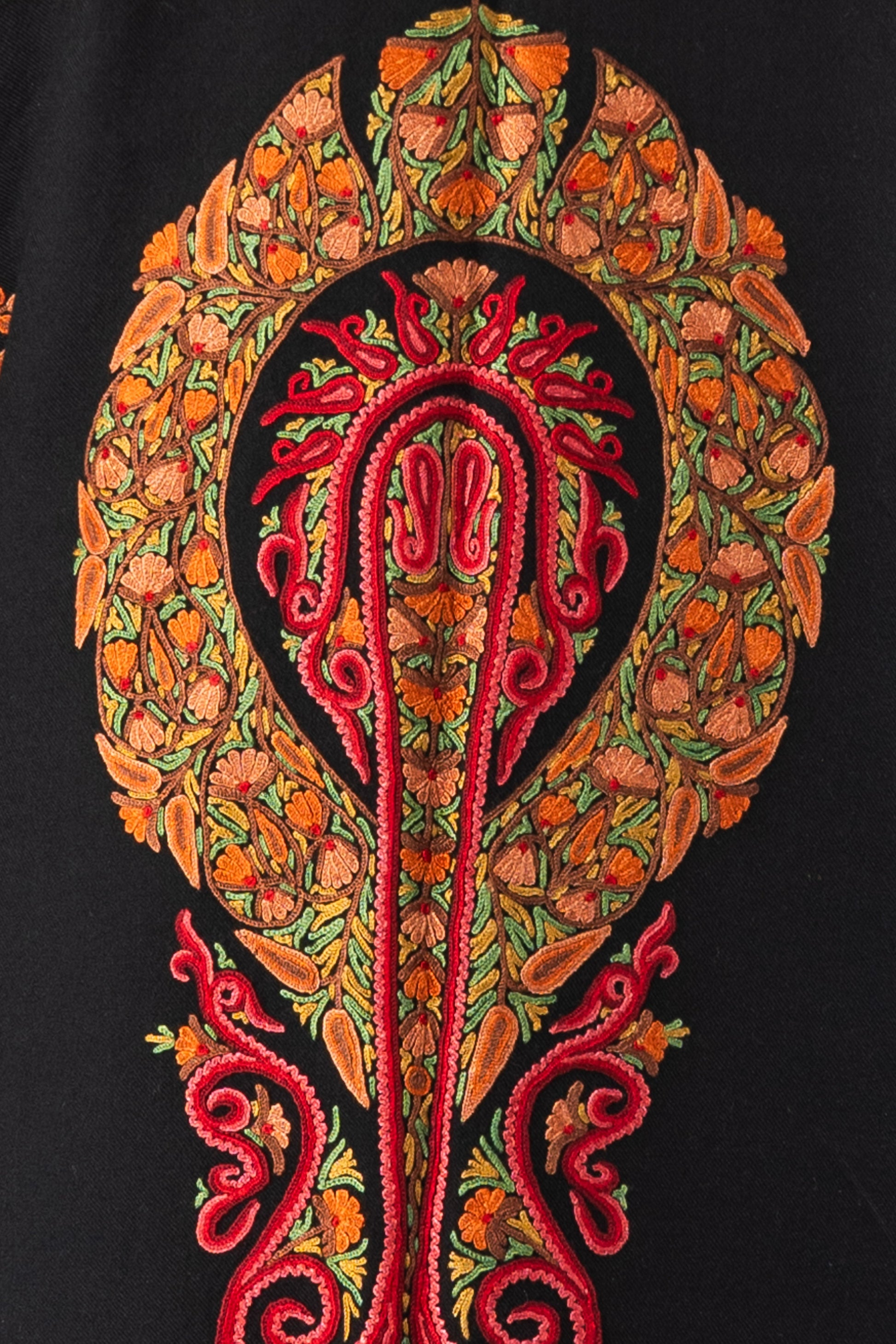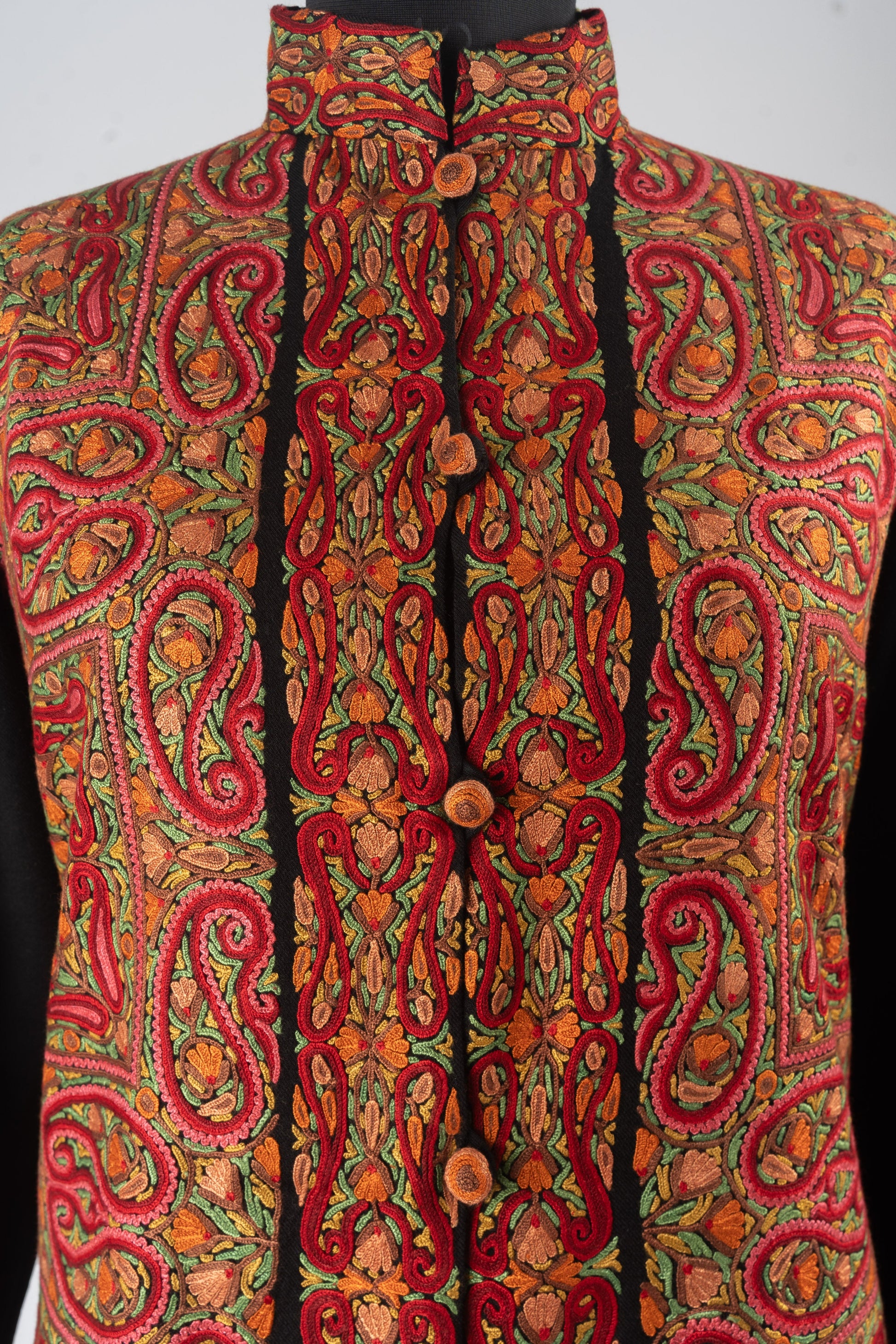 Immerse yourself in the vibrant artistry of Kashmir with this stunning Merino wool jacket, meticulously hand-embroidered using the traditional Aari technique. The rich red, orange, and gold paisley motifs, inspired by centuries-old Kashmiri patterns, dance across the luxurious black base, offering an elegant fusion of culture and modernity. The intricate embroidery on the collar, front panel, and cuffs adds a regal touch, ensuring you stand out with timeless sophistication.