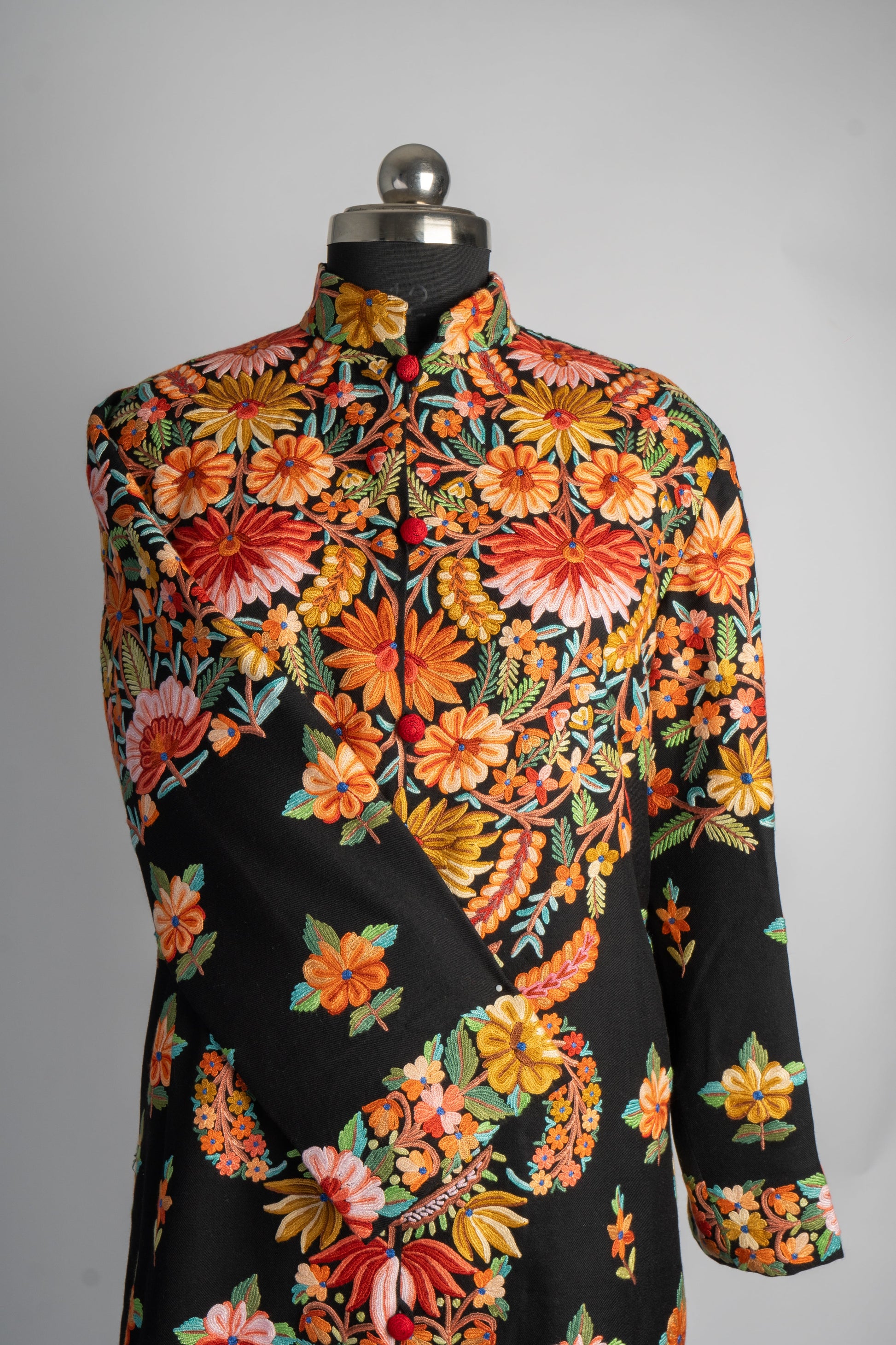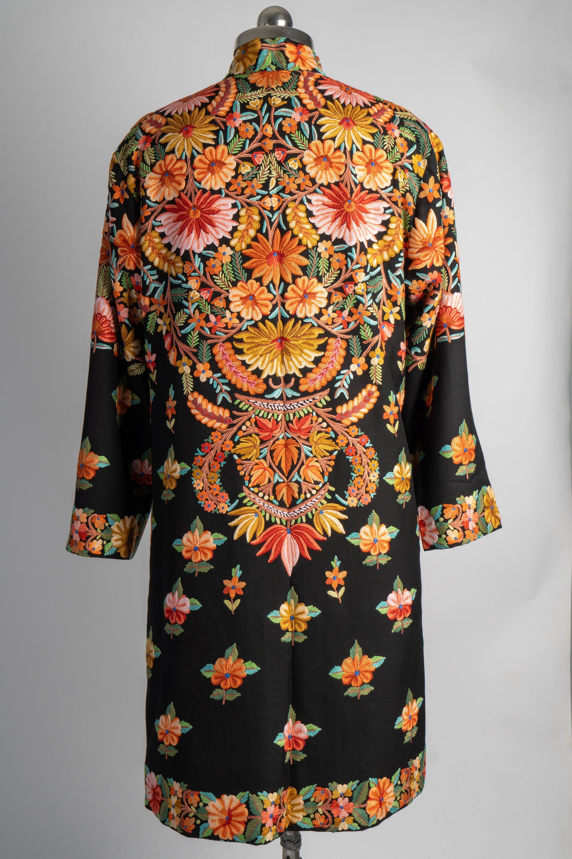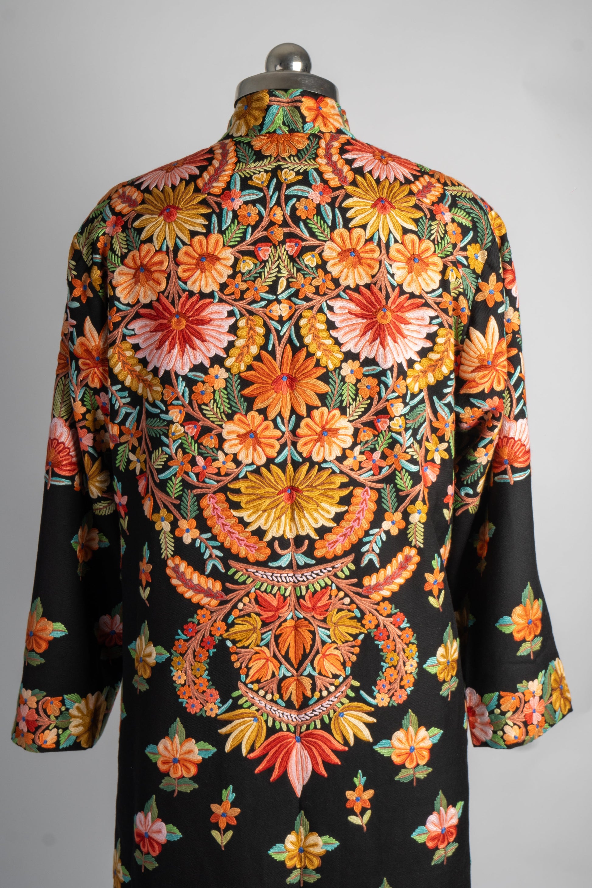 The Rang-e-Kashmir Aari Embroidered Jacket is a riot of colors that highlights the exquisite craftsmanship of Kashmiri artisans. With its vibrant floral patterns meticulously hand-embroidered to cover the back and cascade down the front, this jacket speaks to the joy and vibrancy of traditional Kashmiri art. The vivid oranges, yellows, and greens pop against the deep black fabric, giving it a regal, festive appeal.