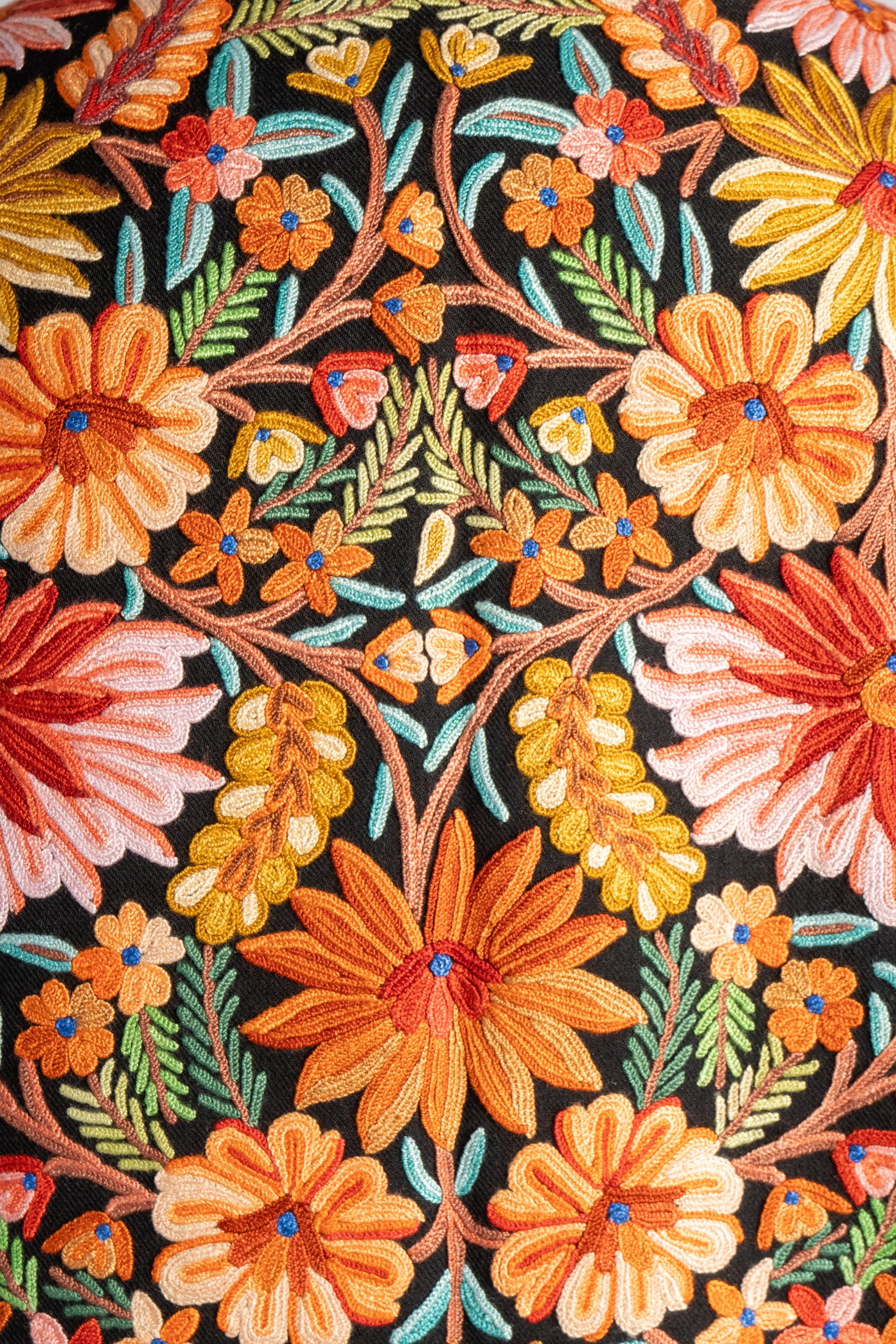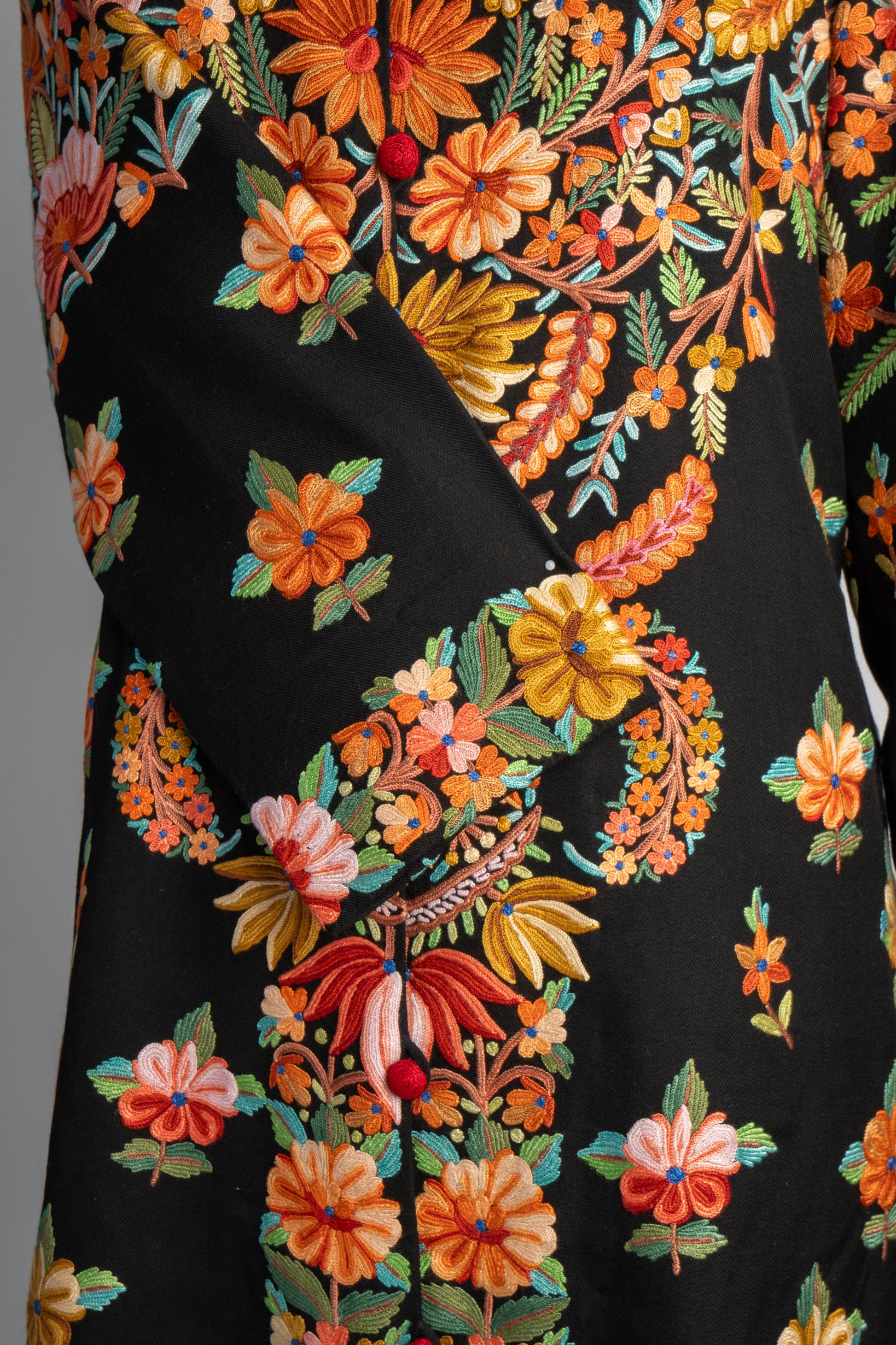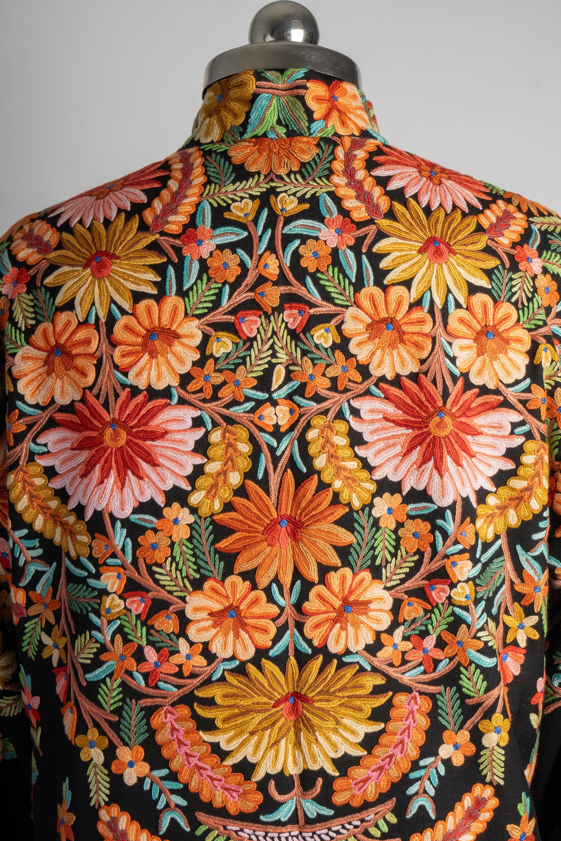The Rang-e-Kashmir Aari Embroidered Jacket is a riot of colors that highlights the exquisite craftsmanship of Kashmiri artisans. With its vibrant floral patterns meticulously hand-embroidered to cover the back and cascade down the front, this jacket speaks to the joy and vibrancy of traditional Kashmiri art. The vivid oranges, yellows, and greens pop against the deep black fabric, giving it a regal, festive appeal.