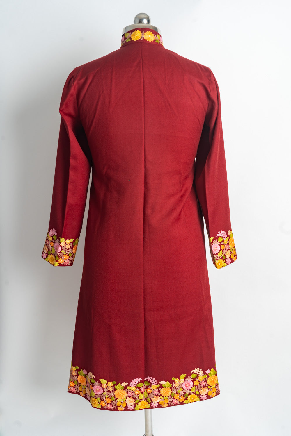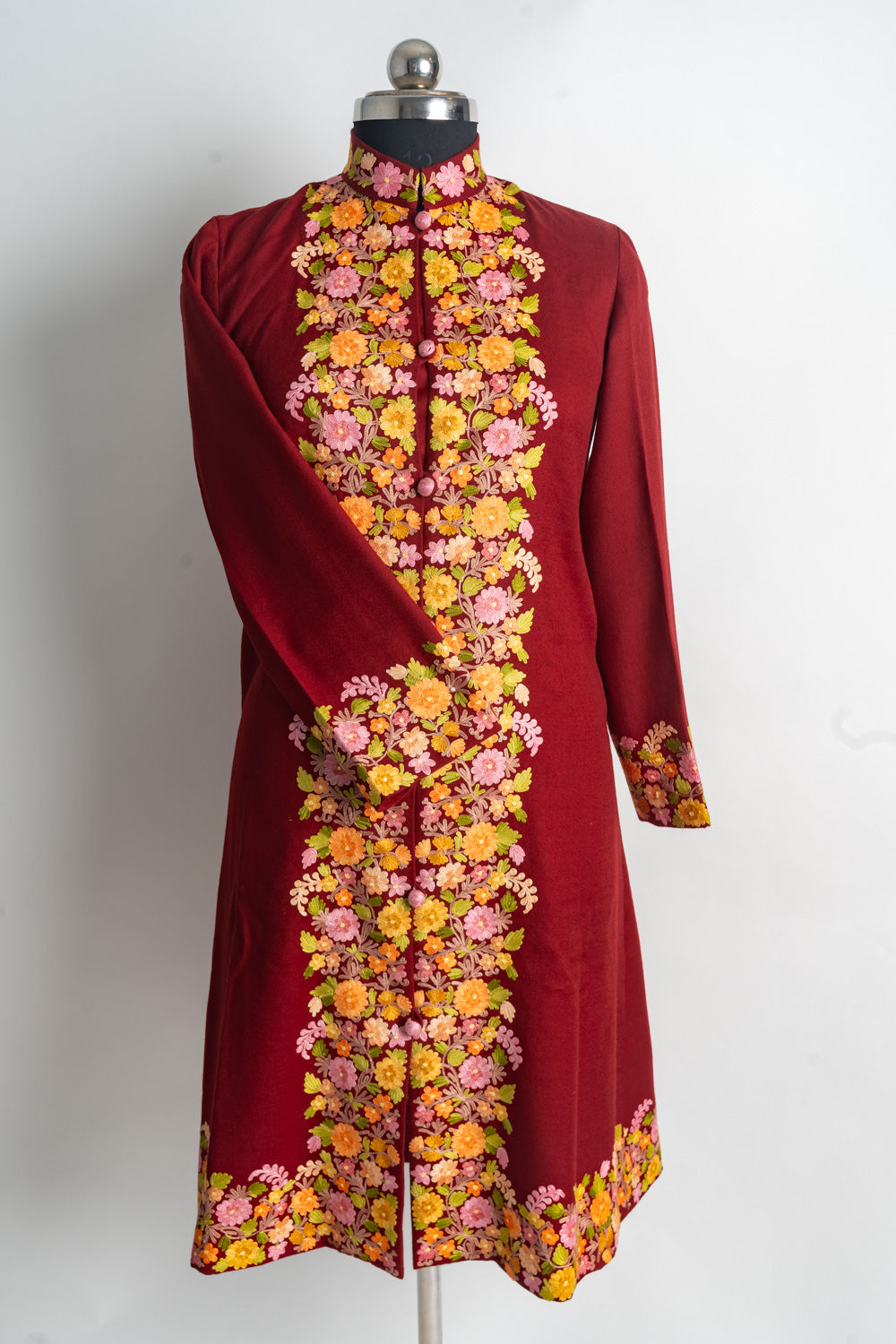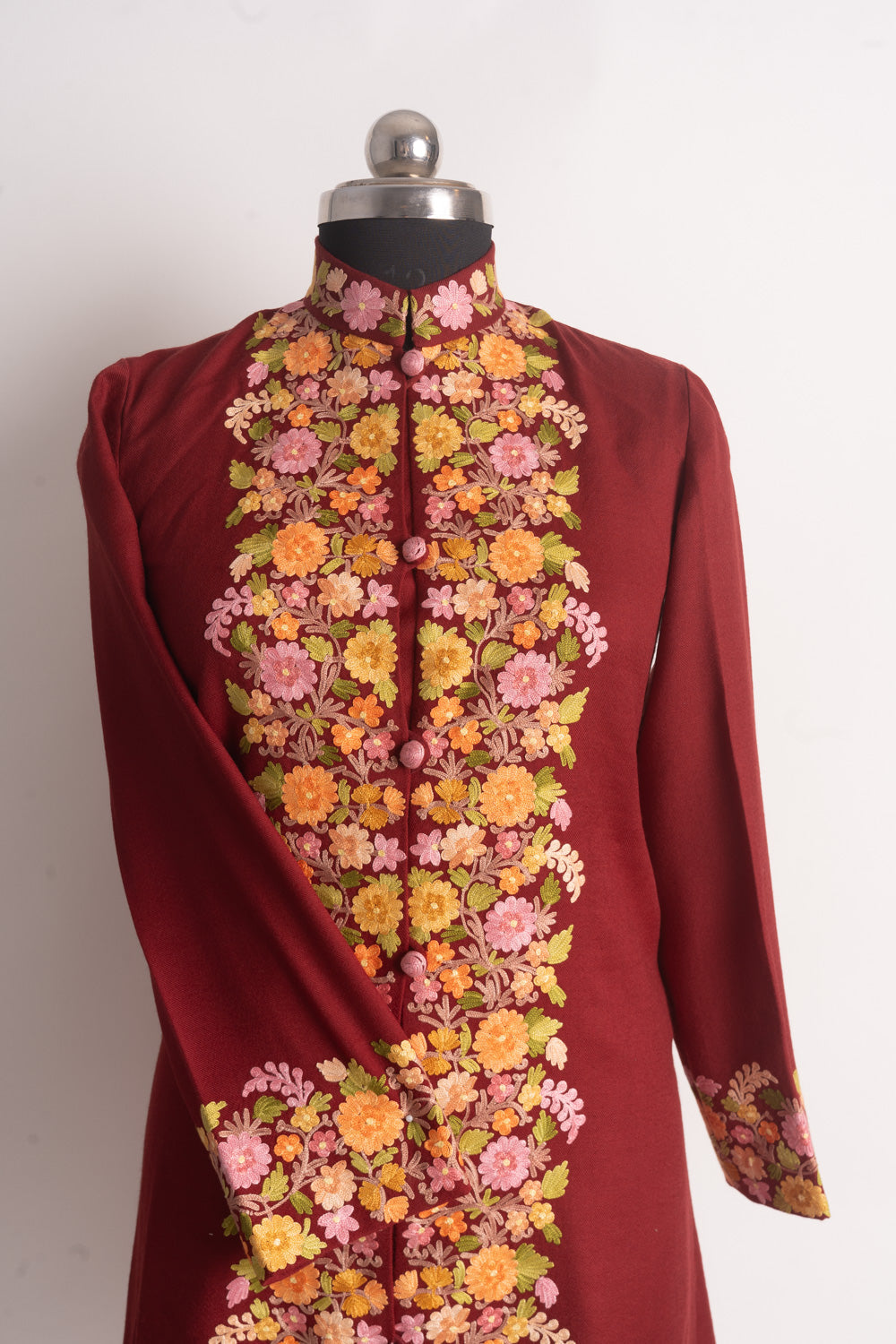 Designed for both formal gatherings and festive occasions, this long jacket combines comfort and sophistication. The high collar and tailored fit add a touch of modern elegance, ensuring you make a lasting impression. Embrace the timeless charm of Kashmiri embroidery with this stunning jacket, and let its ruby blossoms elevate your fashion statement.