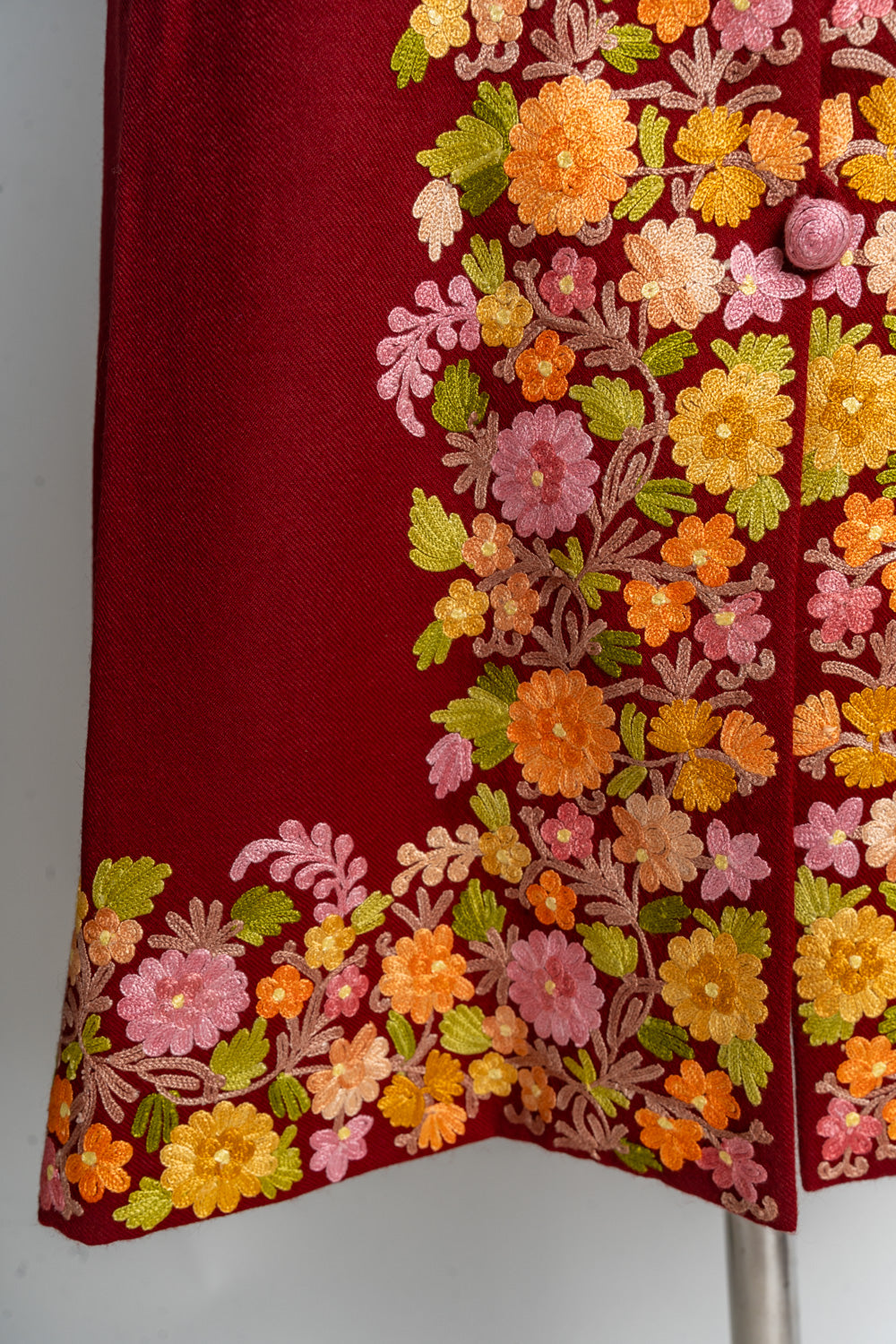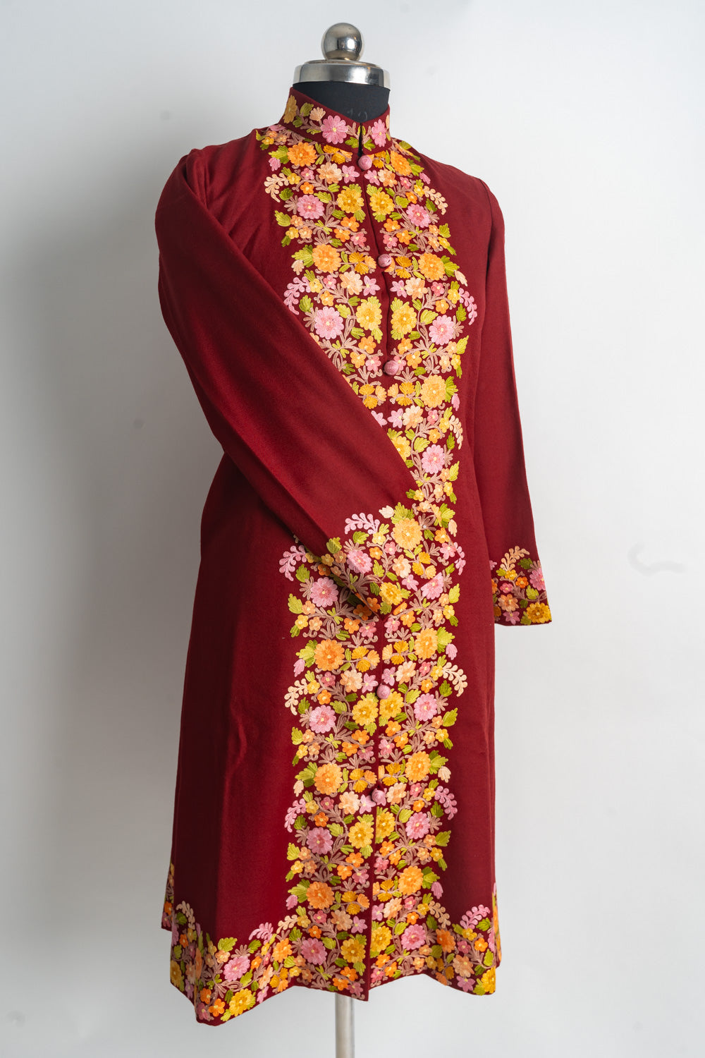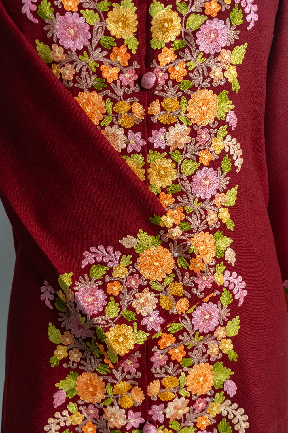 Designed for both formal gatherings and festive occasions, this long jacket combines comfort and sophistication. The high collar and tailored fit add a touch of modern elegance, ensuring you make a lasting impression. Embrace the timeless charm of Kashmiri embroidery with this stunning jacket, and let its ruby blossoms elevate your fashion statement.