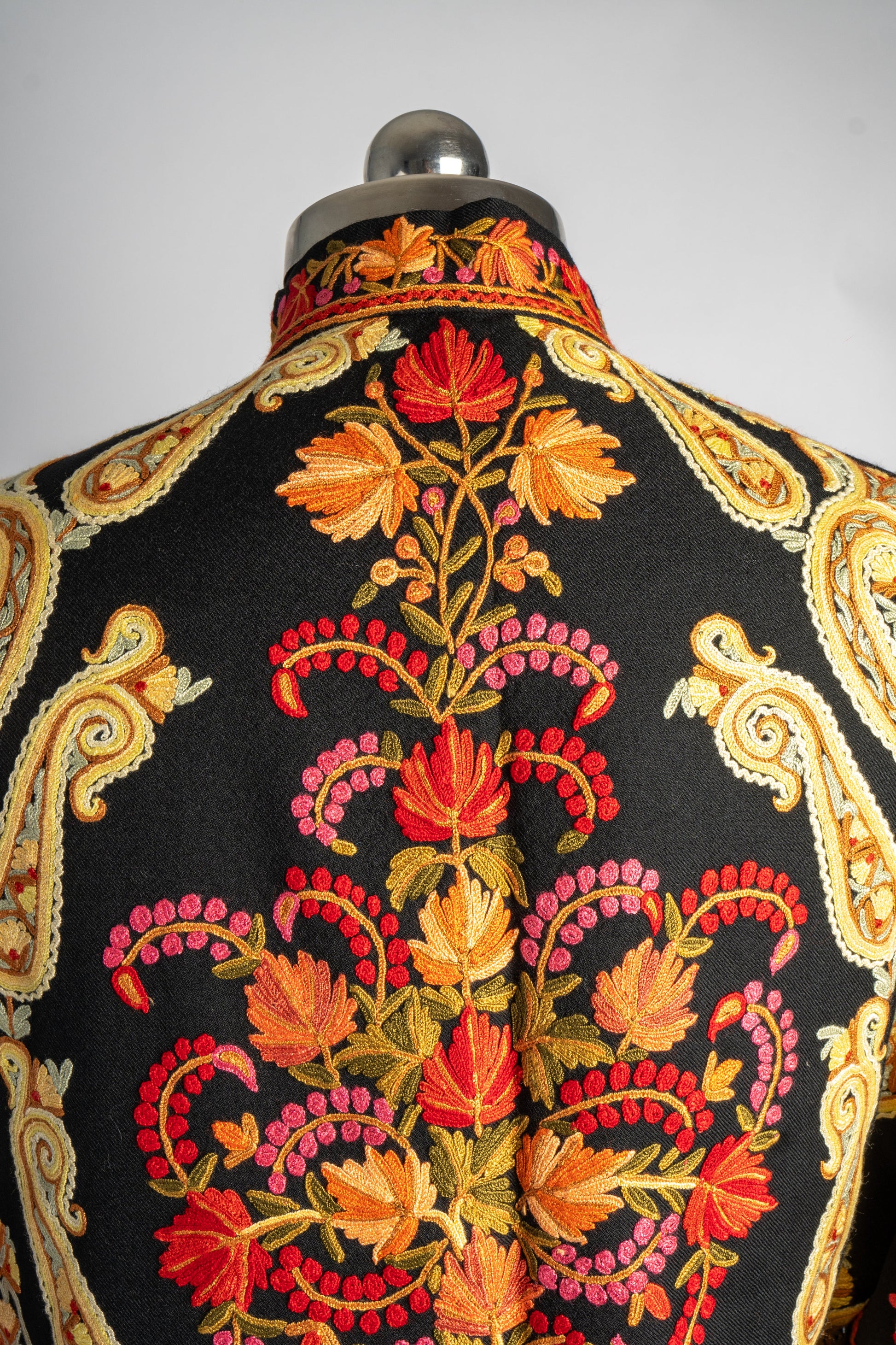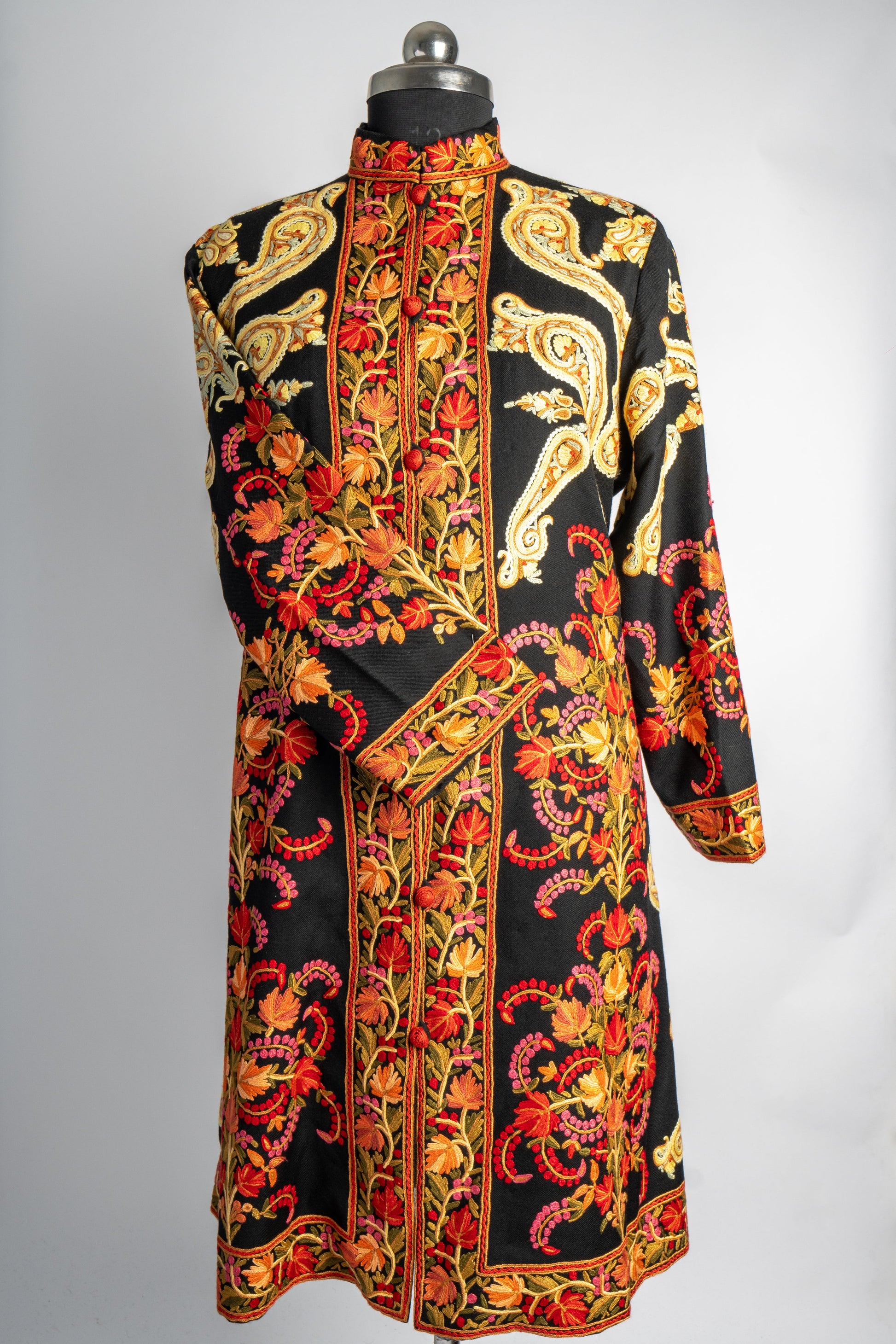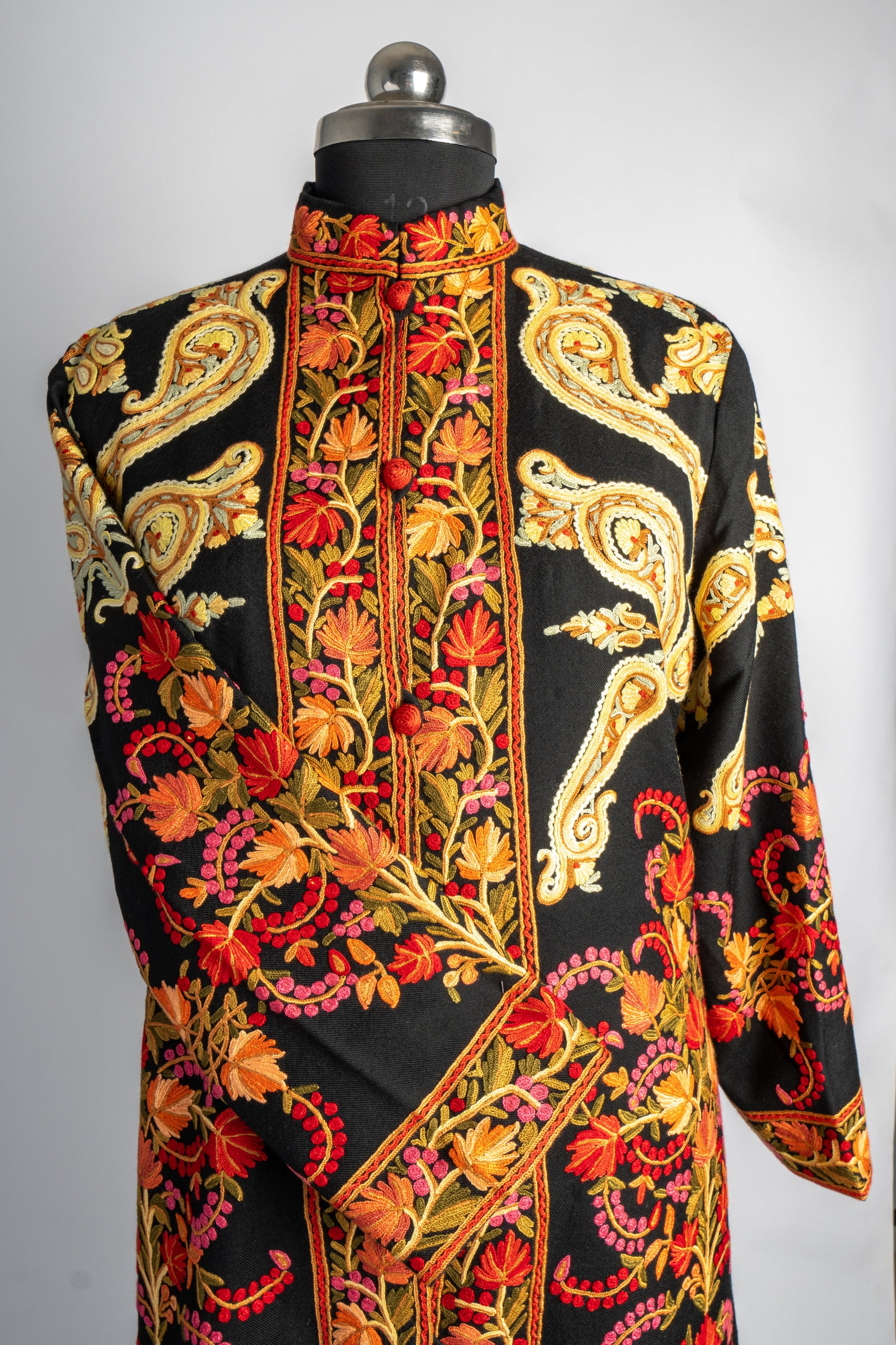 Dramatic and fiery, the Shamsheer Aari Hand Embroidered Jacket captures the boldness of Kashmiri tradition in rich tones of red, orange, and gold. Painstakingly hand-embroidered by skilled artisans, the intricate Aari work flows seamlessly across the jacket, with paisley and floral motifs that tell a story of cultural richness and artistic flair. The black background serves to highlight the warmth of the fiery hues, creating a striking contrast that draws the eye.