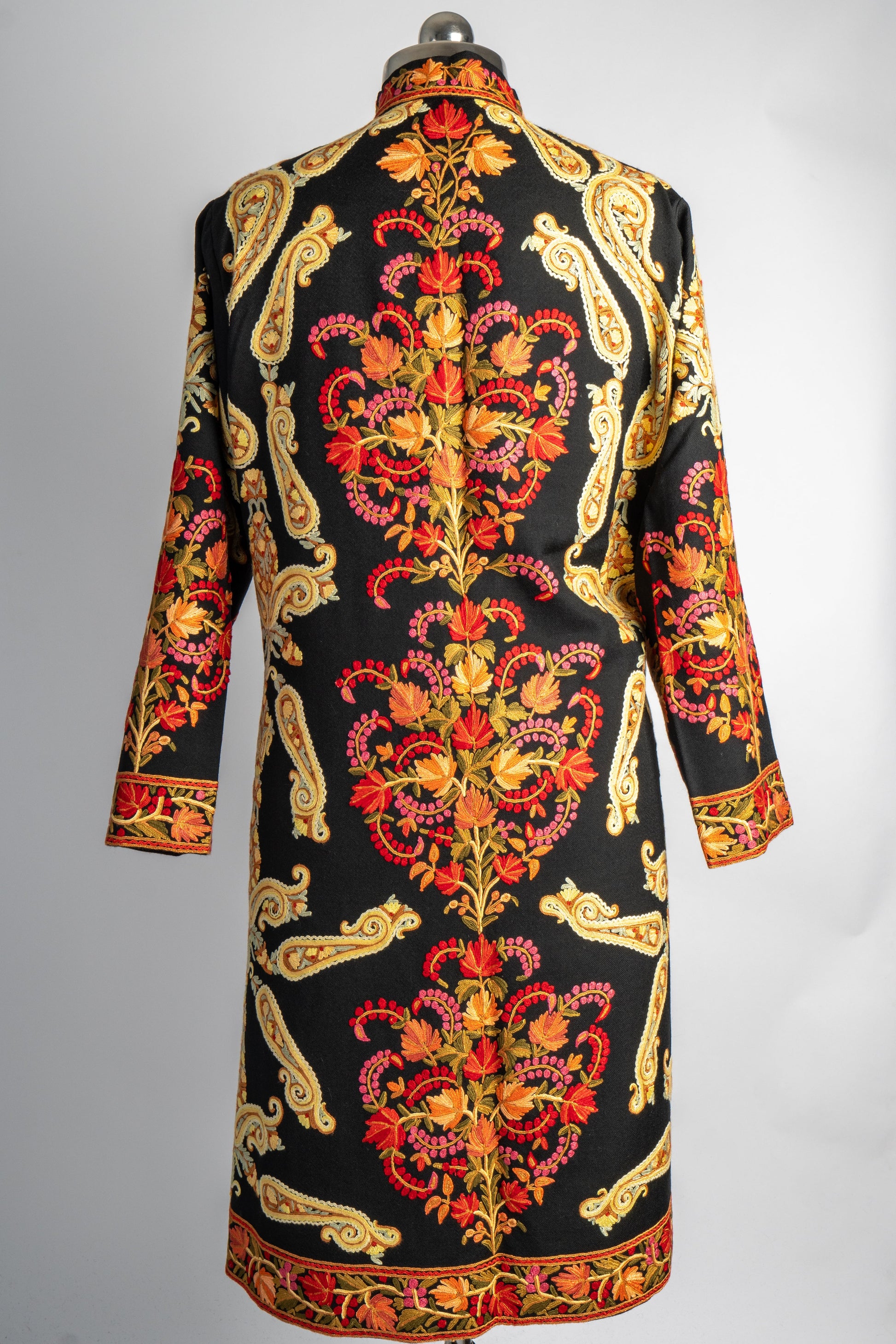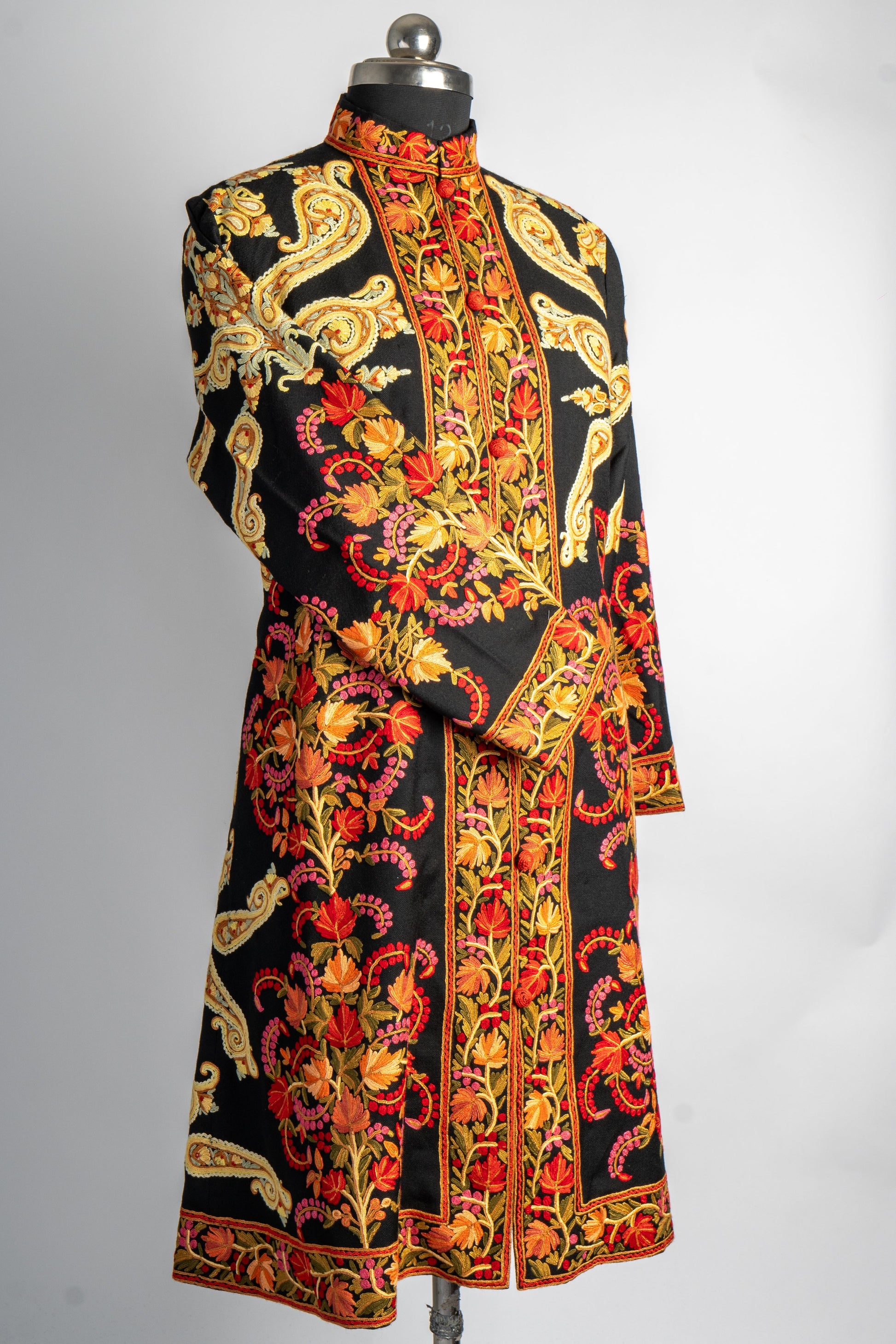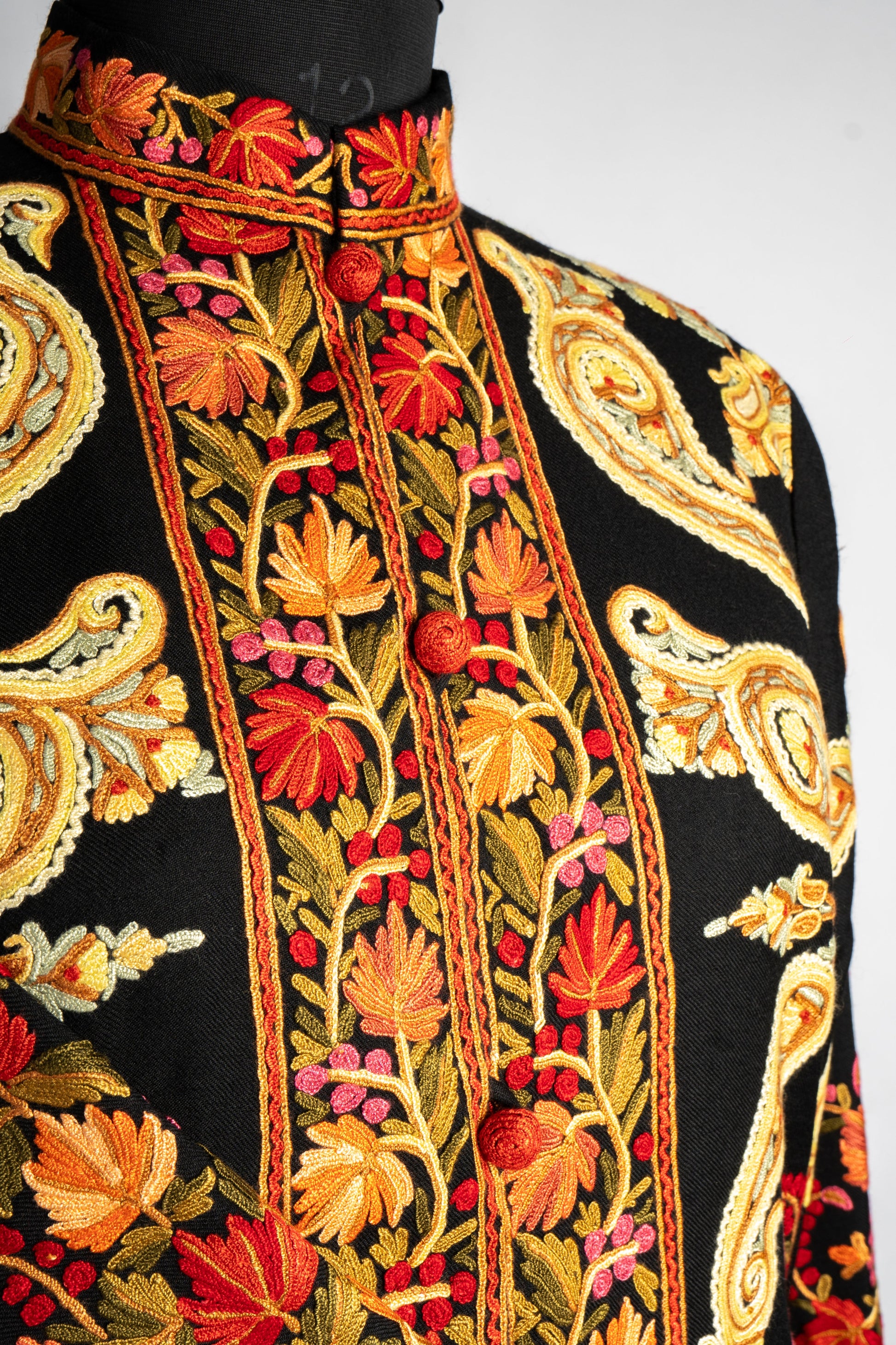 Dramatic and fiery, the Shamsheer Aari Hand Embroidered Jacket captures the boldness of Kashmiri tradition in rich tones of red, orange, and gold. Painstakingly hand-embroidered by skilled artisans, the intricate Aari work flows seamlessly across the jacket, with paisley and floral motifs that tell a story of cultural richness and artistic flair. The black background serves to highlight the warmth of the fiery hues, creating a striking contrast that draws the eye.