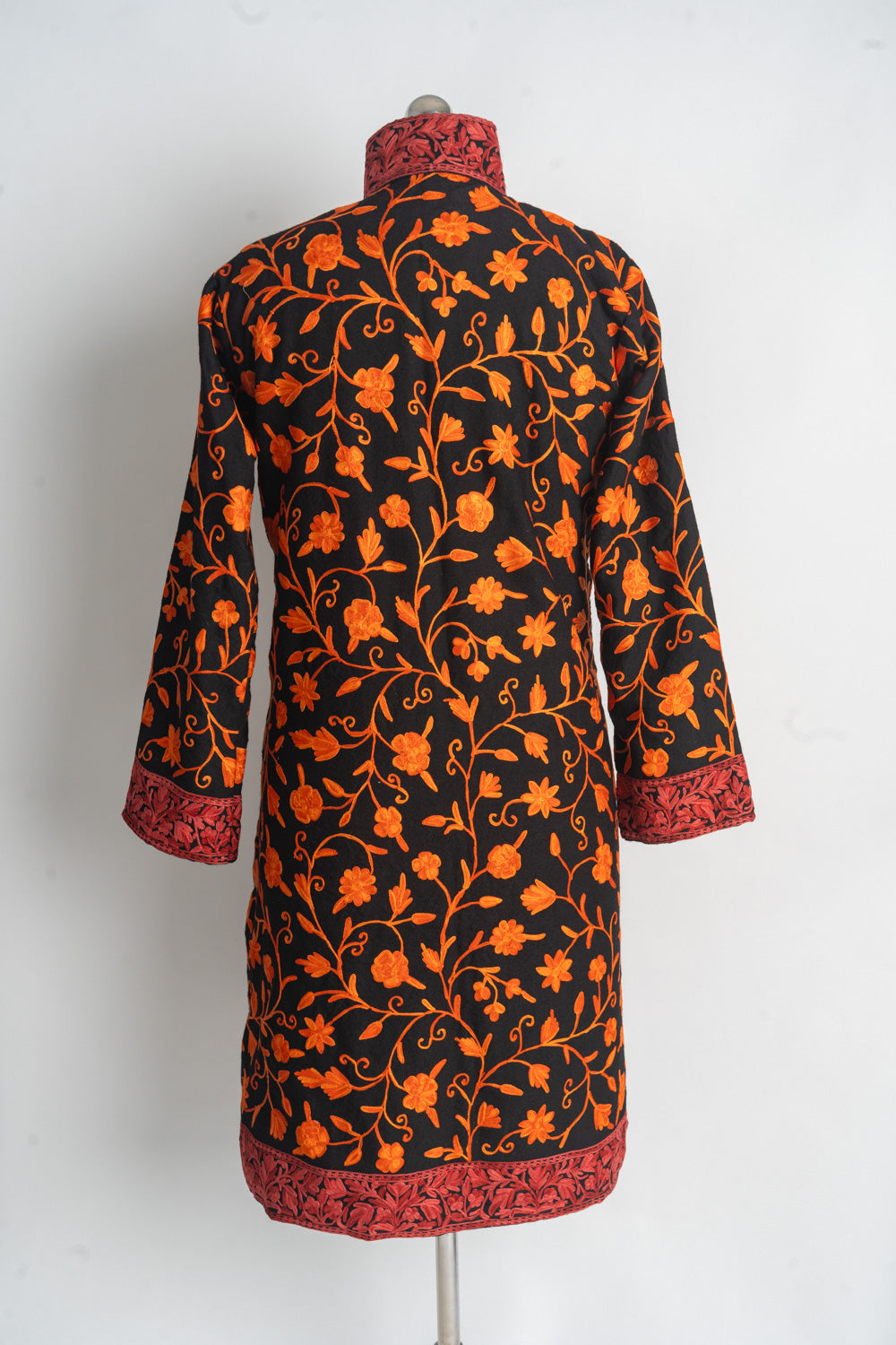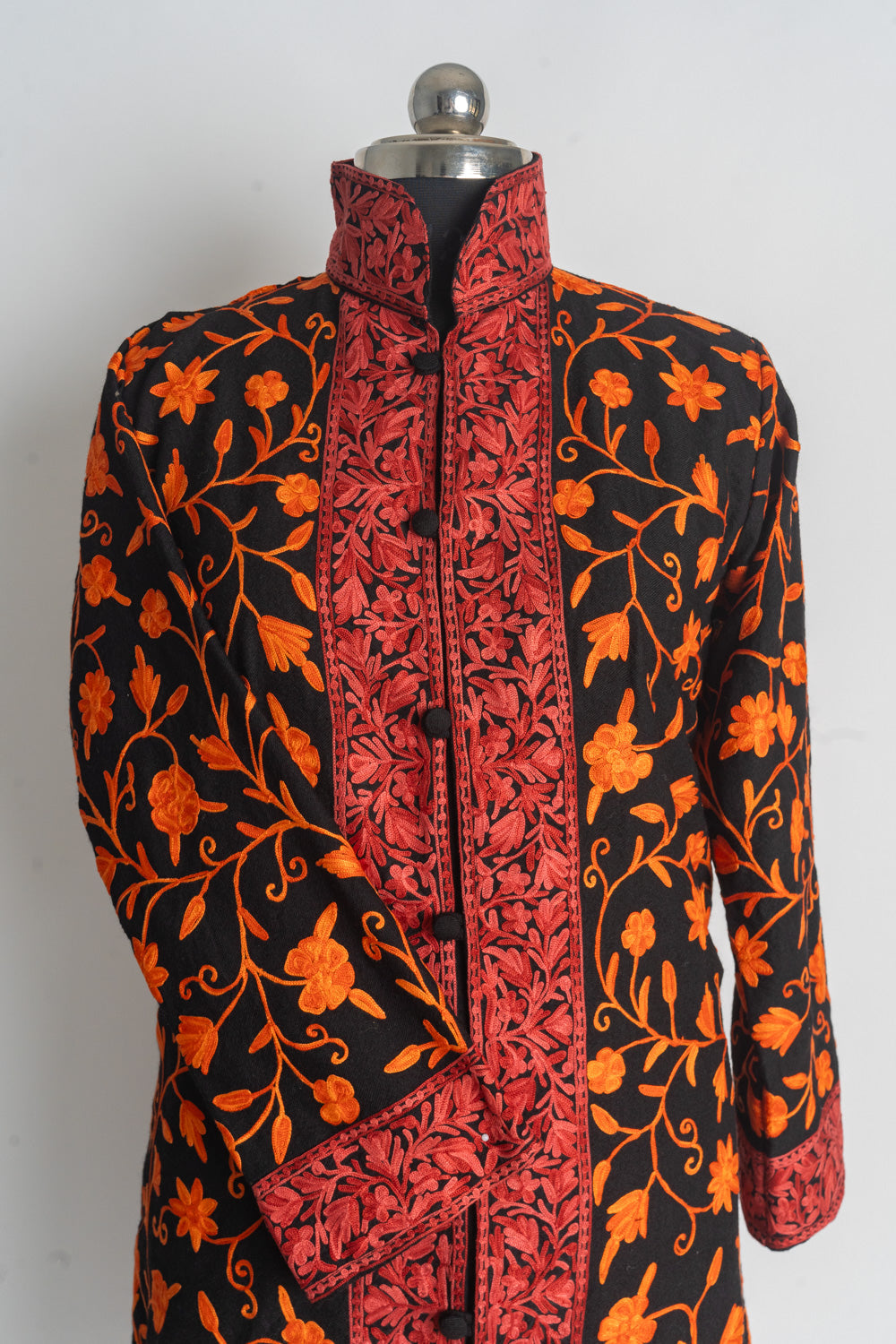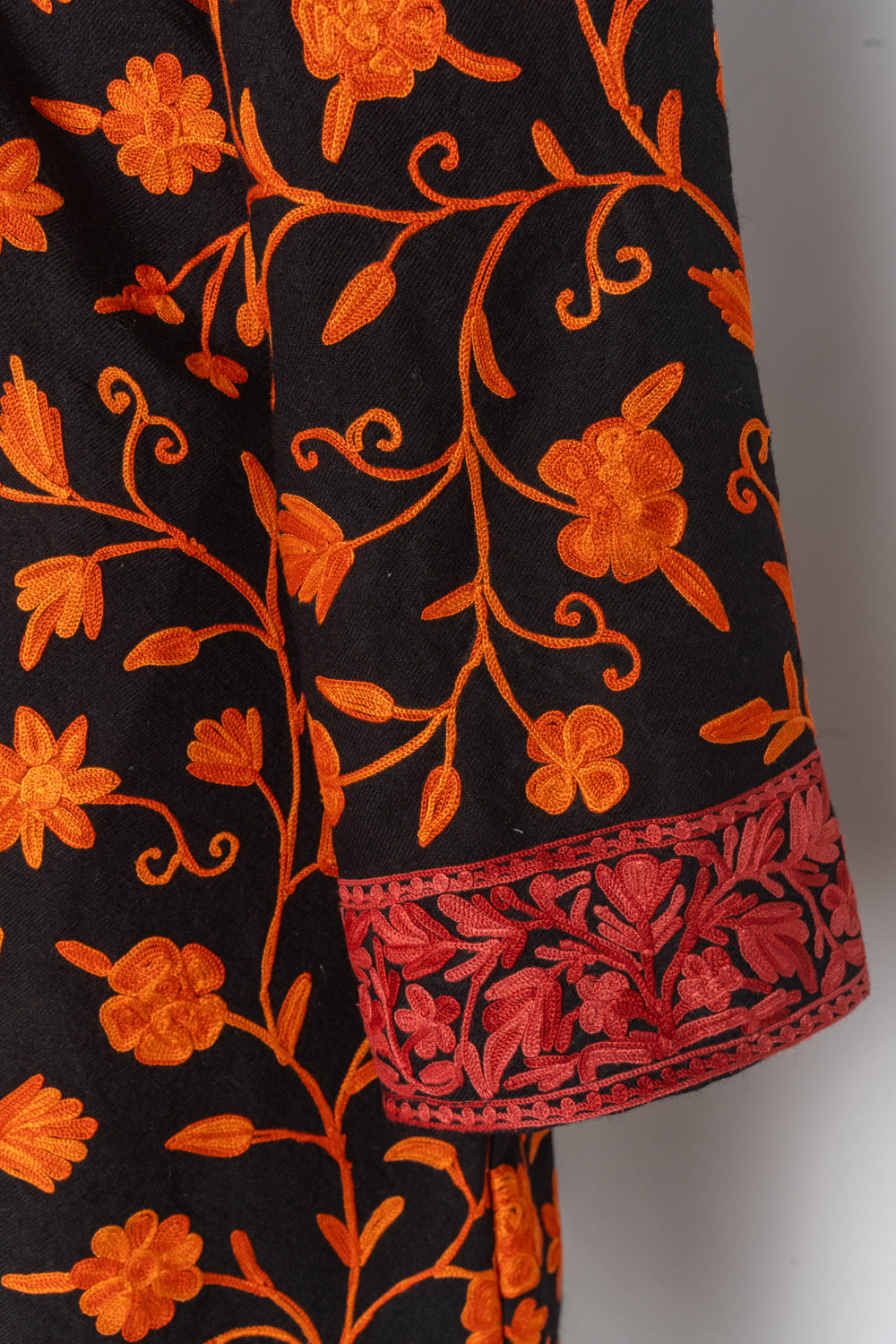 Embrace the vibrant hues of autumn with our Kashmiri Long Jacket, featuring exquisite Aari embroidery in warm, fiery tones. The intricate floral patterns, embroidered with vibrant orange and red threads, create a stunning contrast against the black backdrop. This jacket is a true masterpiece, reflecting the timeless beauty and meticulous craftsmanship of Kashmiri artisans.