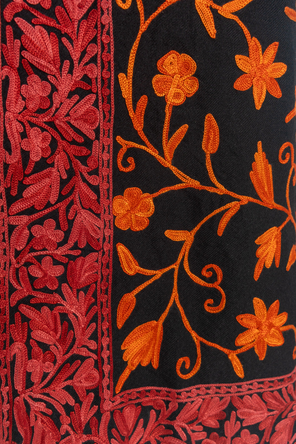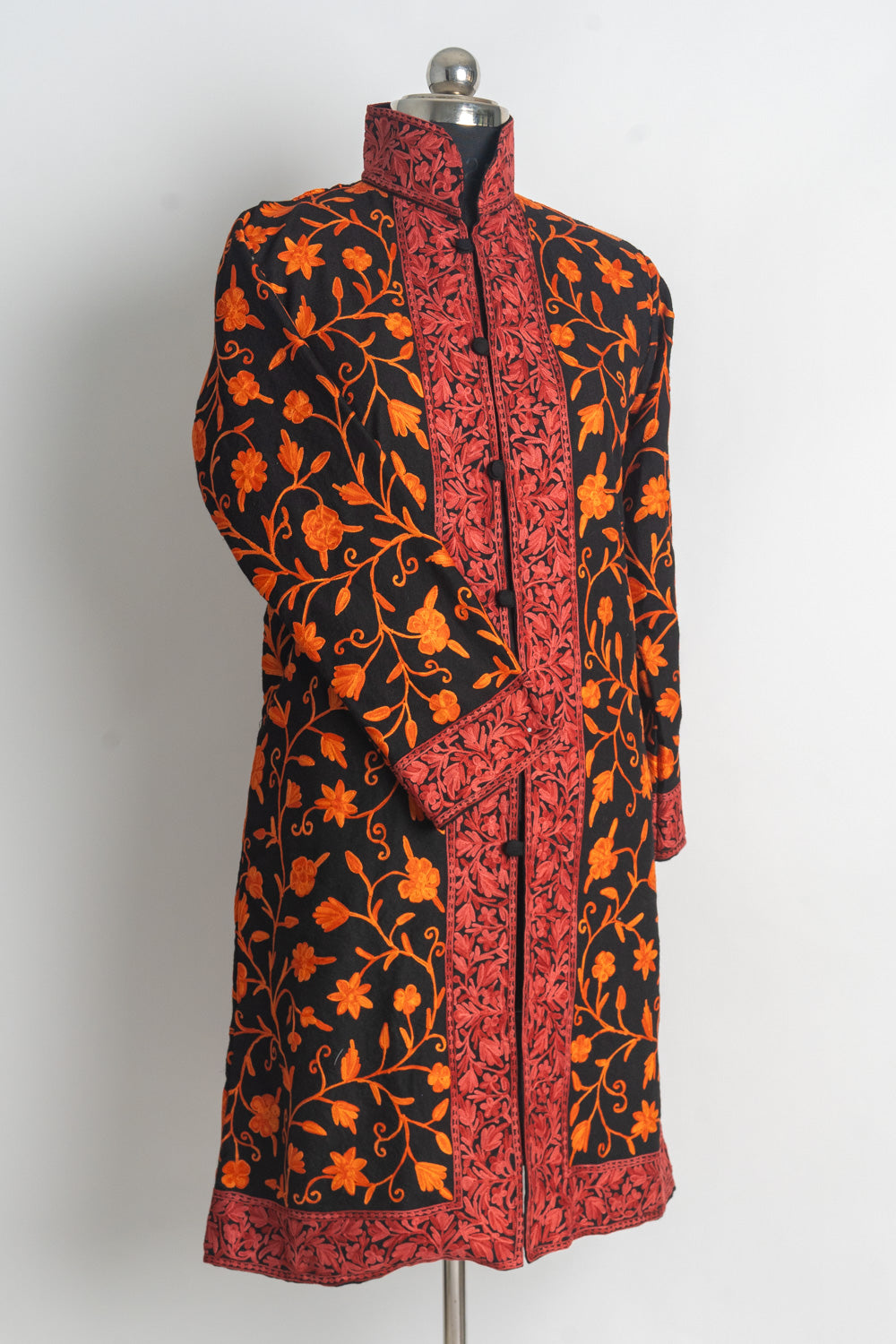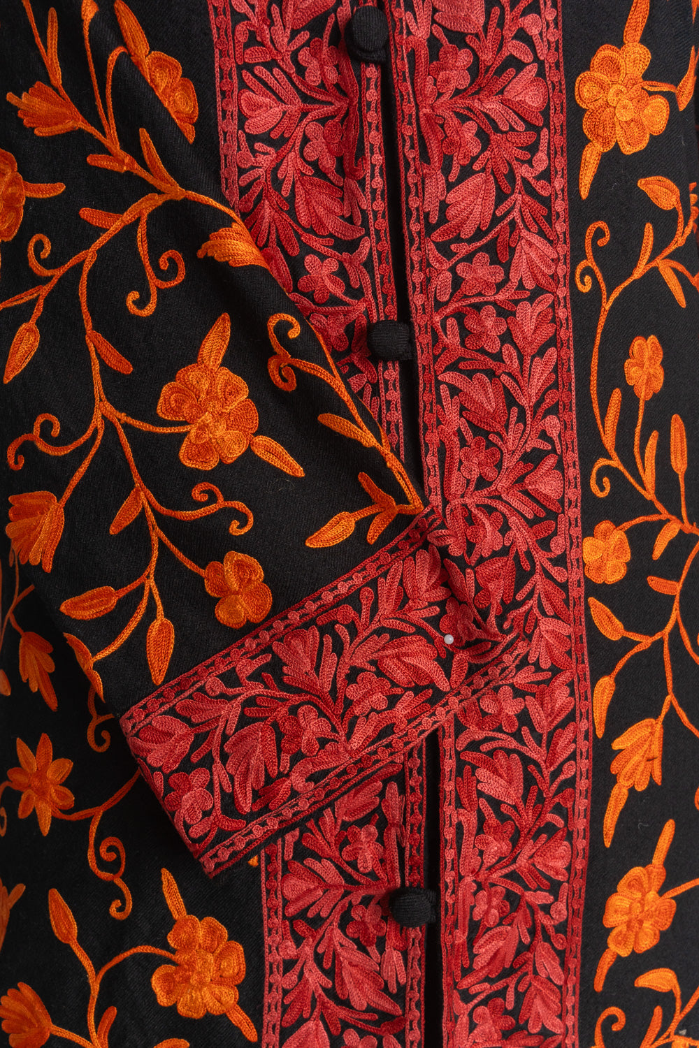Embrace the vibrant hues of autumn with our Kashmiri Long Jacket, featuring exquisite Aari embroidery in warm, fiery tones. The intricate floral patterns, embroidered with vibrant orange and red threads, create a stunning contrast against the black backdrop. This jacket is a true masterpiece, reflecting the timeless beauty and meticulous craftsmanship of Kashmiri artisans.