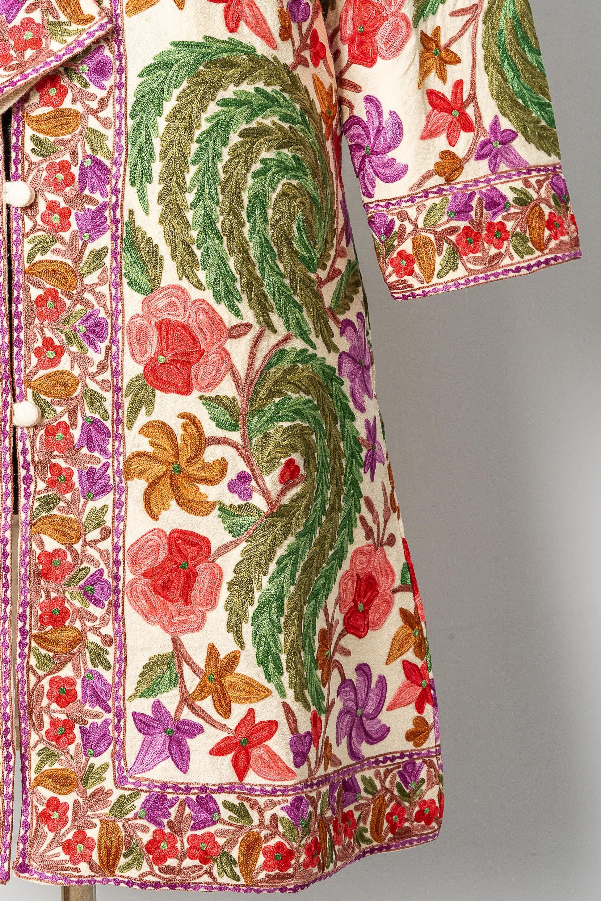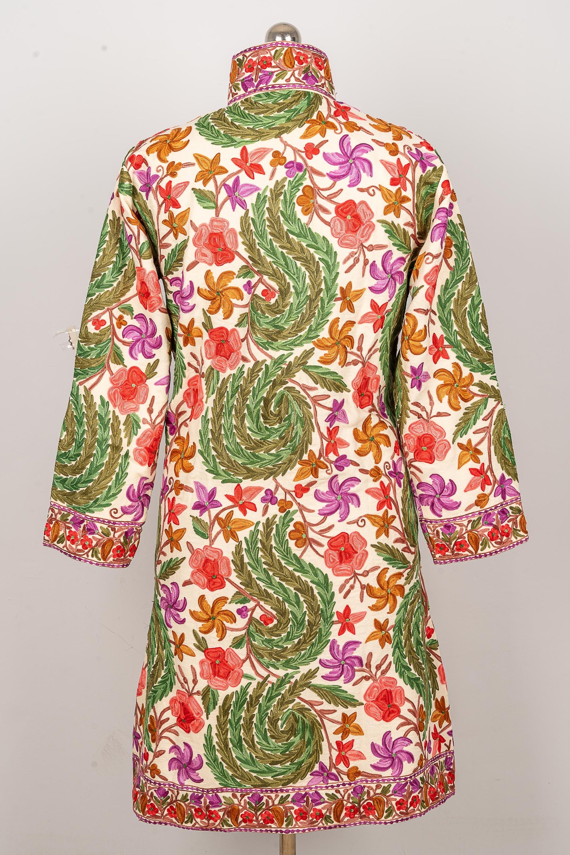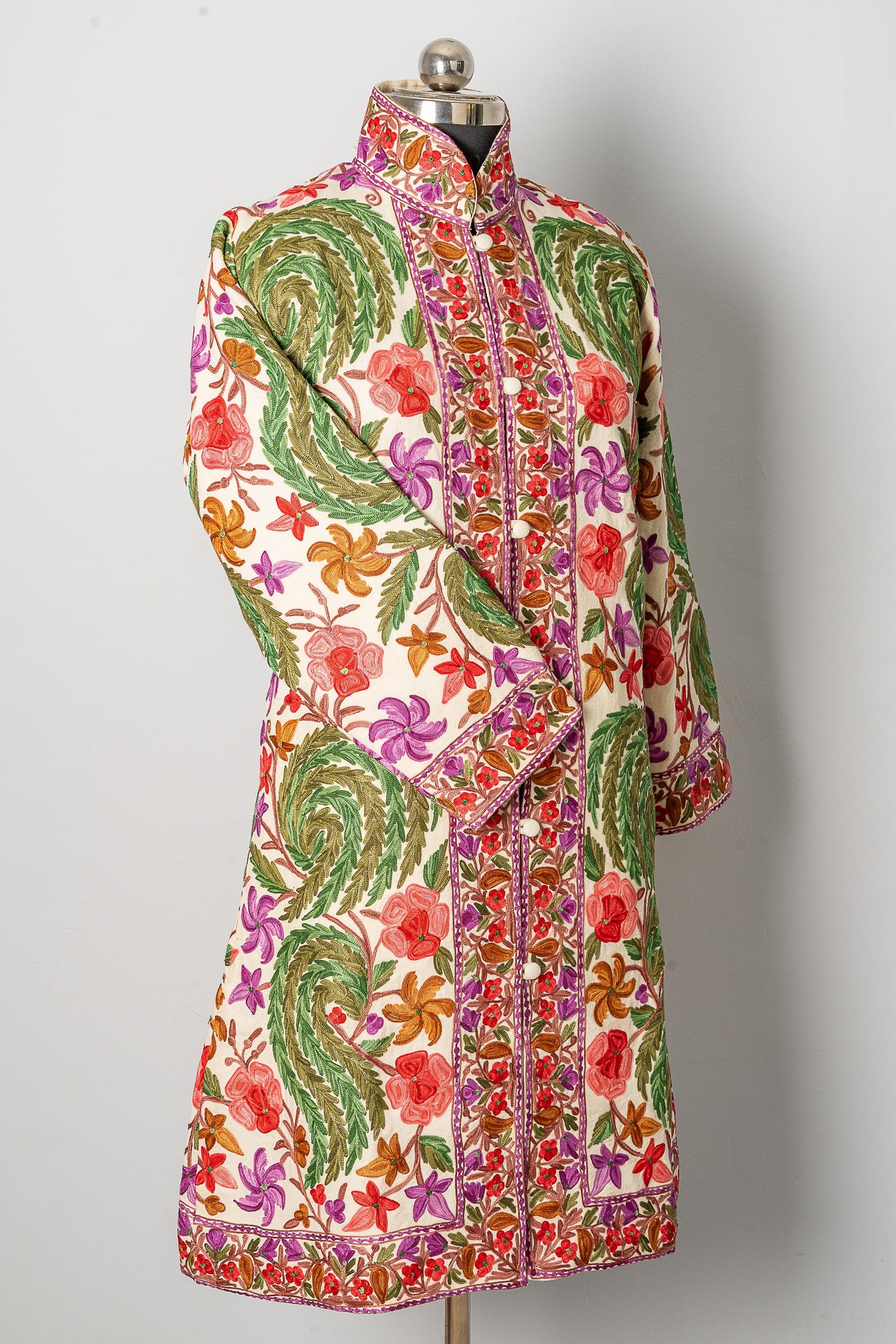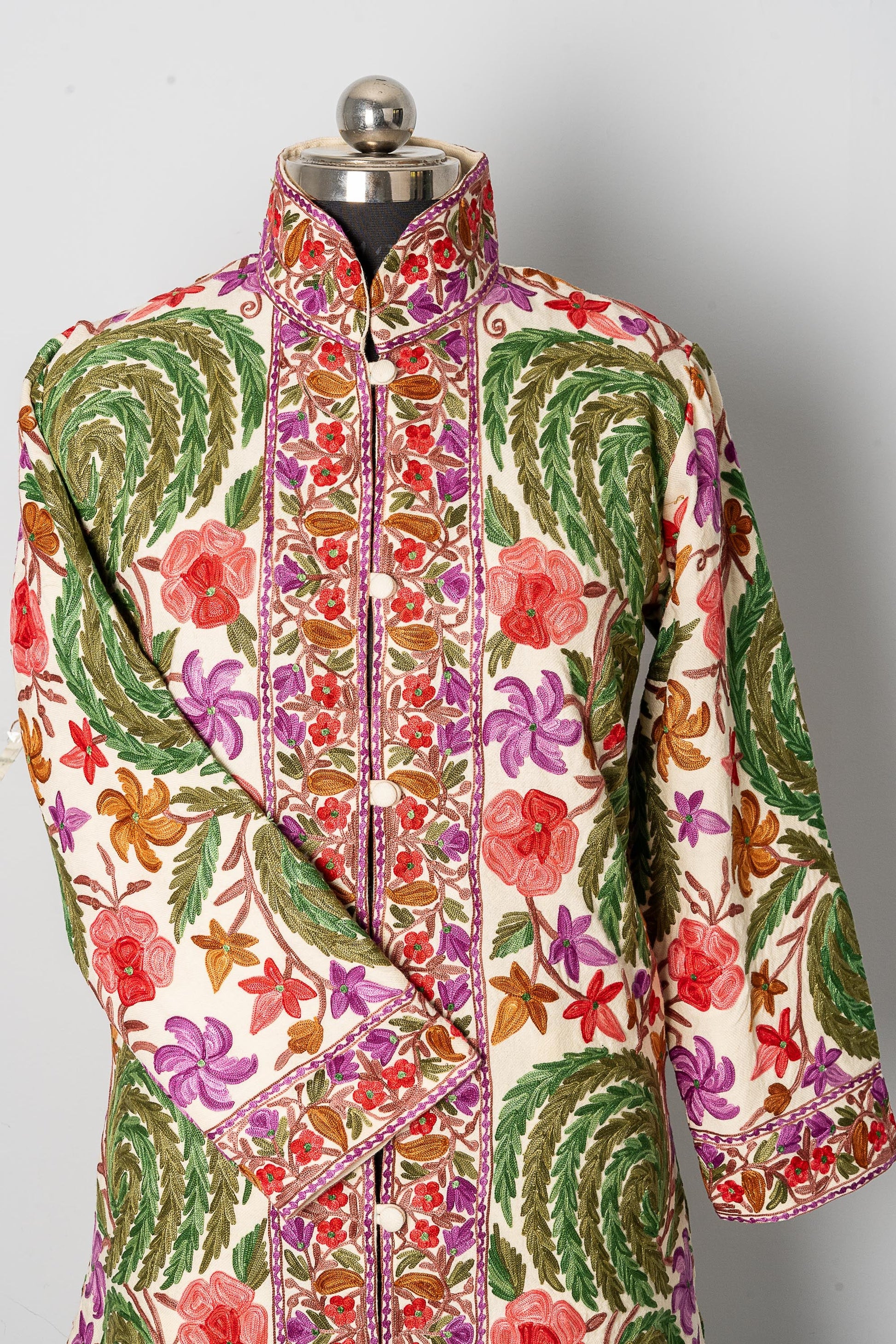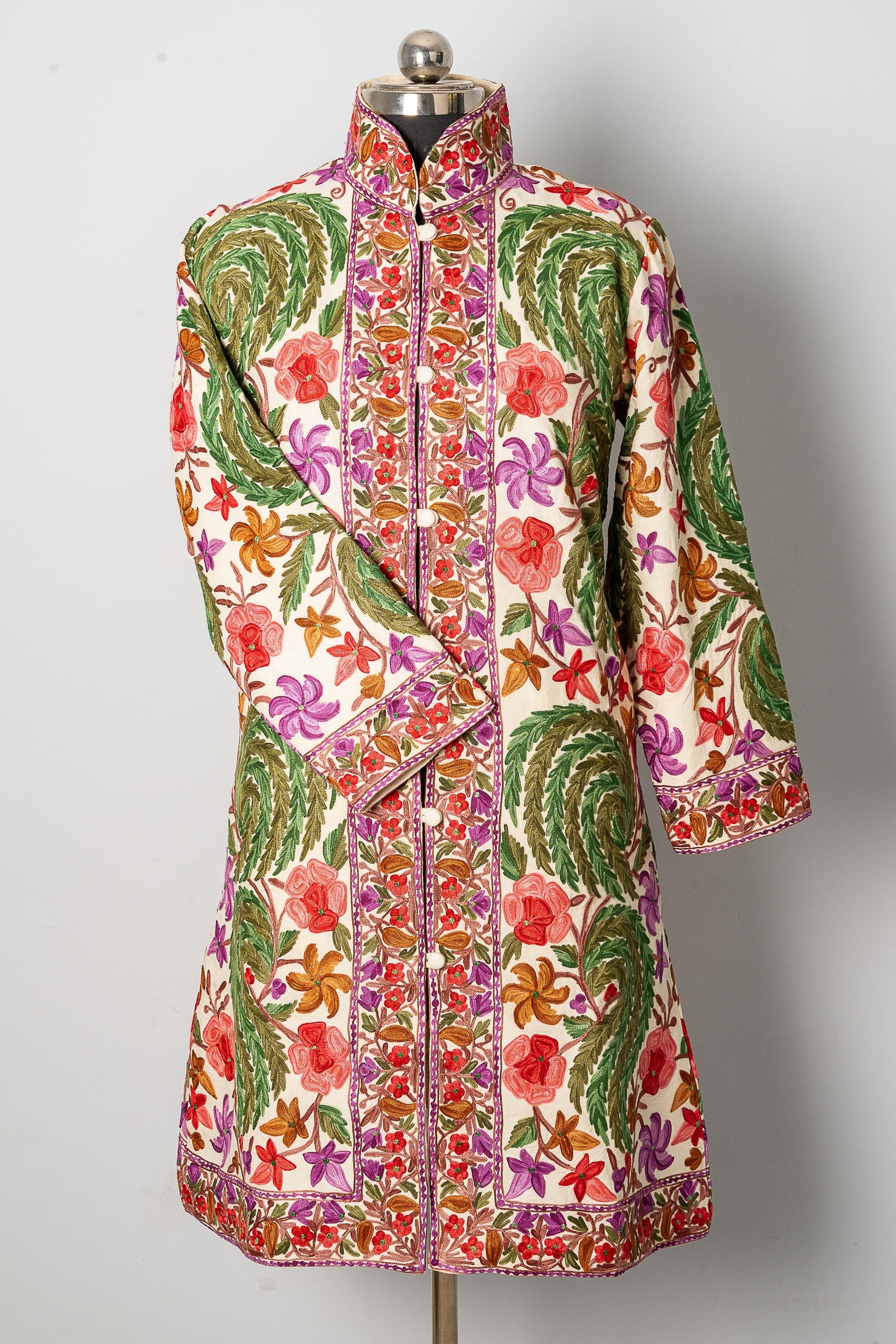 Experience the elegance of KashmKari's Kashmiri jacket, where every stitch captures the essence of Kashmir's enchanting beauty. This pristine white jacket, made even more captivating with multicoloured Aari embroidery, showcases intricate floral designs splashed with vibrant shades of purple, green, and red. Whether you're attending a daytime event or a serene evening soiree, this jacket is a harmonious blend of tradition and style, ensuring you stand out with a touch of Kashmiri artistry.